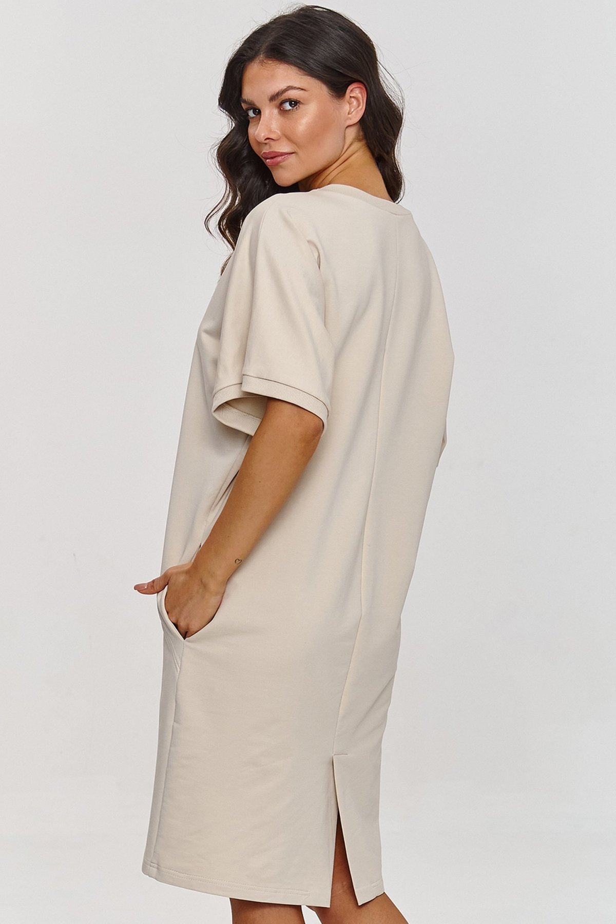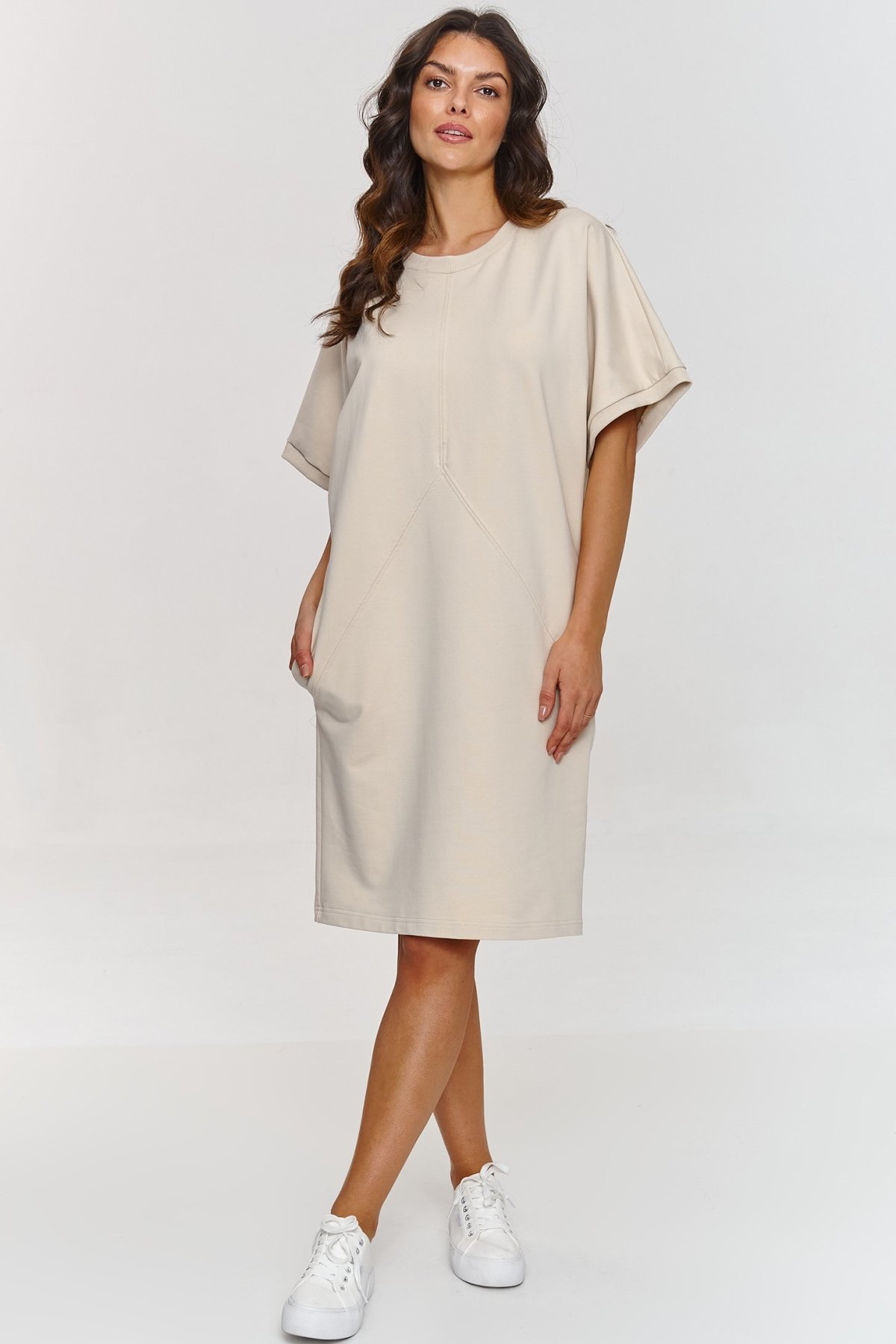 Lehkost, pohodlí a jednoduchá elegance. Právě to vystihuje šaty Makadamia M864 ve světle béžové barvě. Volný střih zajišťuje maximální komfort, zatímco krátké, široké rukávy dodávají celkovému vzhledu moderní, ležérní akcent. Kulatý výstřih působí jemně a elegantně, prošívání na přední části opticky prodlužuje postavu. Díky bočním kapsám si šaty zachovávají praktický charakter, aniž by ztratily svůj minimalistický styl.