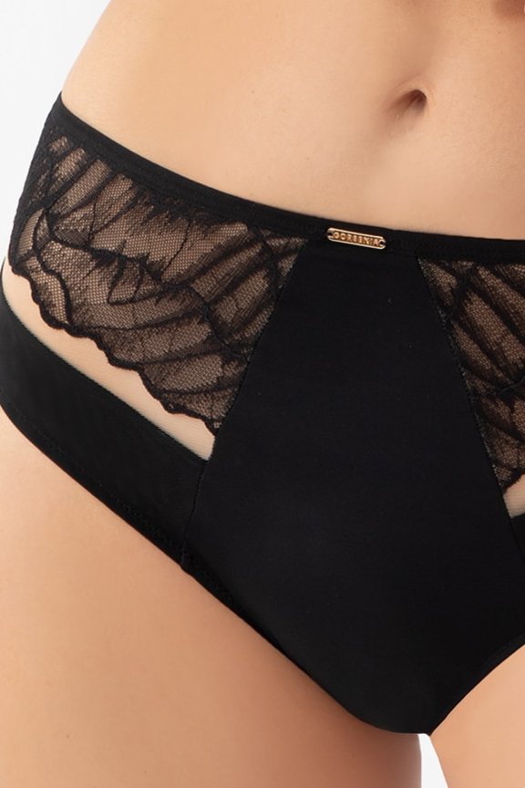 Dámské kalhotky brazilského střihu Celia. Dokonale vyvážené spojení klasické elegance a moderní smyslnosti. Model v černém provedení je ušit z hladkého mikrovlákna doplněného pružným tylem a jemnou krajkou. Brazilský střih krásně zvýrazní linii zadečku, zakončení krajkou na zadní části se nerýsuje pod oblečením. Kovové detaily ve zlatém tónu dodávají modelu luxusní nádech. Samozřejmostí je bavlněný klínek.