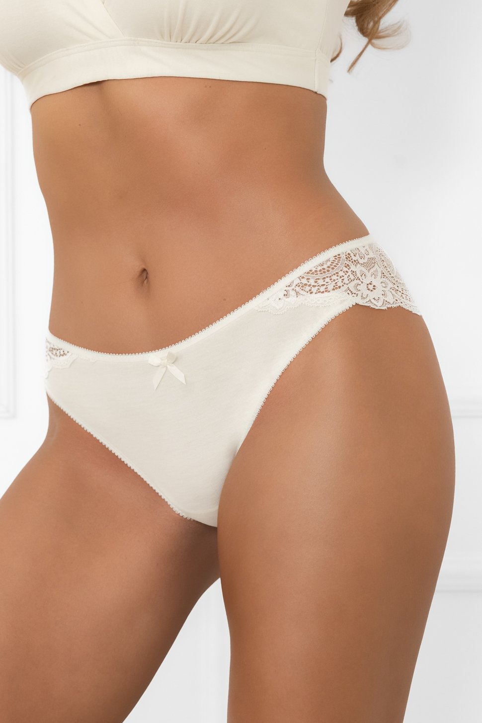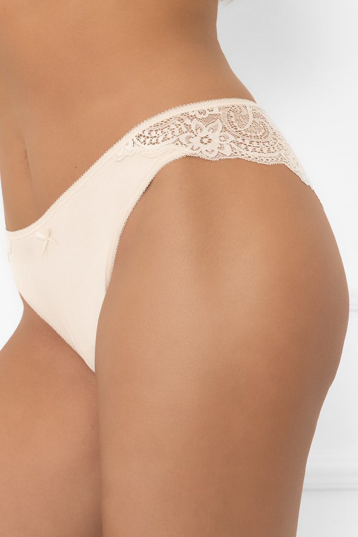 Dámské brazilky Soler podtrhující ženskou eleganci. Přední část je hladká, doplněná pouze drobnou mašličkou v pase. Zadní díl z průhledné krajky dodává modelu smyslný charakter a střih brazilek decentně odhaluje linie hýždí. Díky měkké viskóze se kalhotky perfektně přizpůsobí postavě a poskytují příjemný pocit po celý den. Skvěle se hodí pod šaty, legíny či jiné přiléhavé oblečení, kde zůstávají neviditelné a zároveň působí elegantně.
