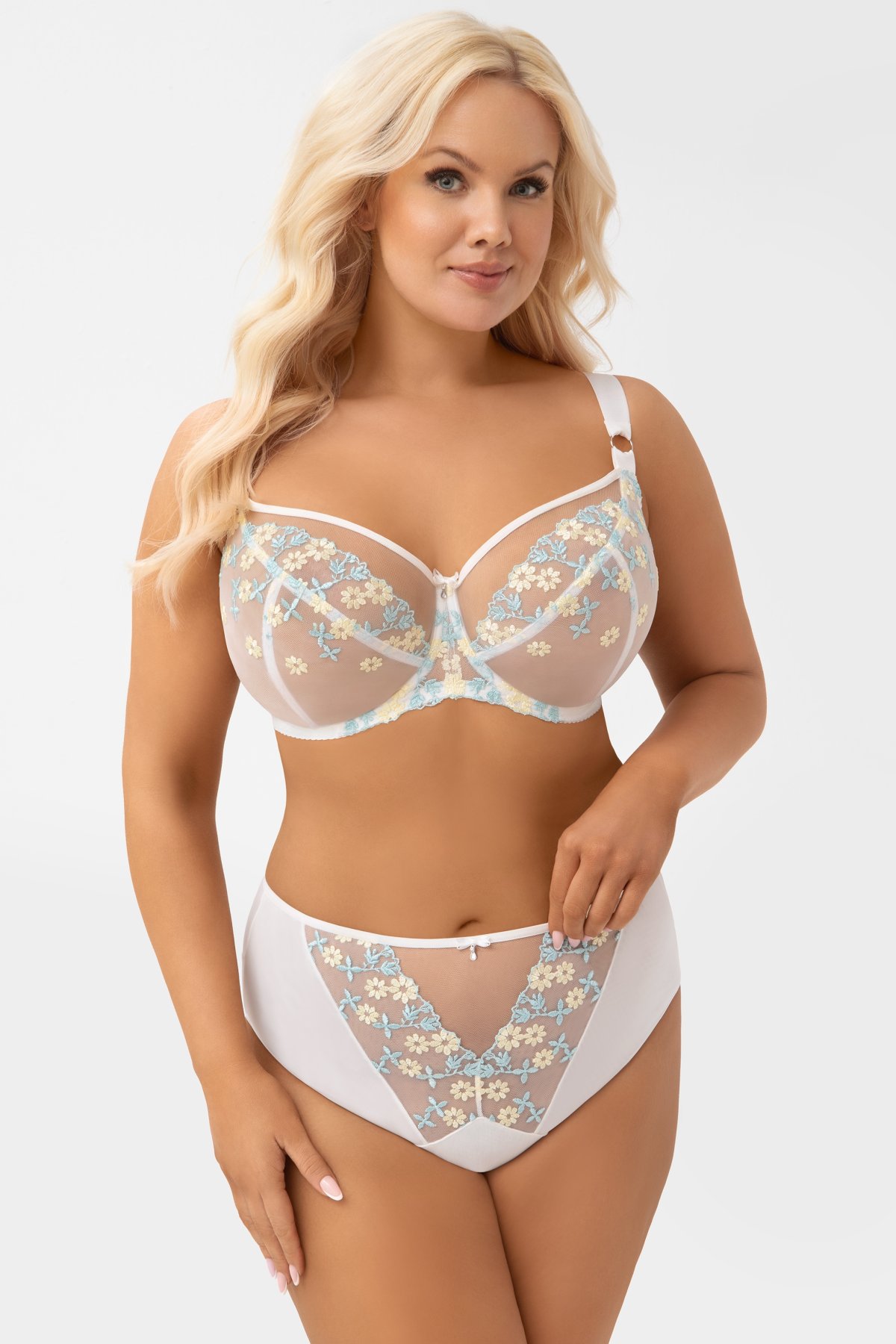 Středně vysoký pas příjemně sedí, střih odhaluje a zvýrazňuje hýždě, takže model působí lehce a žensky. Přední část zdobí výšivka podšitá tylem, která dodává kalhotkám výraznější vzhled a zároveň drží tvar. Zadní díl z elastického tylu je hladce zakončený, aby se kalhotky méně rýsovaly pod oblečením. Komfort při nošení podporuje i prodloužený bavlněný klínek. Kovové prvky jsou ve stříbrné barvě a neobsahují nikl.