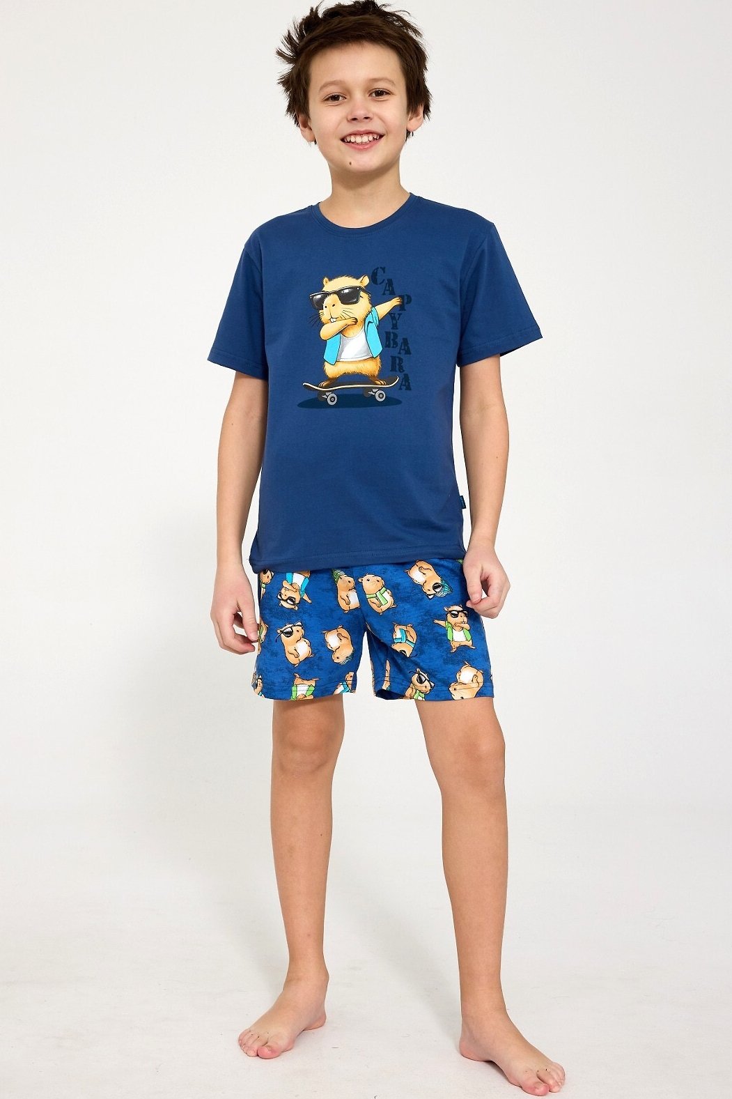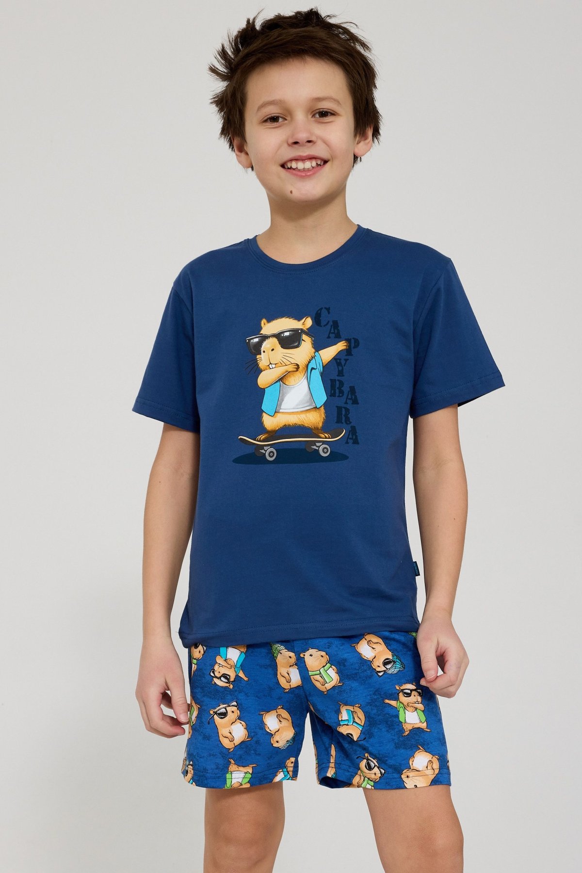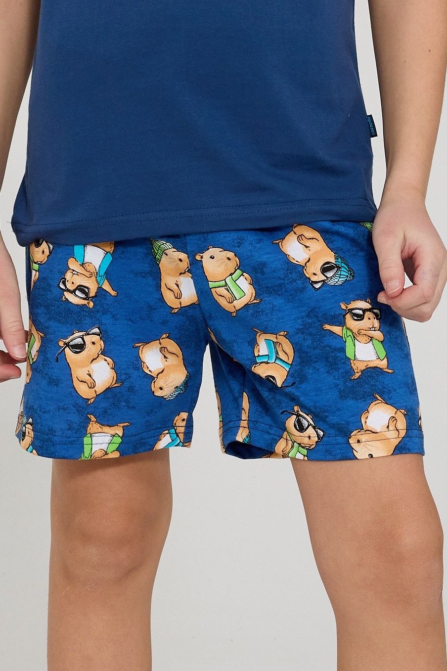 Chlapecké pyžamo Capybara 2 zaujme na první pohled svým veselým designem a pohodlným střihem. Modré tričko s krátkým rukávem zdobí barevný potisk s oblíbeným motivem kapybar, který si malí dobrodruzi zamilují. K tomu ladí krátké šortky s výrazným vzorem, které zaručují volnost pohybu a komfort při spánku i domácím odpočinku. Pyžamo je vyrobené z měkké bavlny, která je prodyšná, hebká a šetrná k dětské pokožce. Díky balení v krabičce se skvěle hodí také jako praktický a milý dárek pro chlapce, kteří mají rádi pohodlí i zábavný styl.