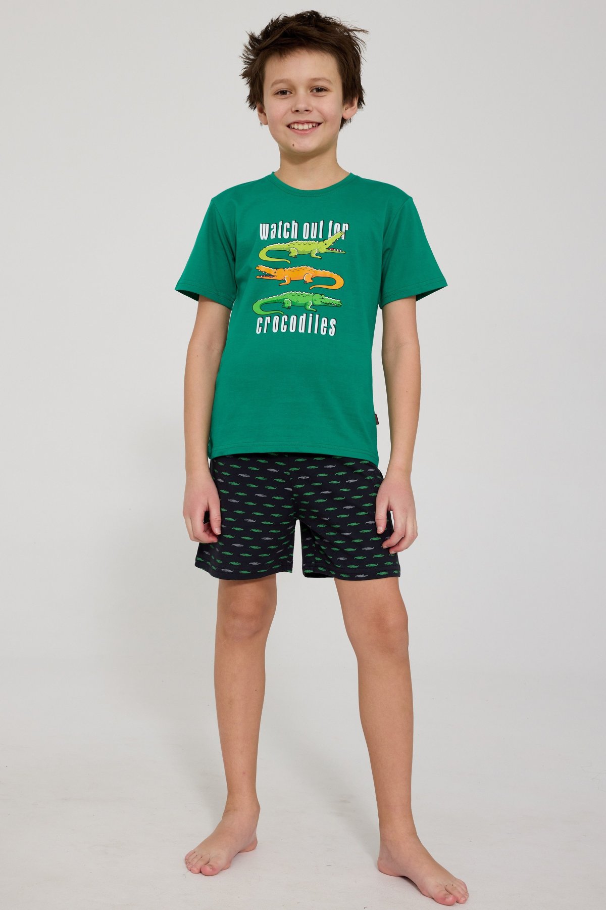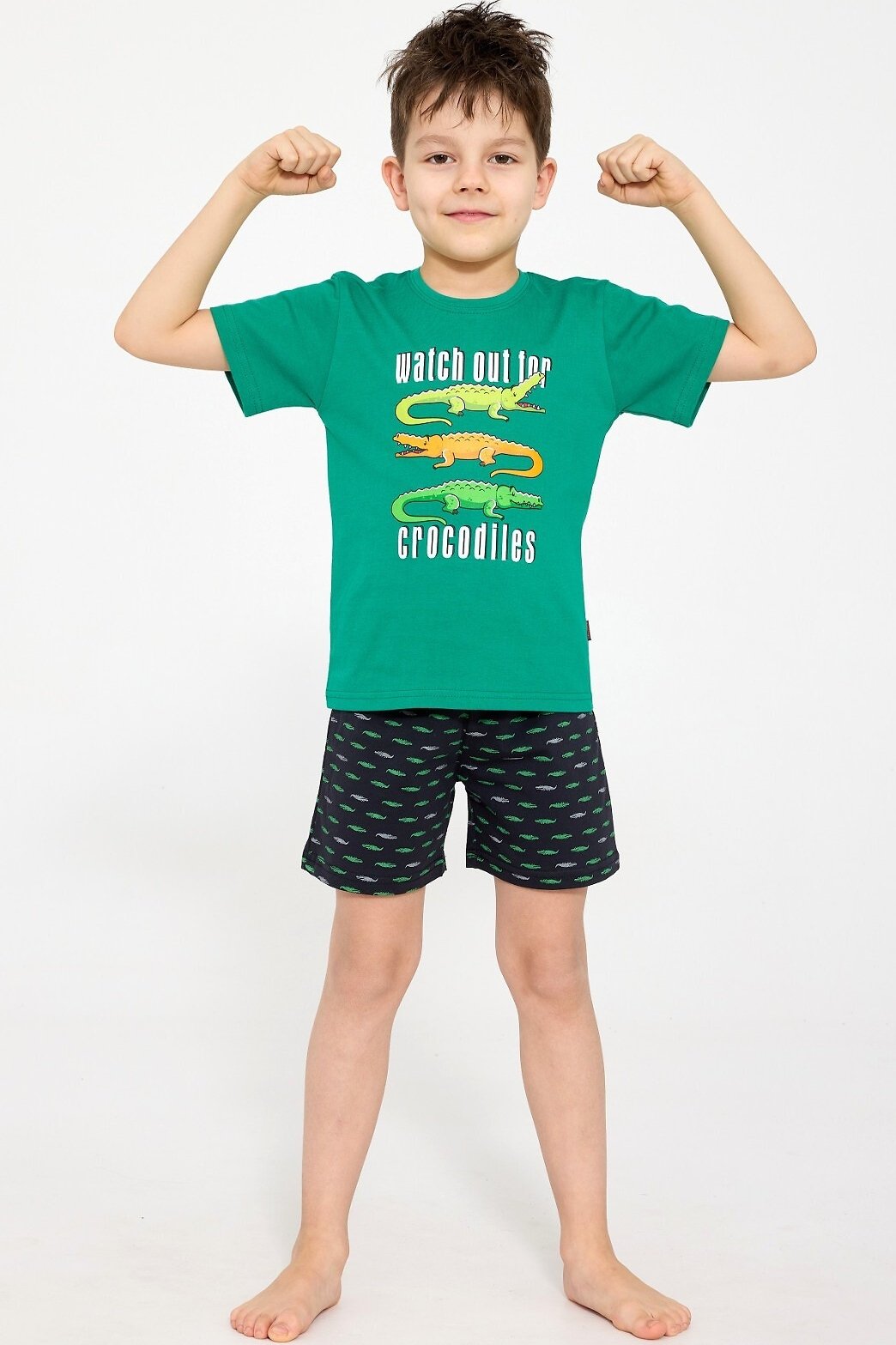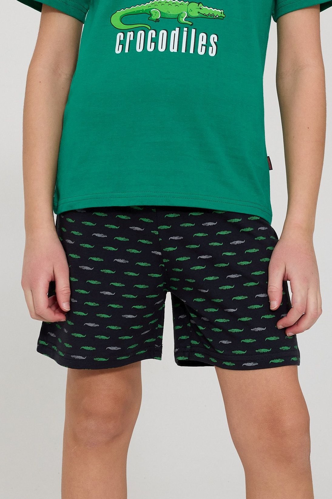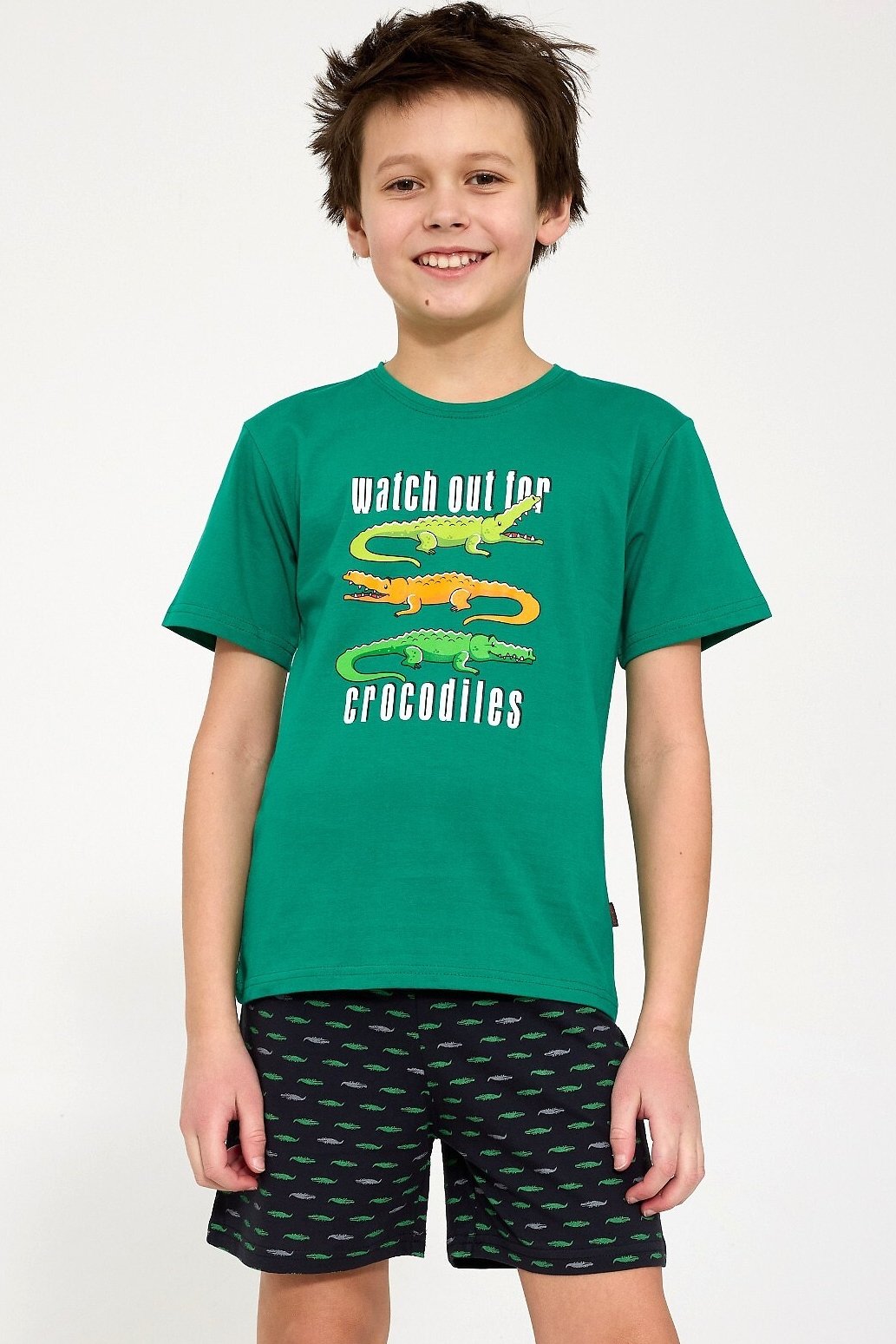 Tričko s krátkým rukávem zdobí barevný potisk s motivem krokodýlů, který zaručeně rozveselí každý večer. Kraťasy s hravým vzorem doplňují celý komplet a díky volnému střihu neomezují v pohybu.
