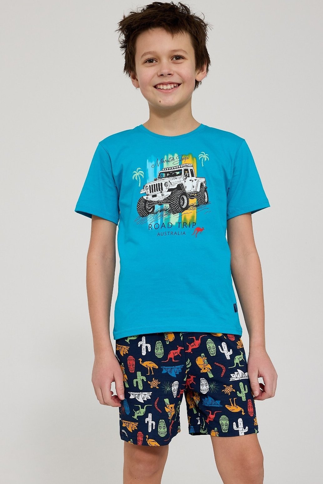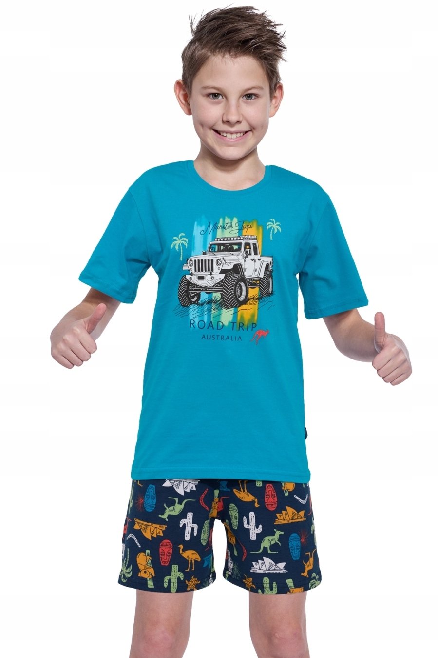 Chlapecké pyžamo Road Trip potěší všechny malé dobrodruhy, kteří rádi sní o dalekých cestách. Pohodlné tričko s krátkým rukávem a barevným potiskem navozuje veselou atmosféru, vzorované kraťasy dodávají celku stylový vzhled. Díky měkké a prodyšné bavlně je pyžamo velmi příjemné na dotek a zajišťuje komfort během celé noci. Příměs elastanu v šortkách zaručuje volnost pohybu, takže se v něm bude skvěle spát i lenošit. Pyžamo Road Trip je navíc baleno v elegantní krabičce – ideální i jako milý dárek.