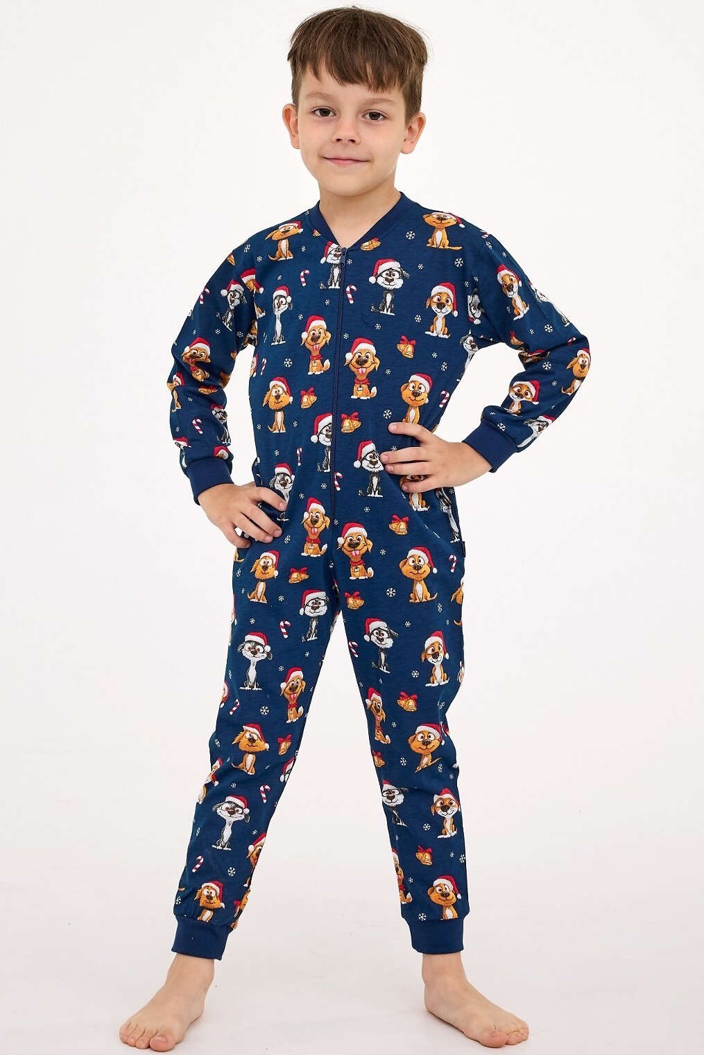 Měkká bavlna je šetrná k pokožce a poskytuje pocit tepla a komfortu. Barevný motiv se psíky působí vesele a zaručeně potěší každého malého milovníka zvířat. Díky zapínání na zip je oblékání i svlékání rychlé a snadné, což ocení děti i rodiče. Praktické kapsy po stranách dodávají overalu pohodlný a funkční charakter, zatímco pružné manžety a náplety u nohavic zajišťují, že vše zůstane na svém místě i při pohybu. Skvělá volba na spaní i domácí pohodu během svátků.