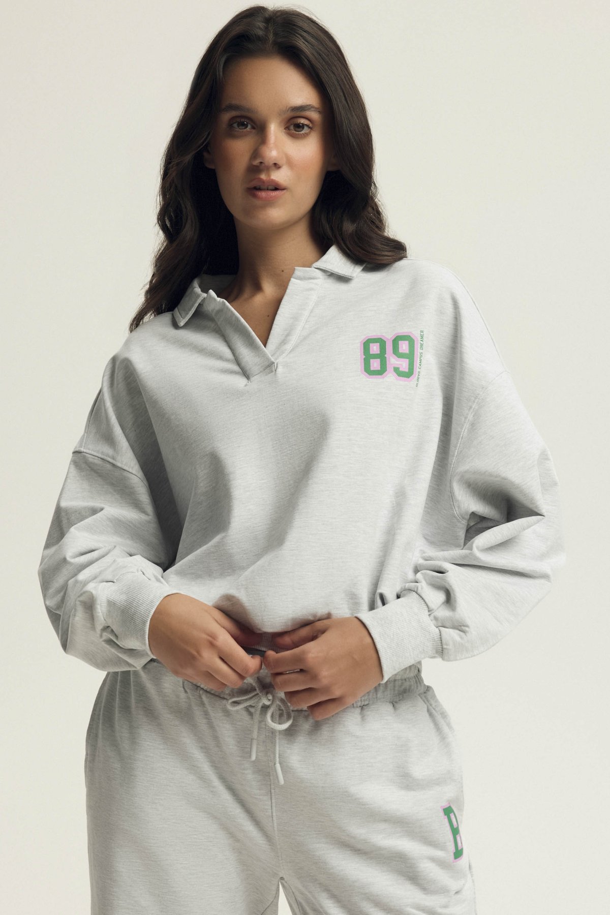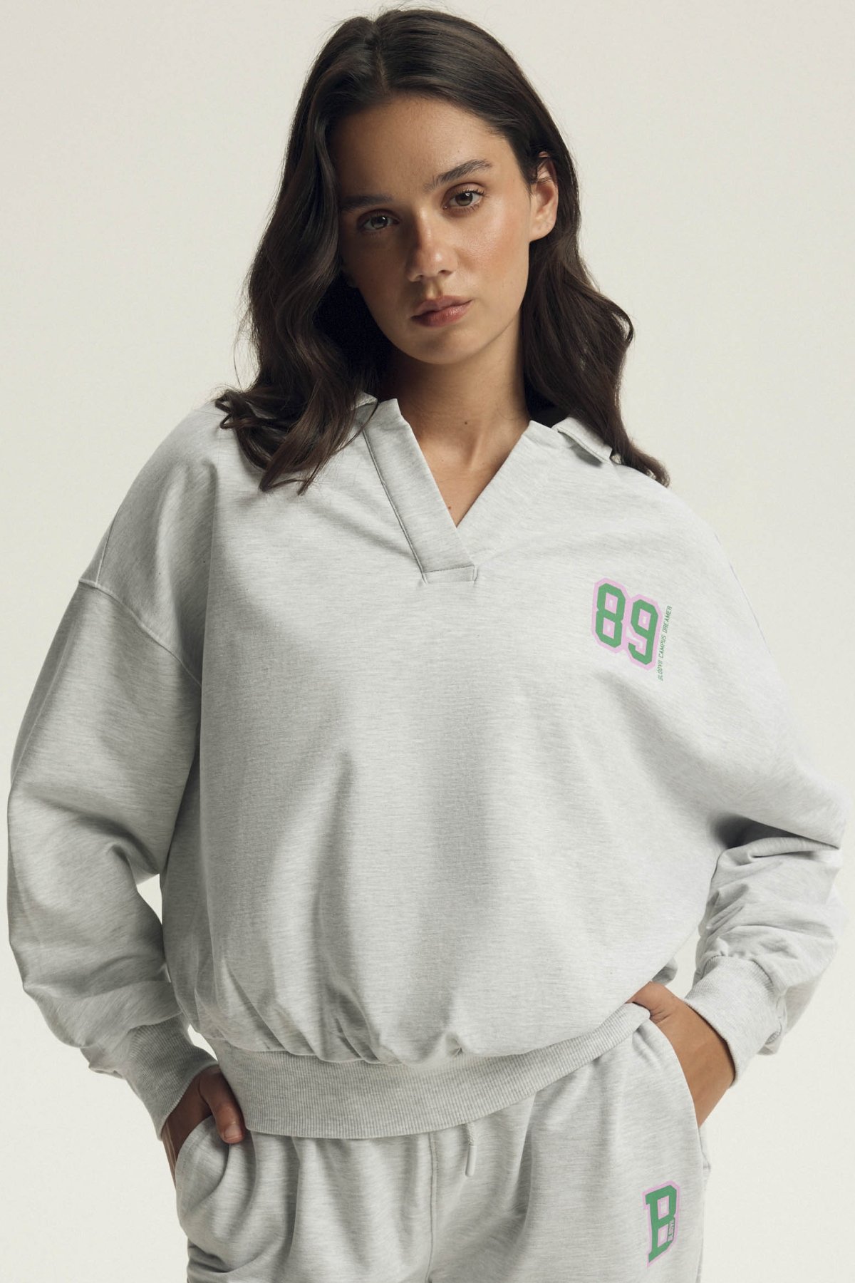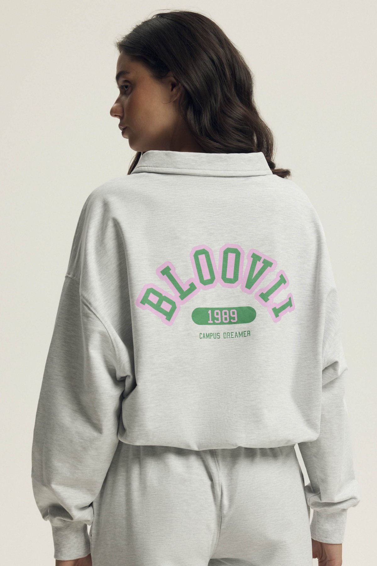 Dámská mikina Kayci v šedém odstínu zaujme svým univerzitním stylem a ležérní elegancí. Díky měkké bavlněné směsi a volnému střihu nabízí maximální komfort při každodenním nošení. Límec polo dodává modelu originální, retro nádech, zatímco výrazný potisk na zádech přináší mladistvou energii.