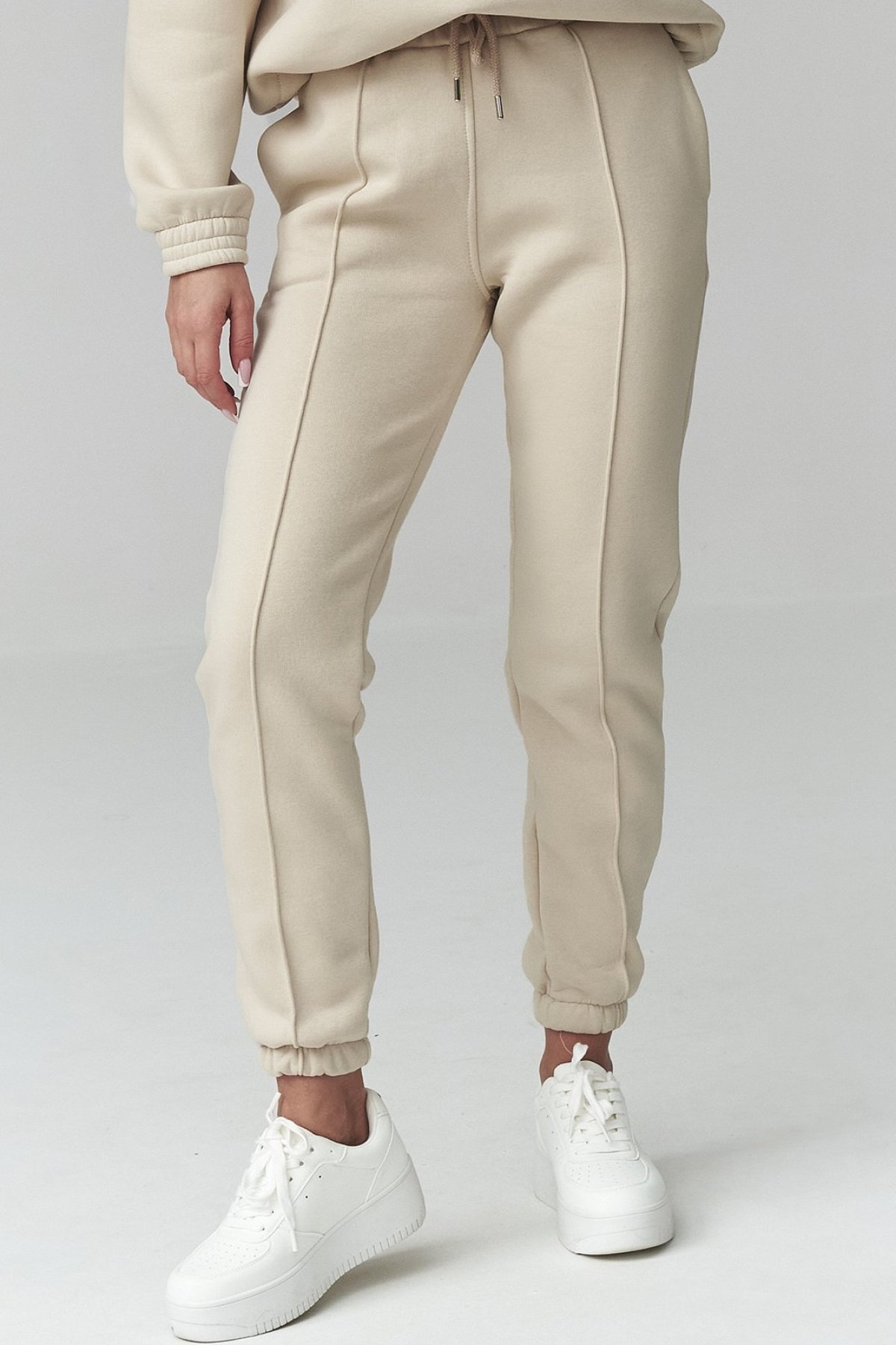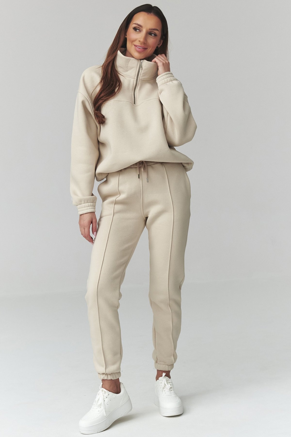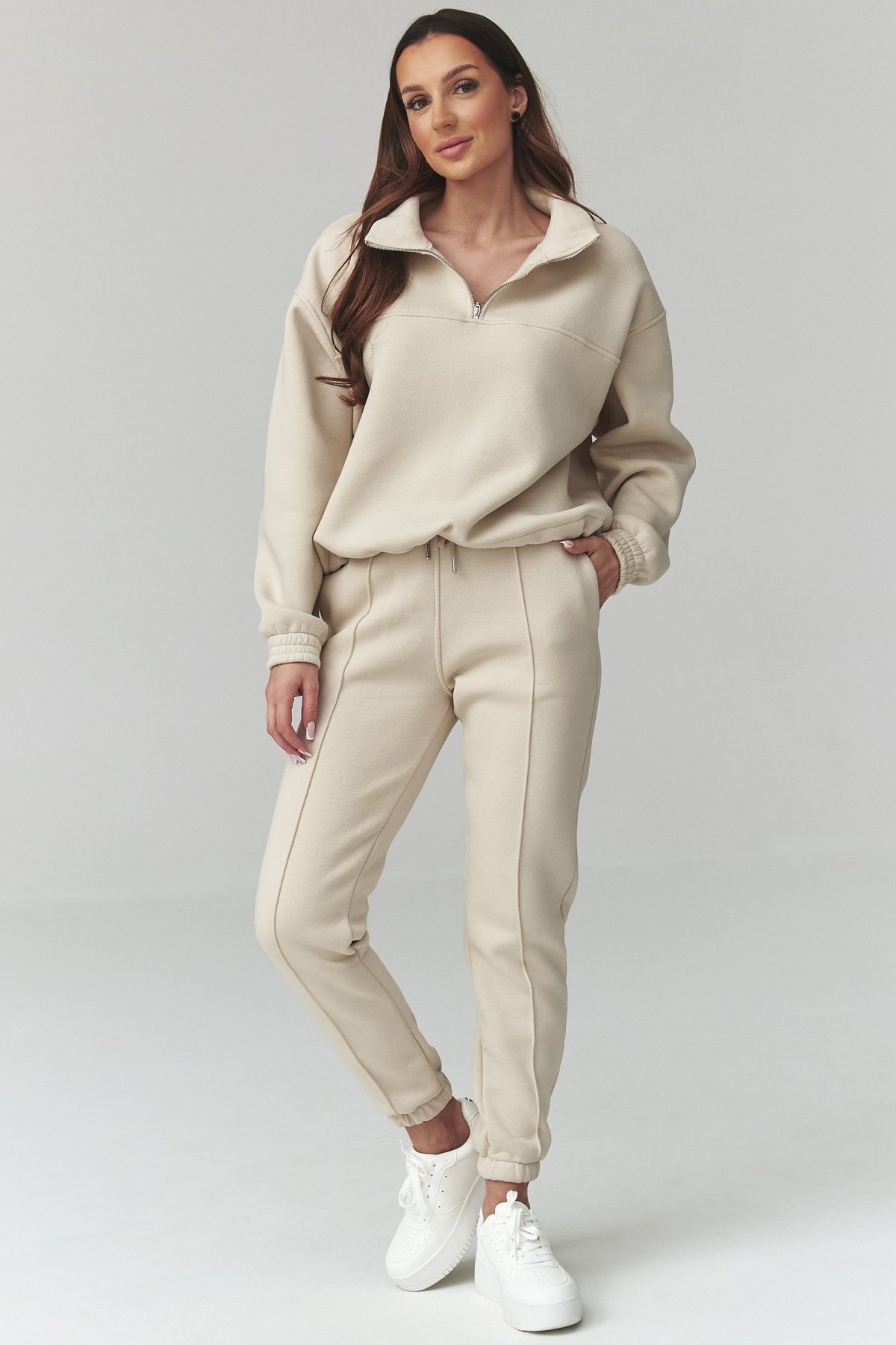 Dámská souprava světle béžové barvy spojuje pohodlný střih a čistý, městský vzhled.