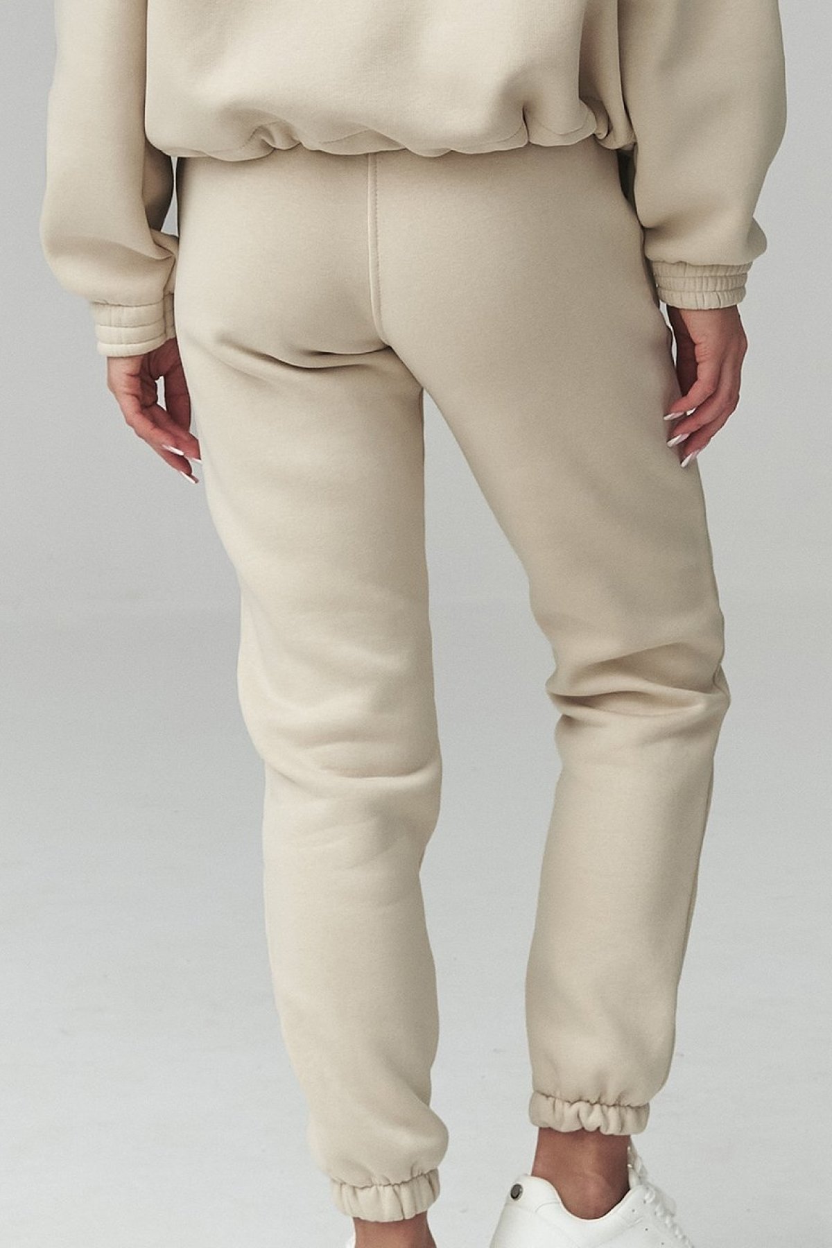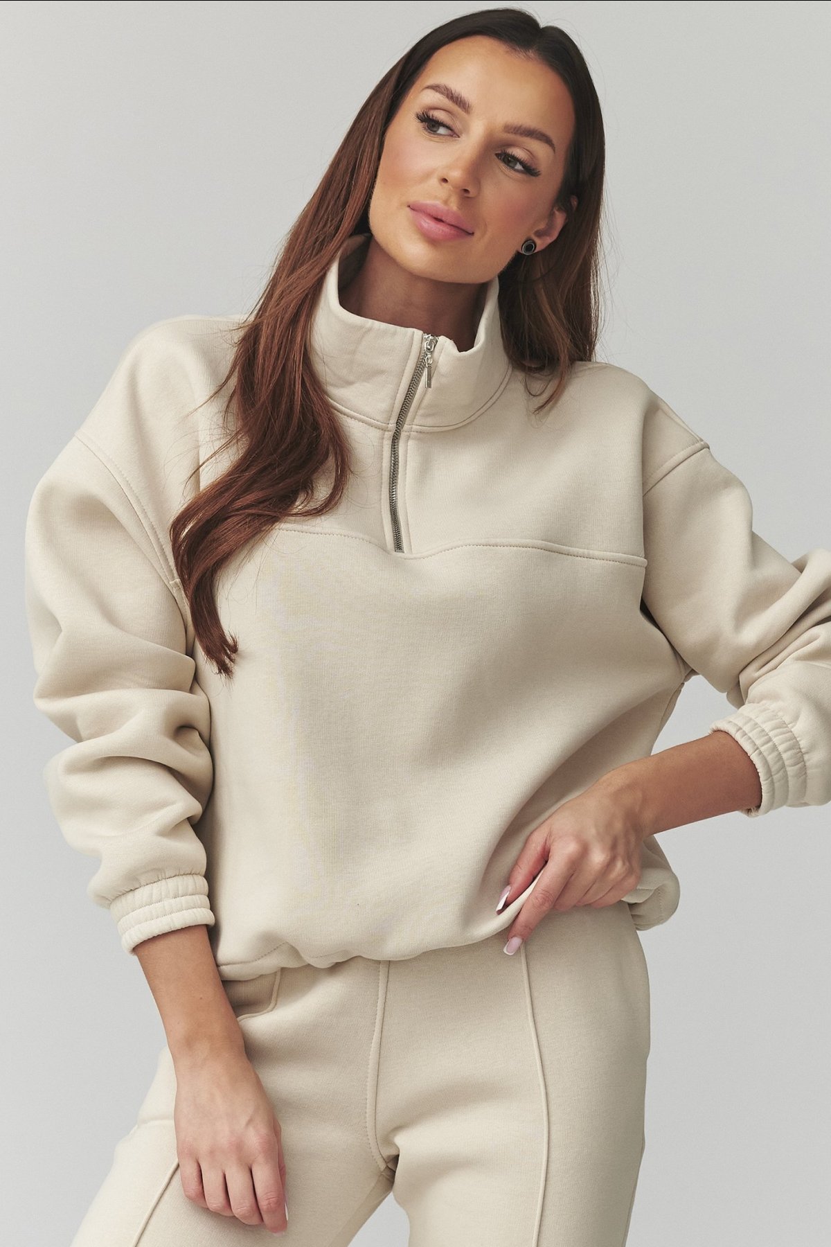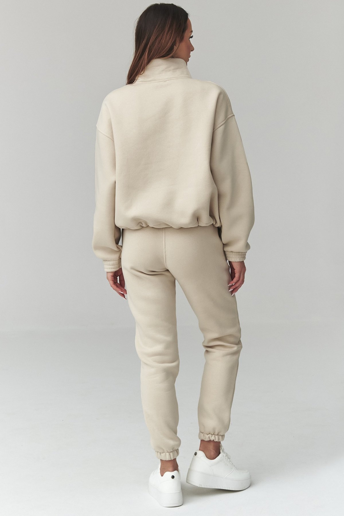 Dámská souprava světle béžové barvy spojuje pohodlný střih a čistý, městský vzhled.