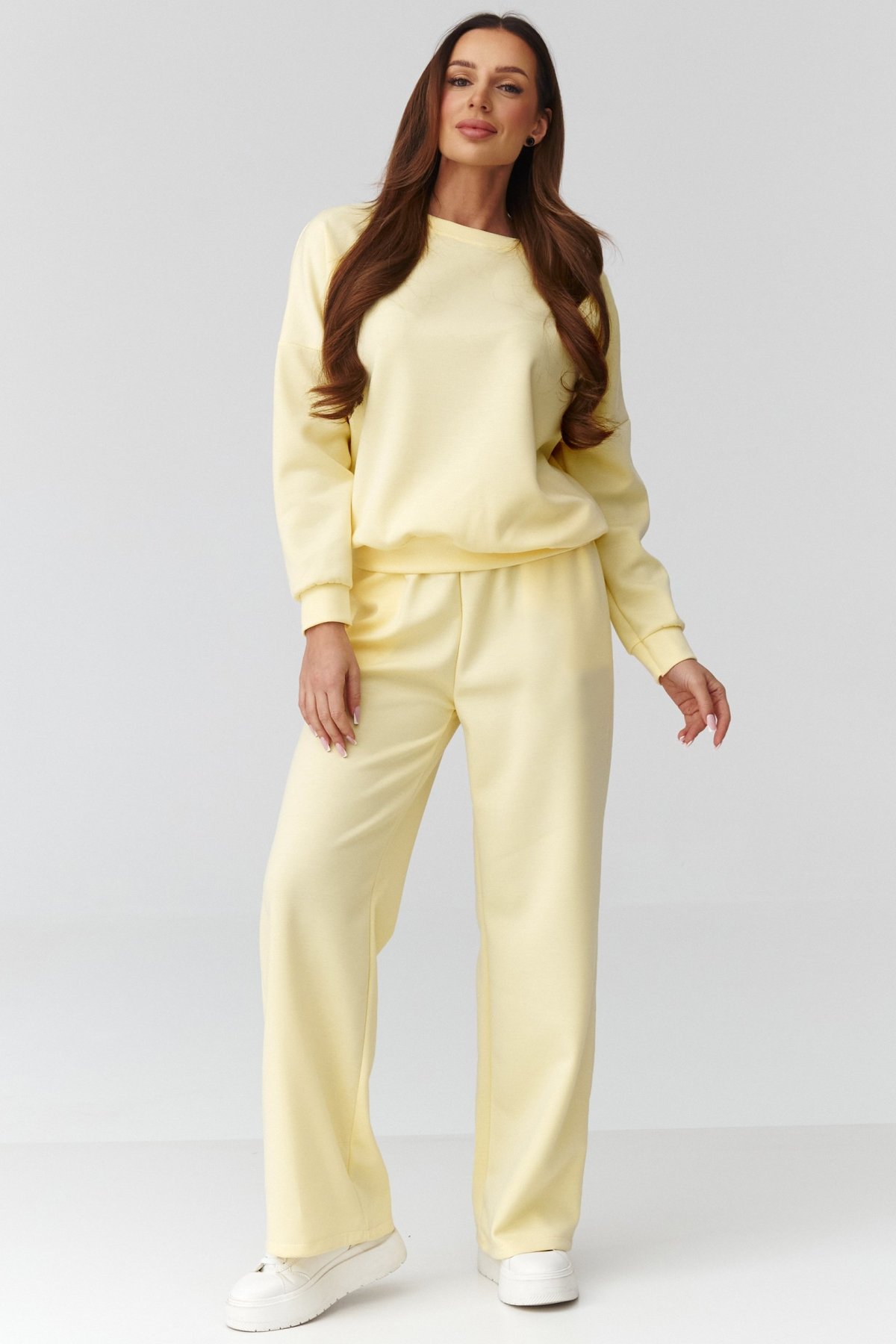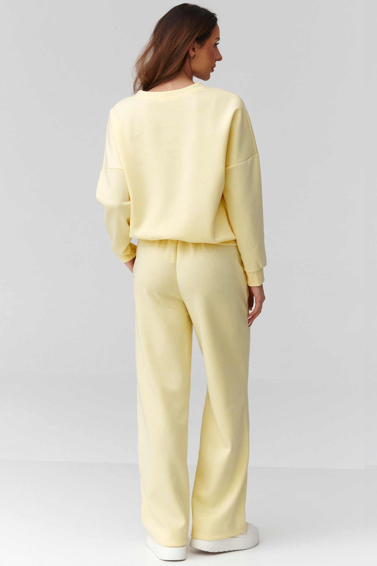 Volnější mikina s dlouhým rukávem zajišťuje komfort a přirozený pohyb, široké nohavice dodávají outfitu moderní siluetu a lehkost. Kalhoty mají pružný pas, který se přizpůsobí postavě a netlačí. Materiál je měkký na dotek, dobře splývá a působí upraveně i při celodenním nošení. Díky univerzálnímu střihu komplet vyhovuje různým typům postavy.