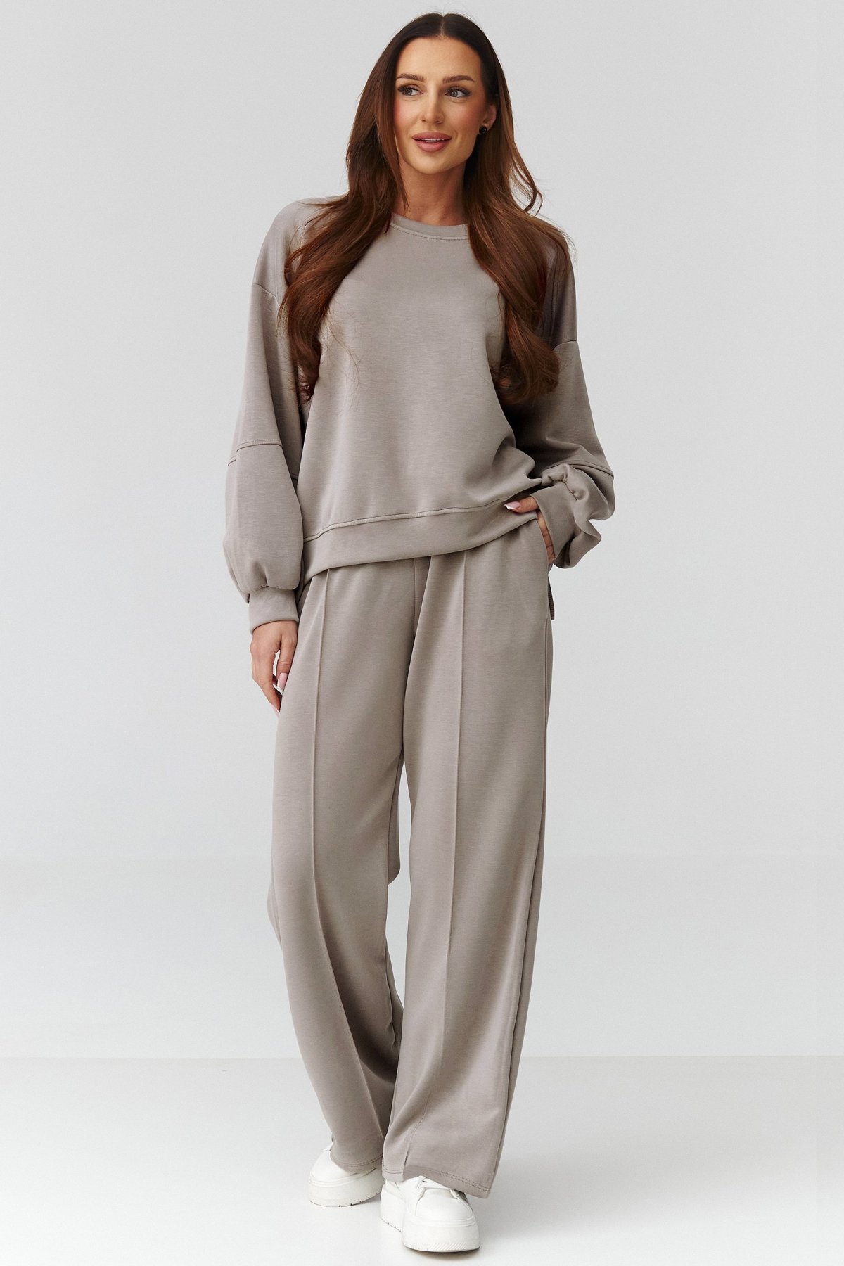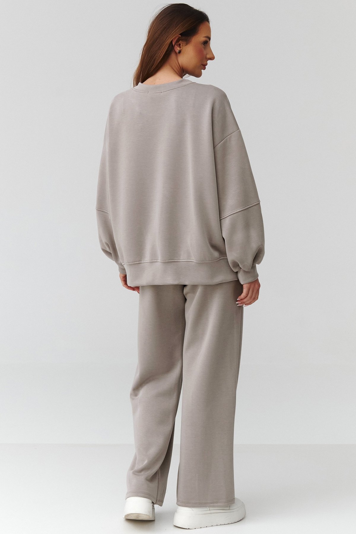 Oversize mikina s delší zadní částí působí moderně a dodává outfitu ležérní charakter. Široké kalhoty krásně splývají, opticky prodlužují postavu a zároveň neomezují v pohybu.