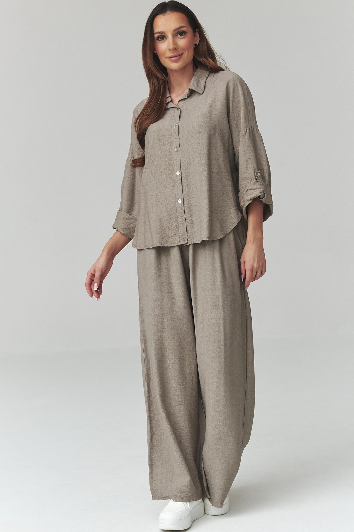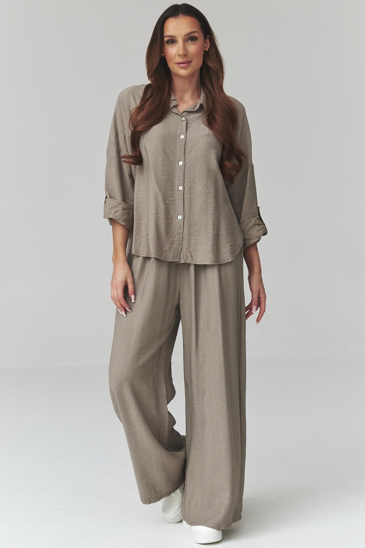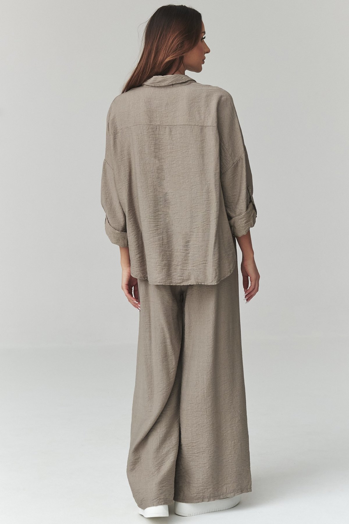 Dámský komplet v mocca odstínu s košilí a širokými kalhotami.