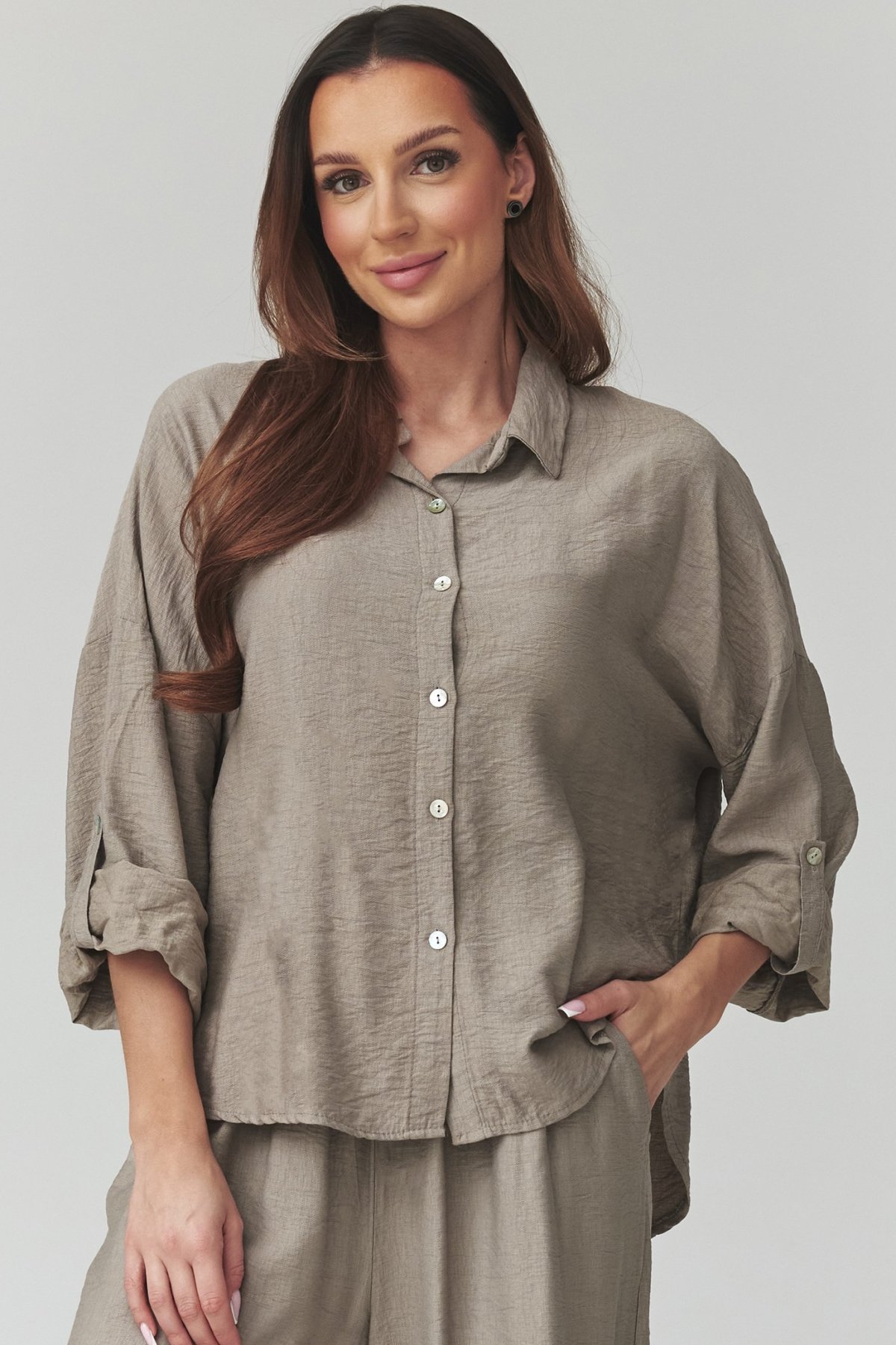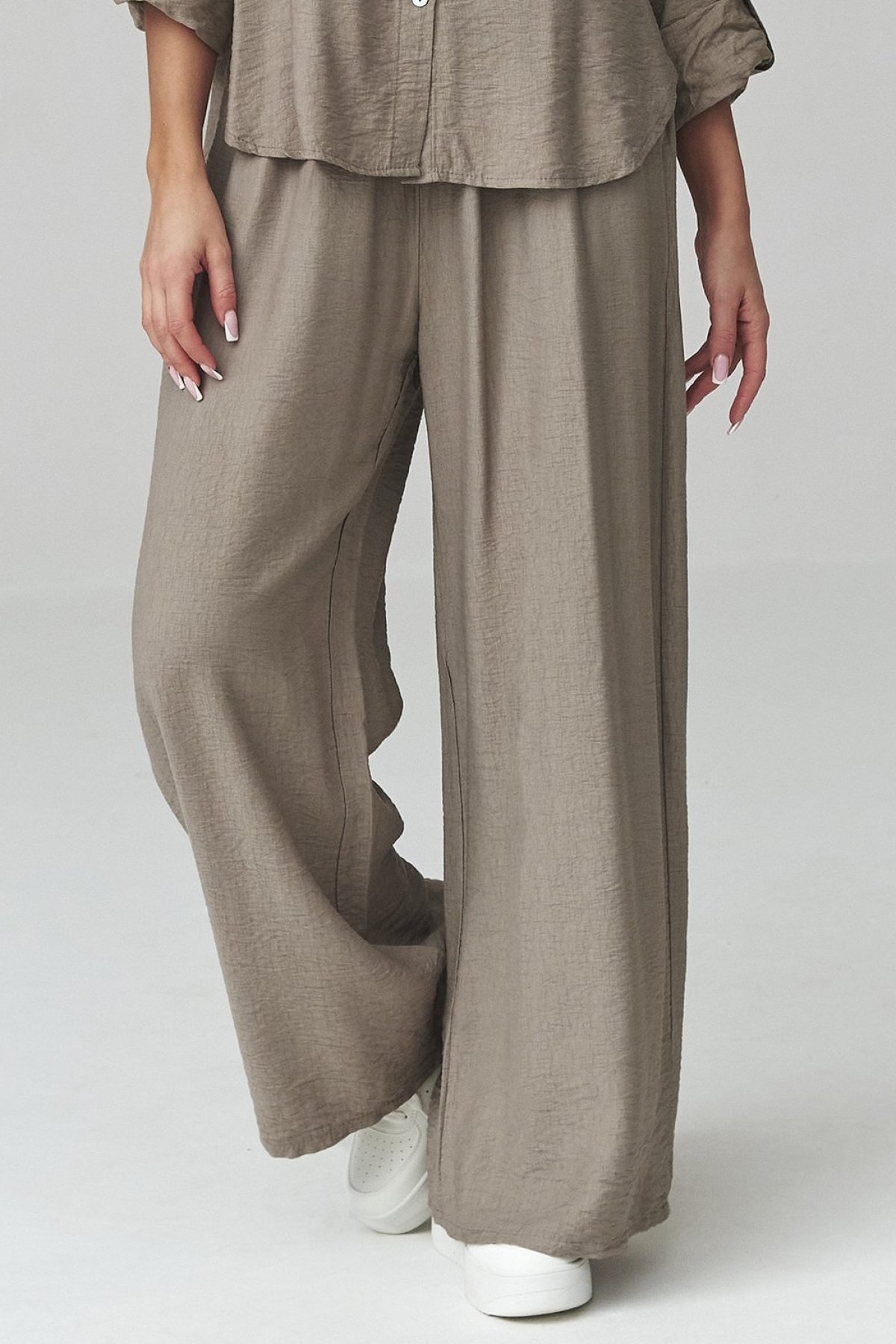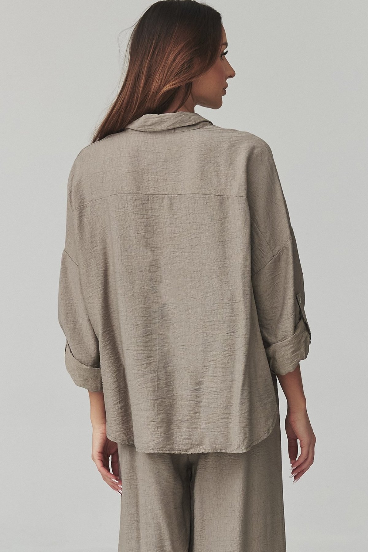 Dámský komplet v mocca odstínu s košilí a širokými kalhotami.