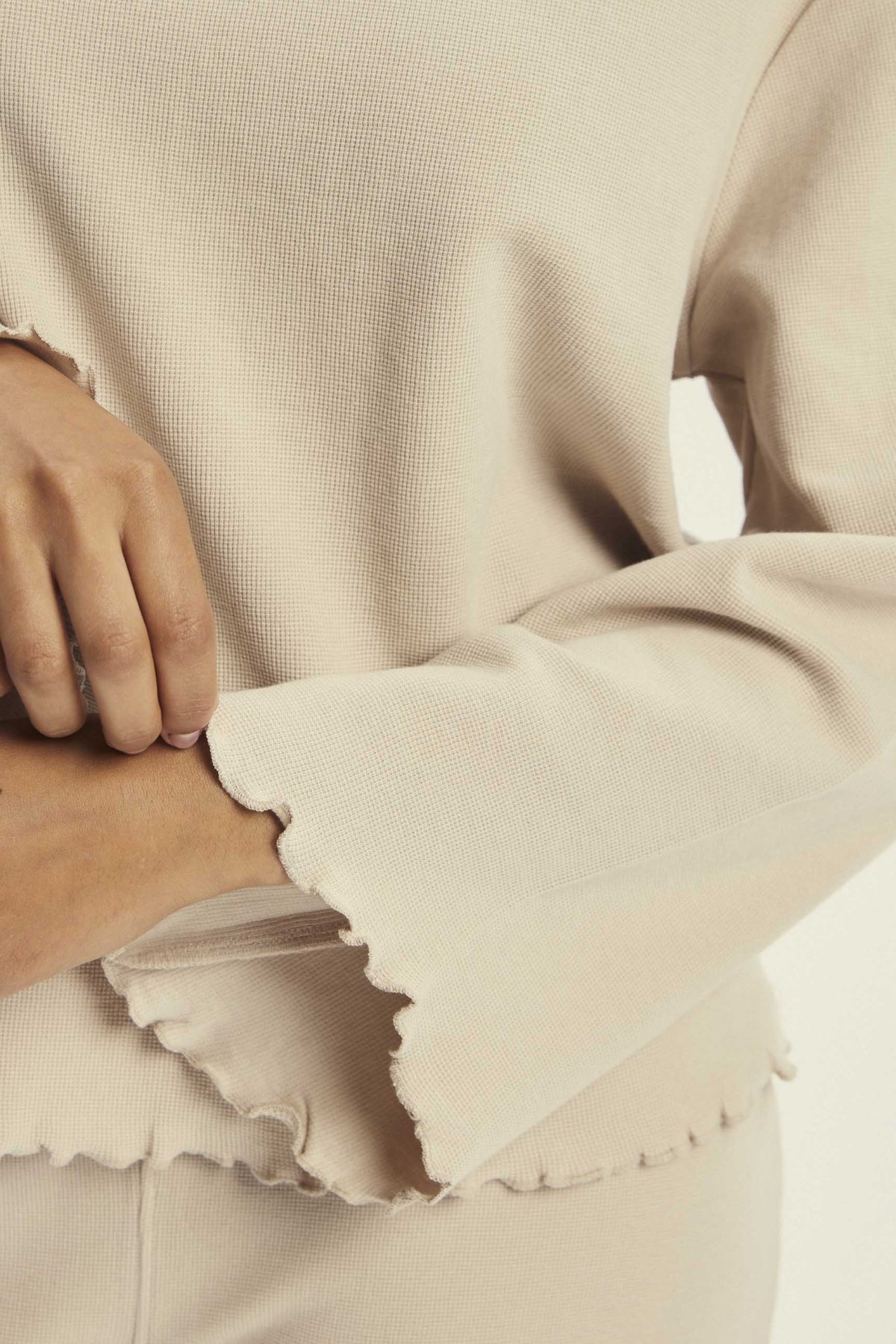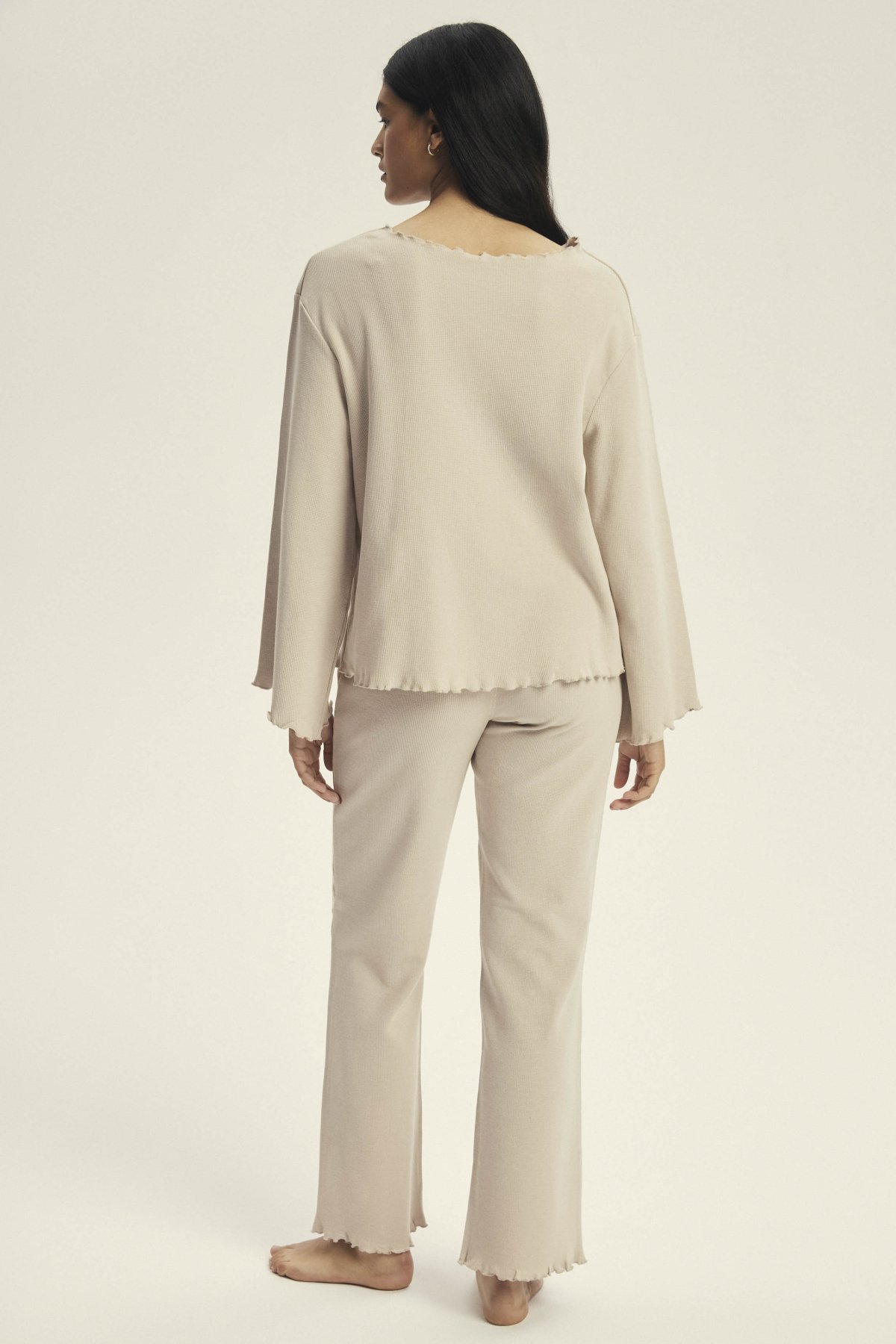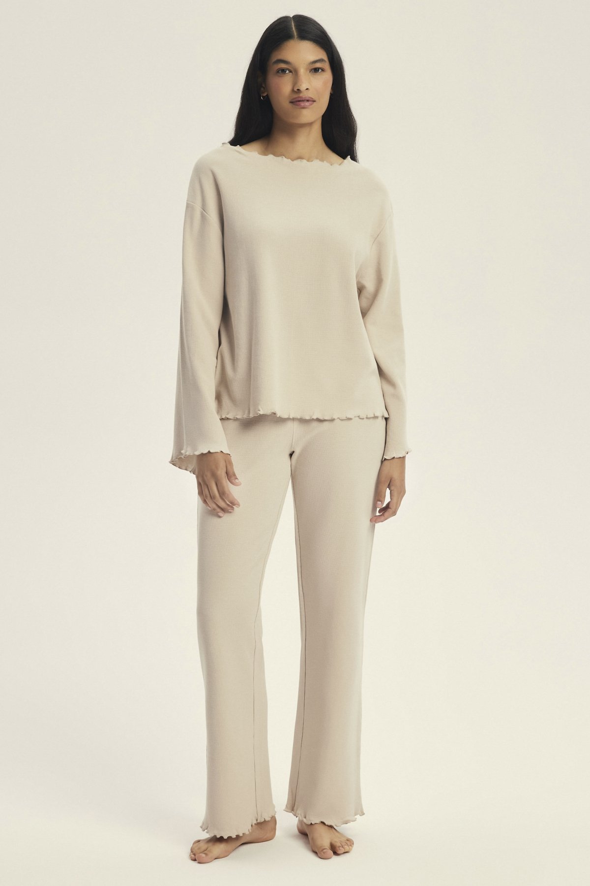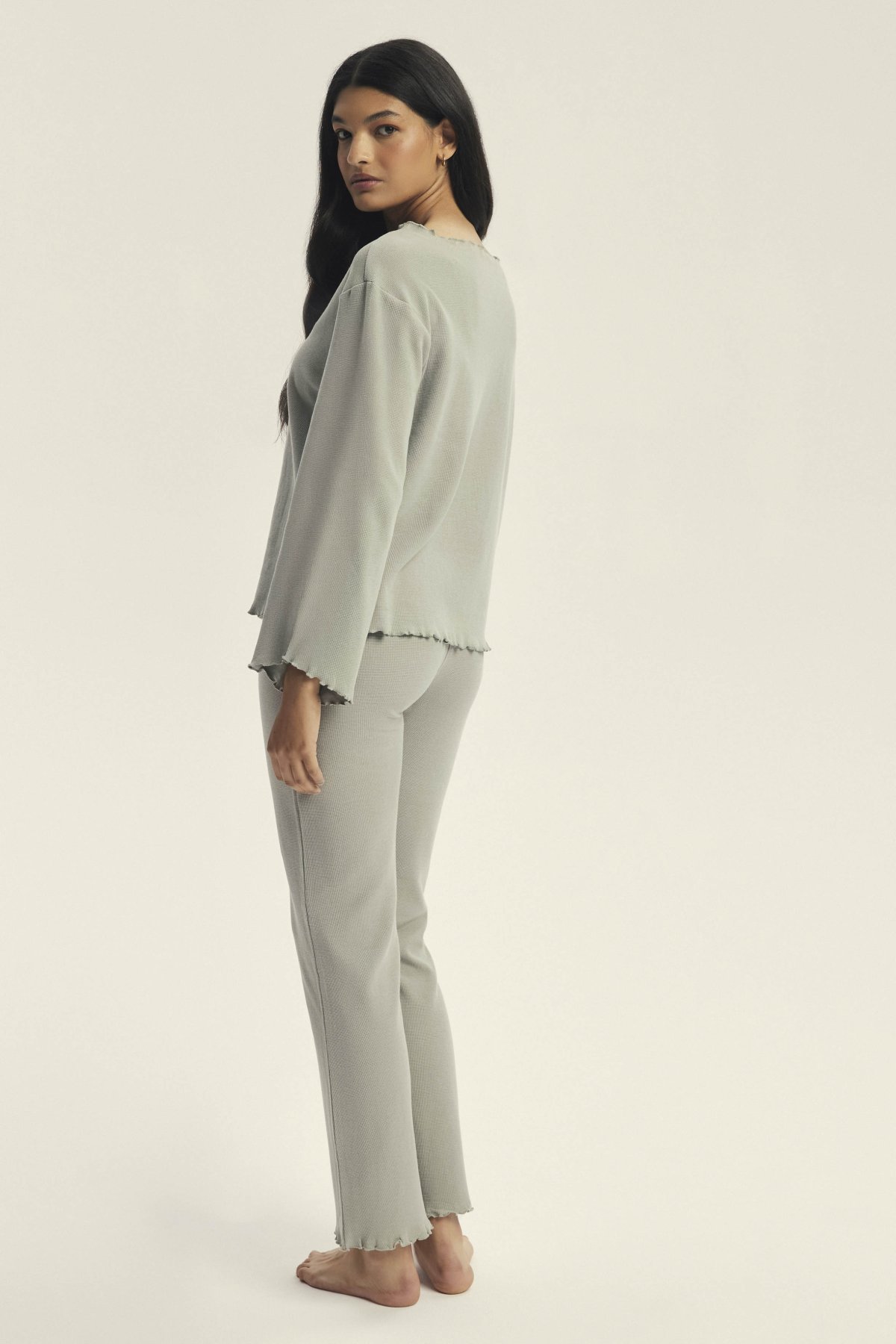 Horní díl má volnější střih a jemně rozšířené rukávy, které zakončuje ozdobná vlnka – tentýž detail se objevuje i na spodním lemu a nohavicích, které se ve spodní části také mírně rozšiřují. Pas příjemně pruží.