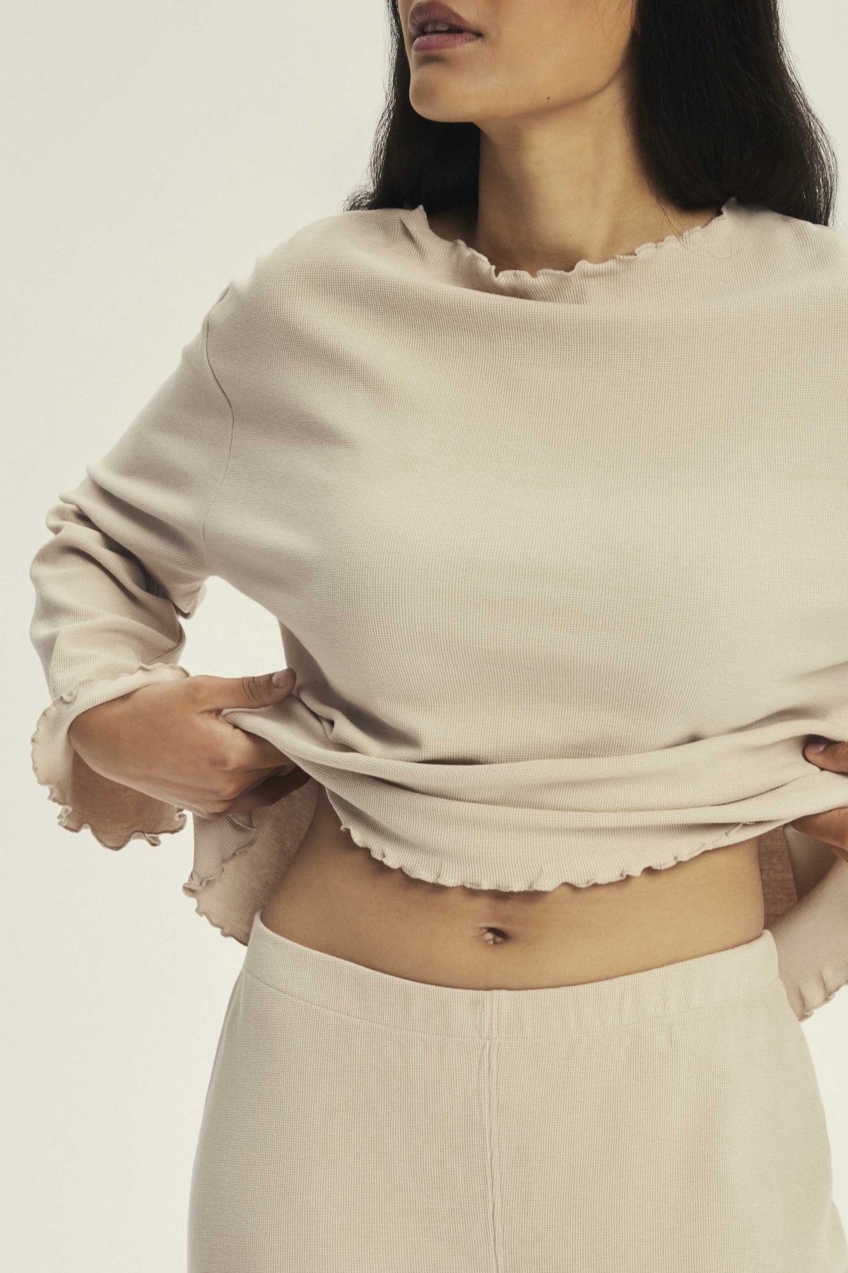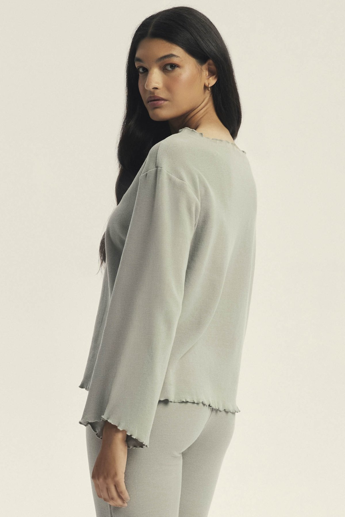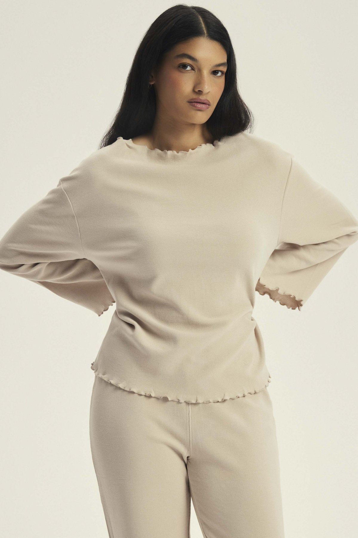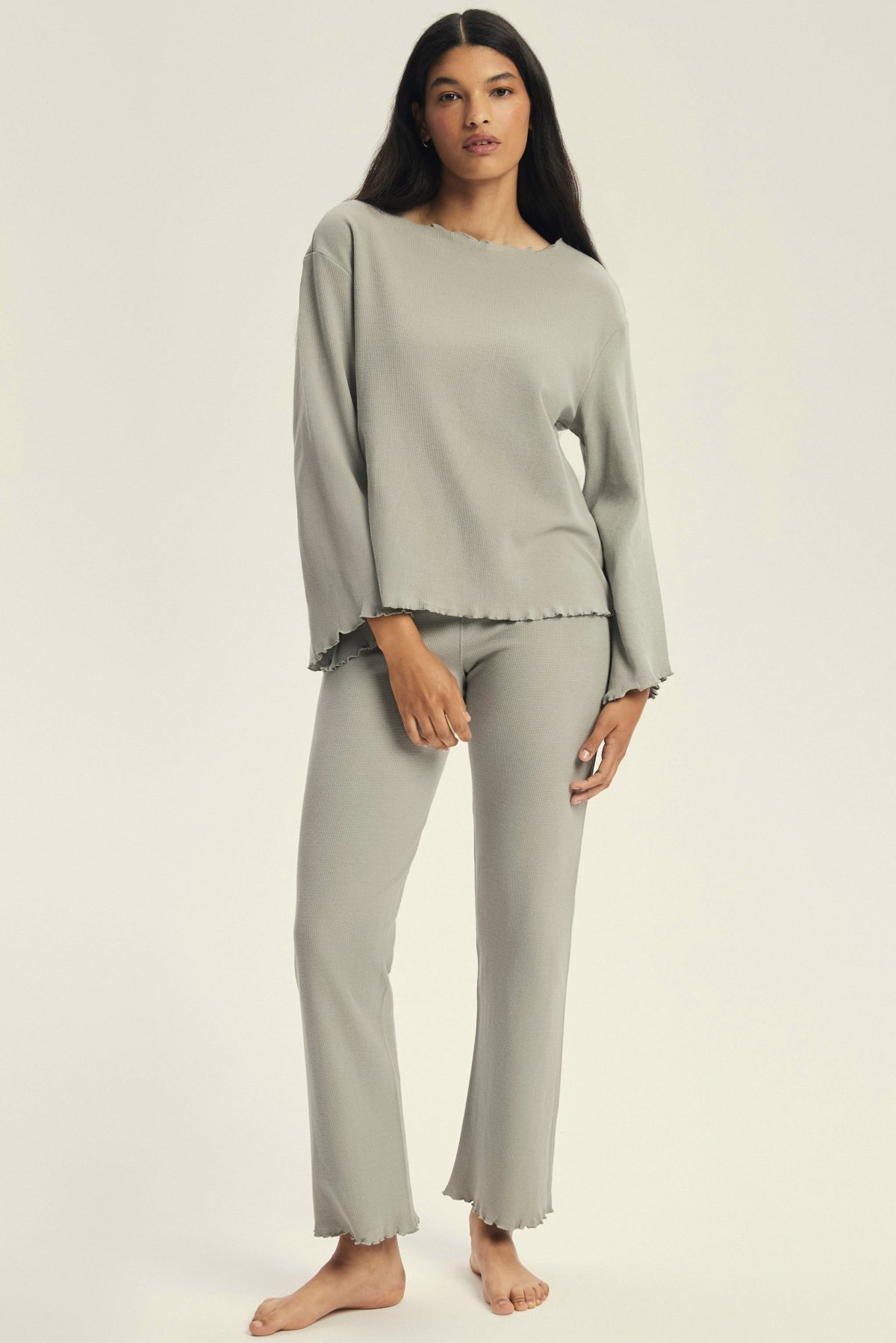 Horní díl má volnější střih a jemně rozšířené rukávy, které zakončuje ozdobná vlnka – tentýž detail se objevuje i na spodním lemu a nohavicích, které se ve spodní části také mírně rozšiřují. Pas příjemně pruží.