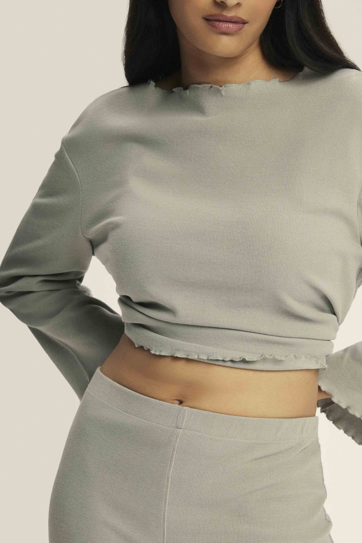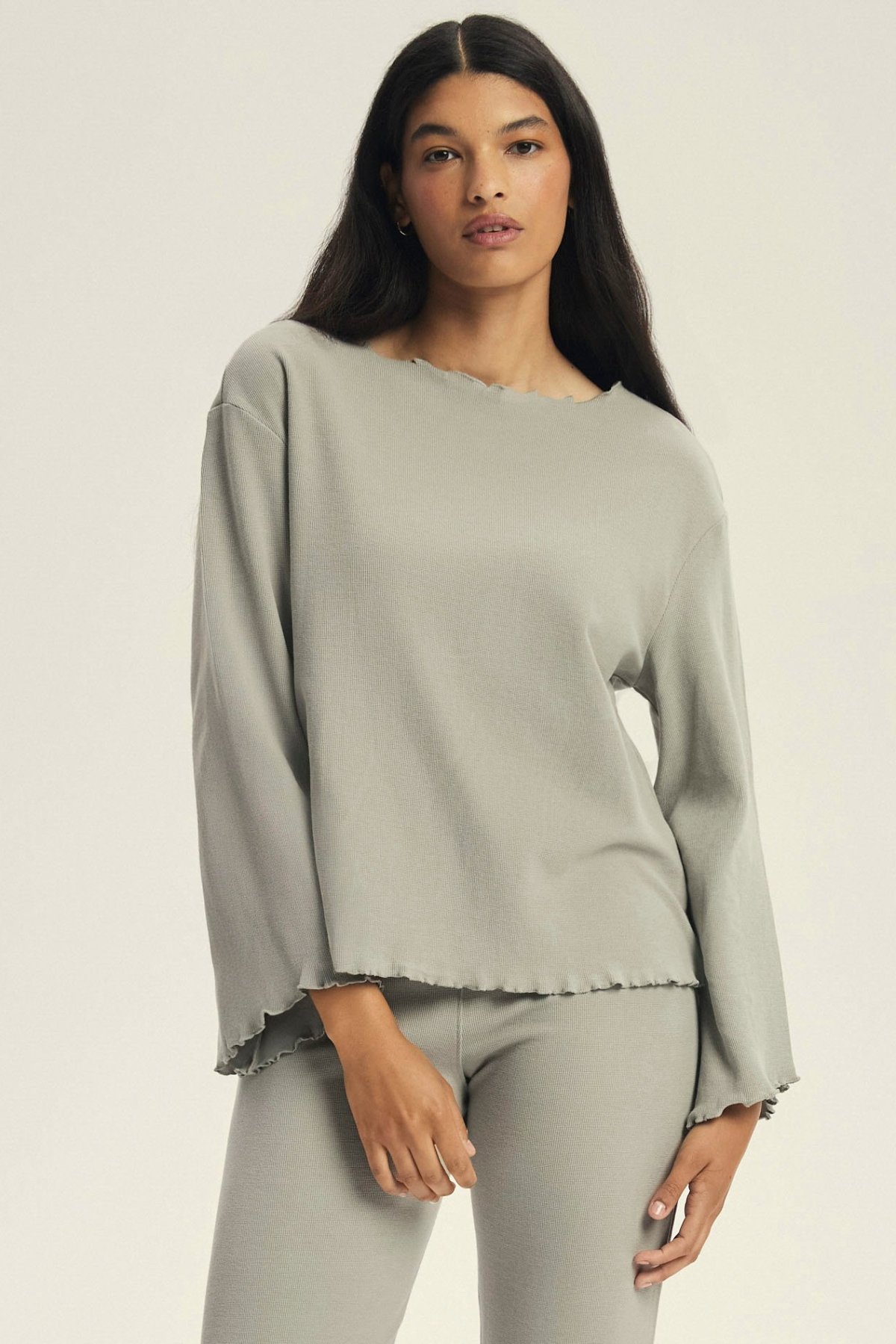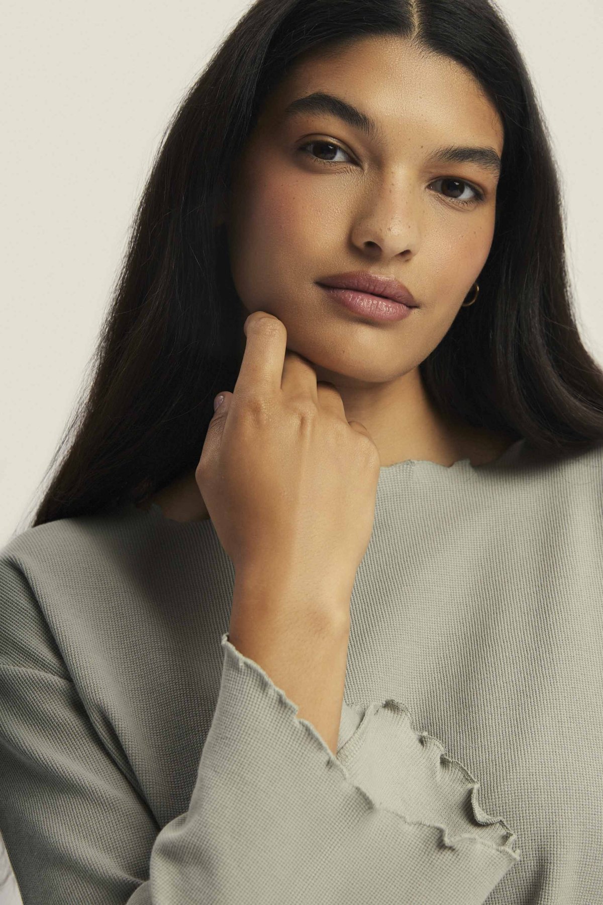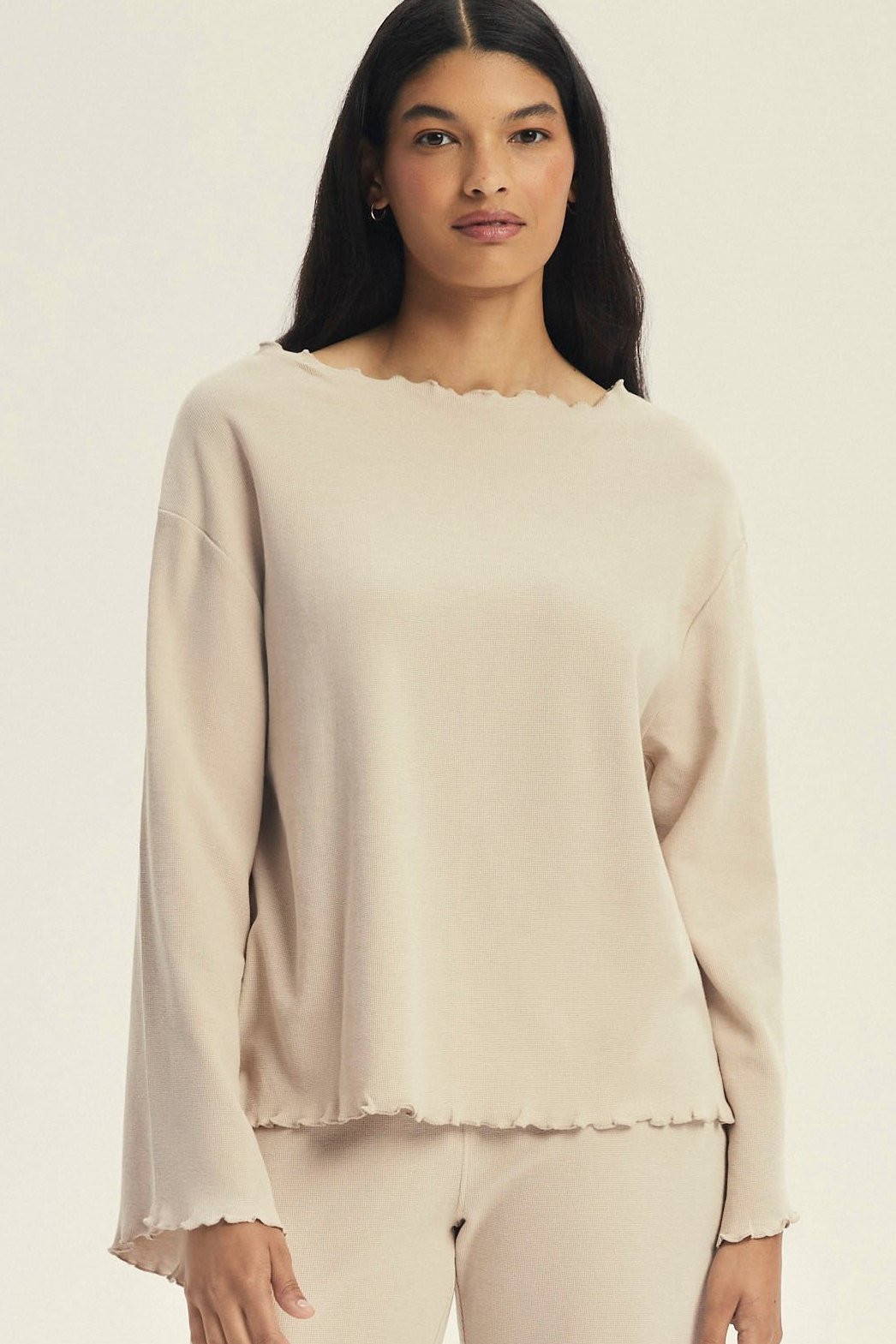 Horní díl má volnější střih a jemně rozšířené rukávy, které zakončuje ozdobná vlnka – tentýž detail se objevuje i na spodním lemu a nohavicích, které se ve spodní části také mírně rozšiřují. Pas příjemně pruží.