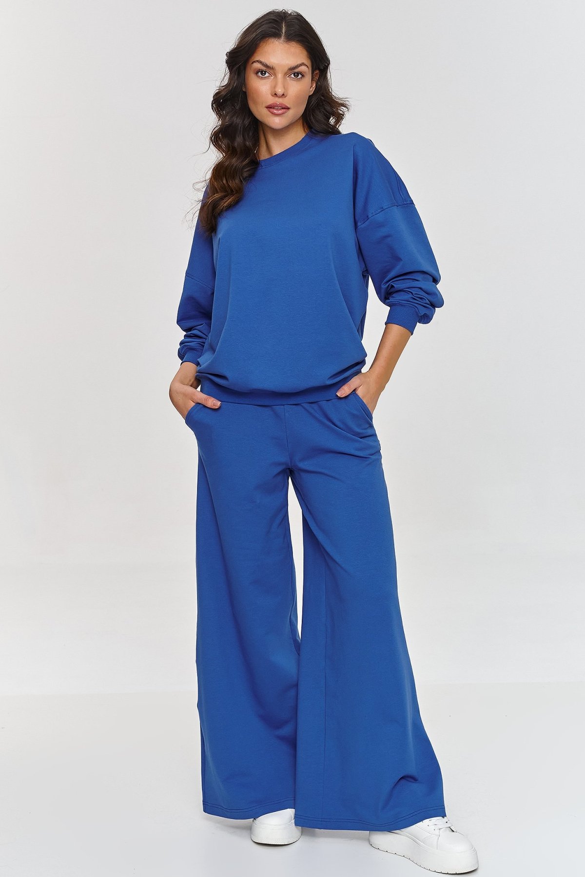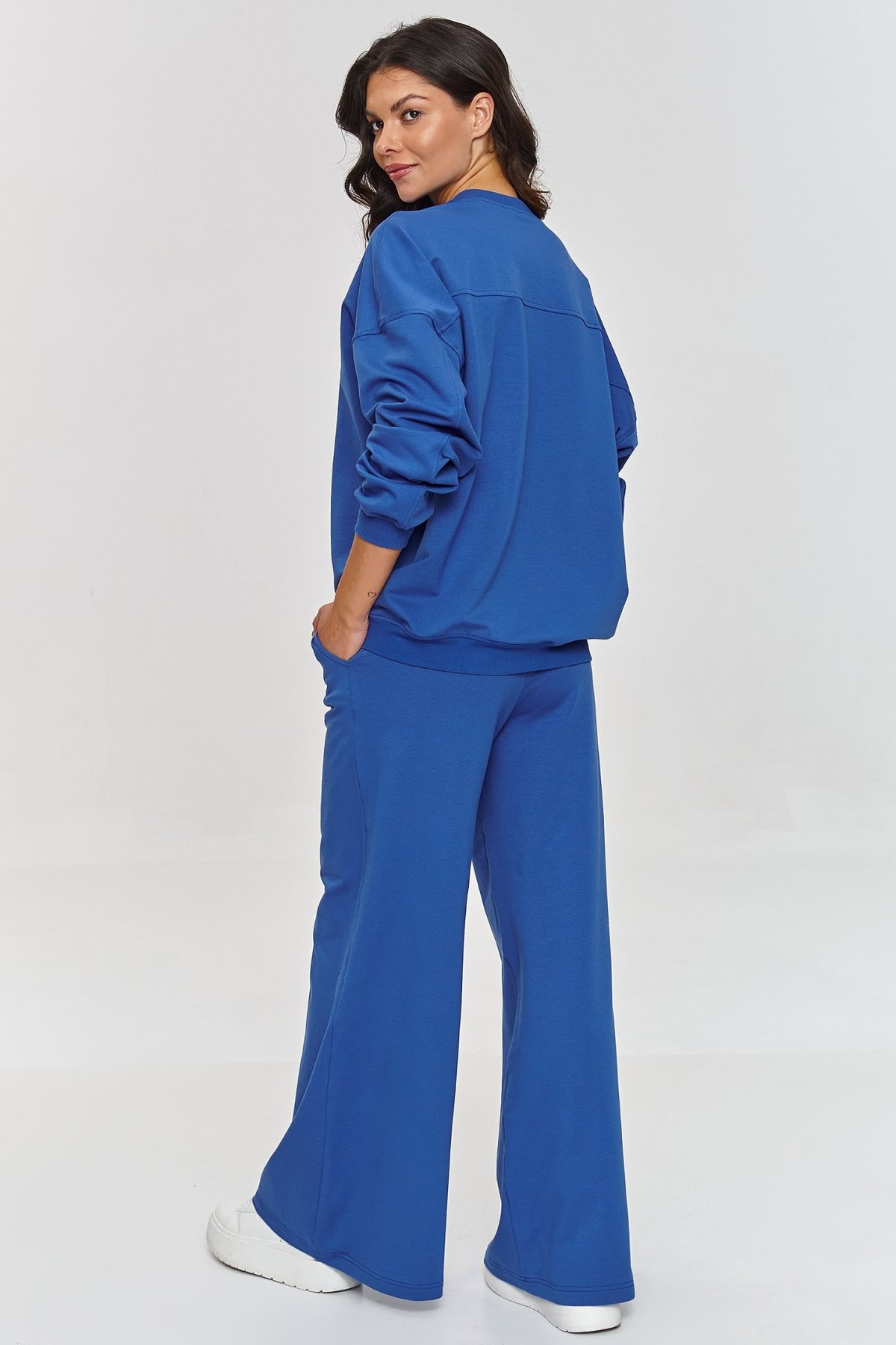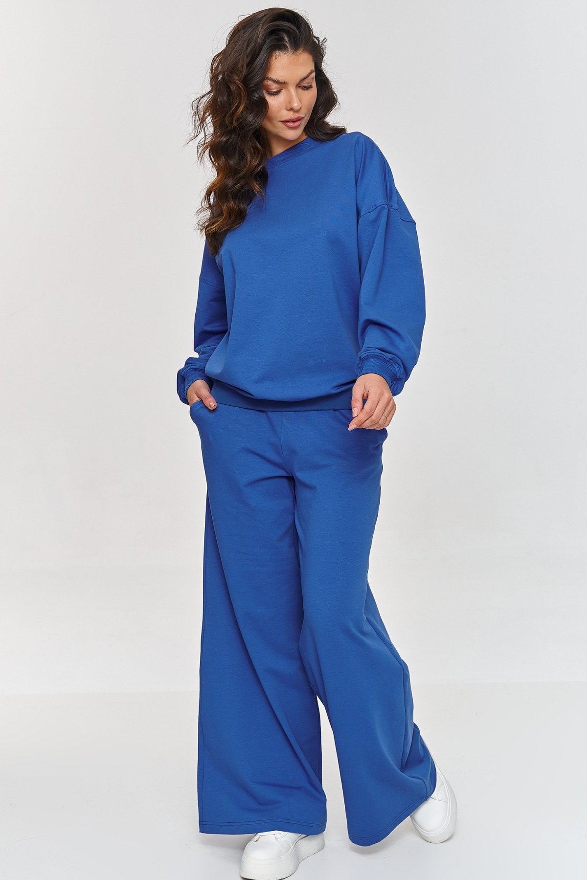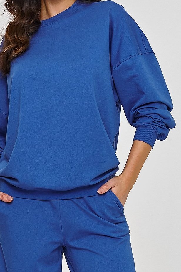Dvoudílný modrý komplet určený ženám, které chtějí spojit pohodlí s moderním stylem. Skládá se z oversize mikiny s dlouhými rukávy a volných kalhot, které společně tvoří pohodlný a stylový celek.