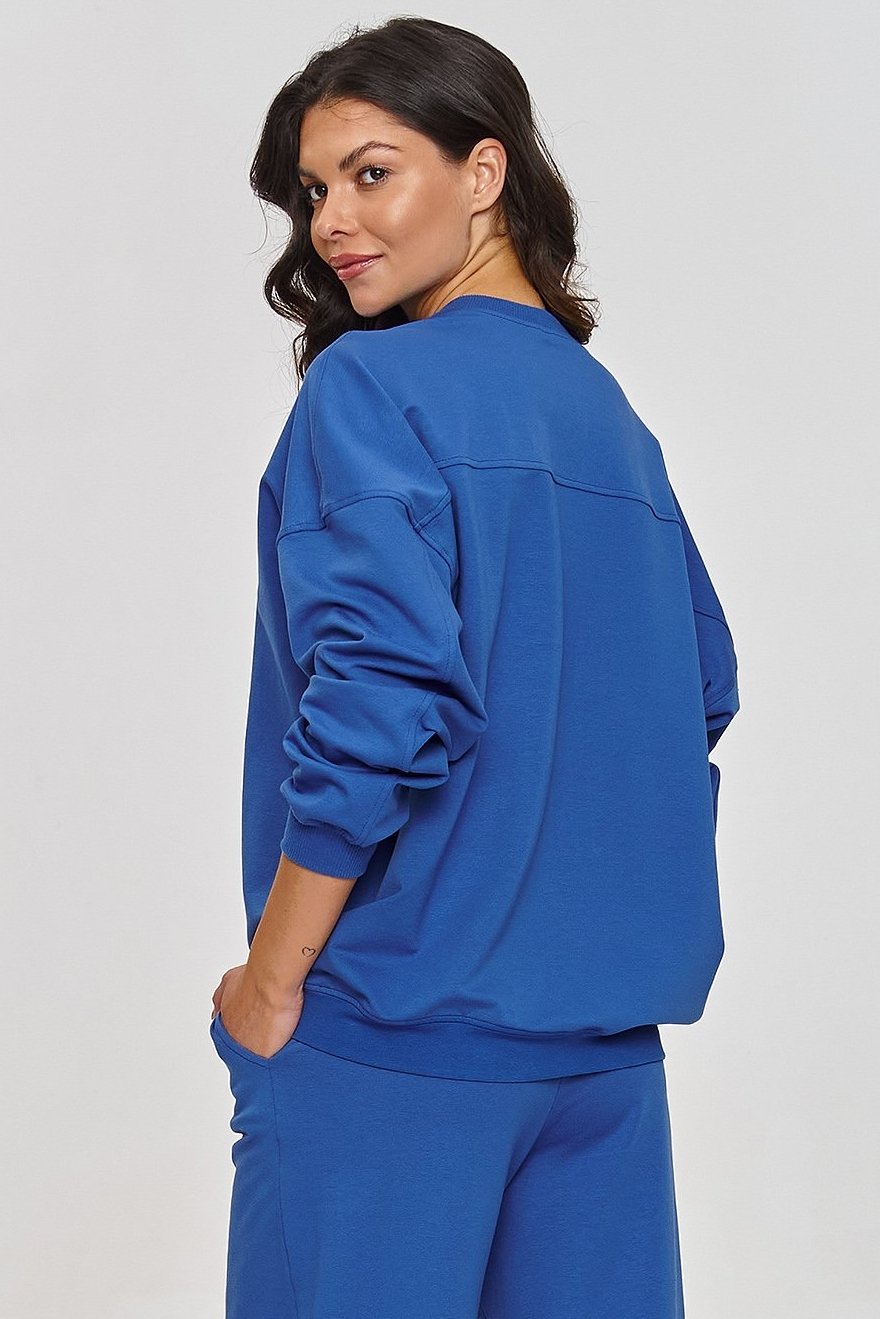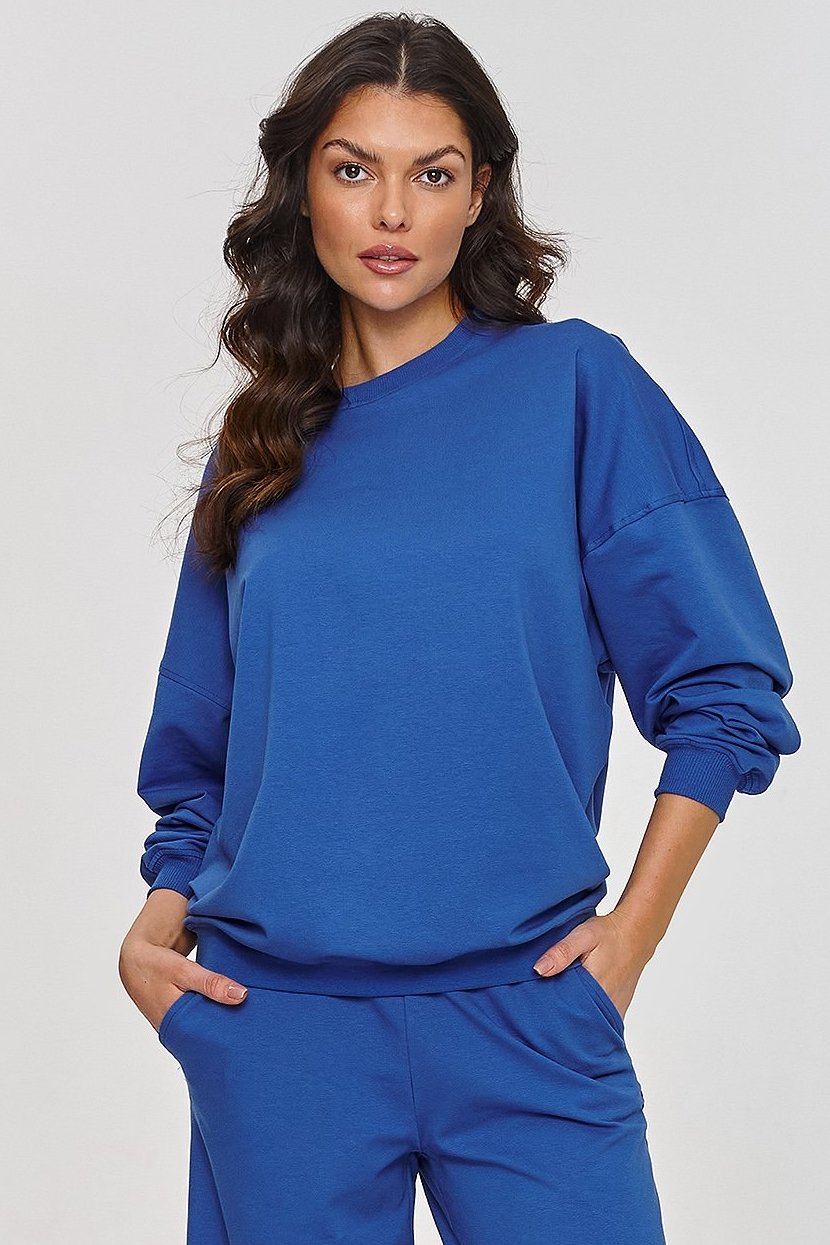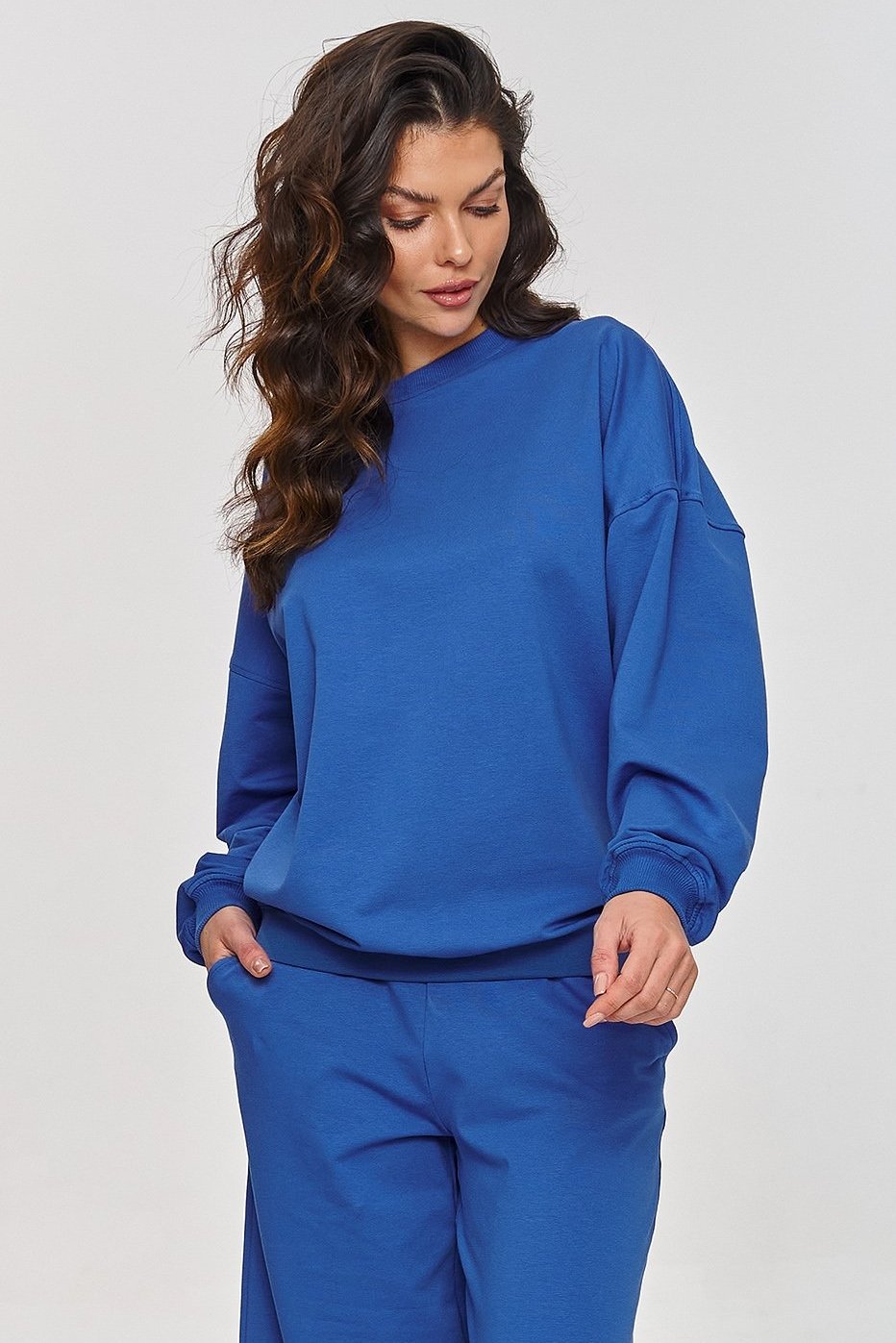 Dvoudílný modrý komplet určený ženám, které chtějí spojit pohodlí s moderním stylem. Skládá se z oversize mikiny s dlouhými rukávy a volných kalhot, které společně tvoří pohodlný a stylový celek.