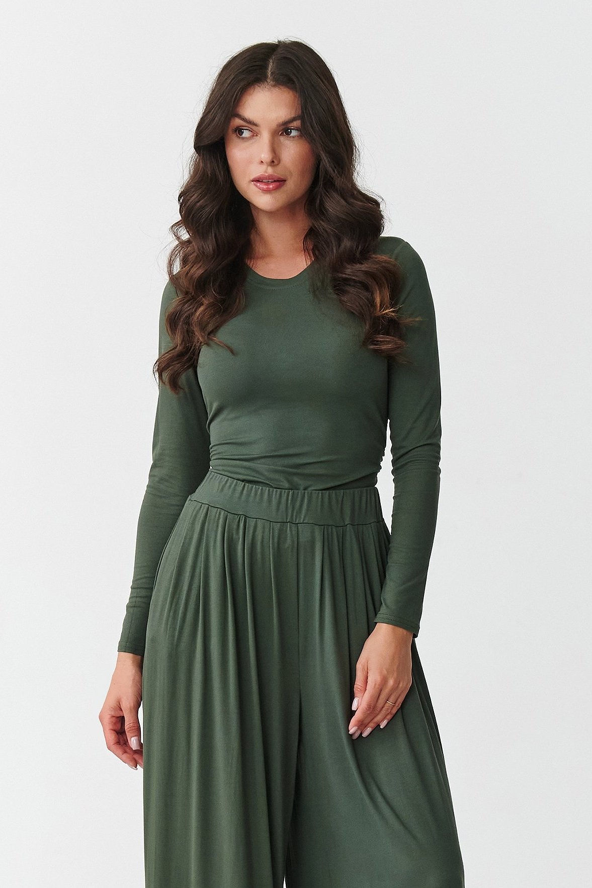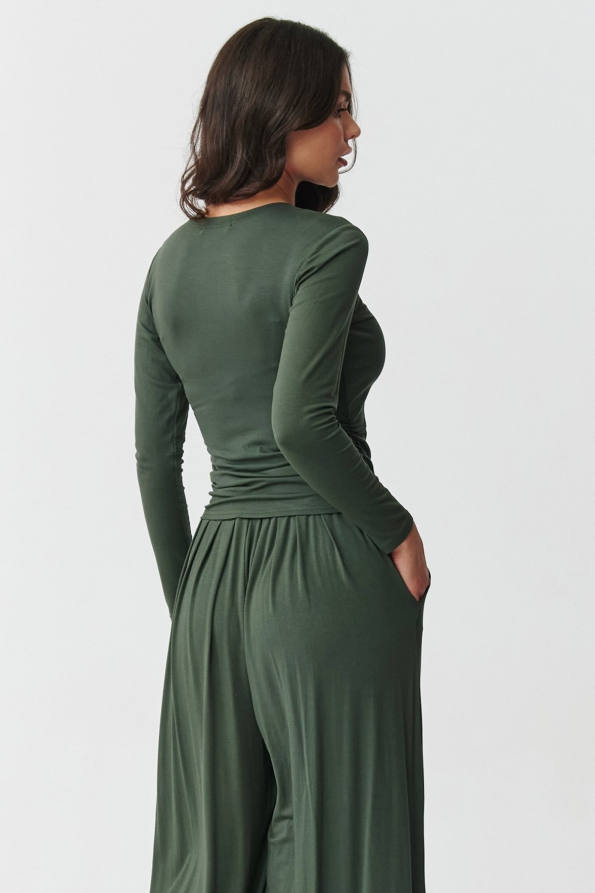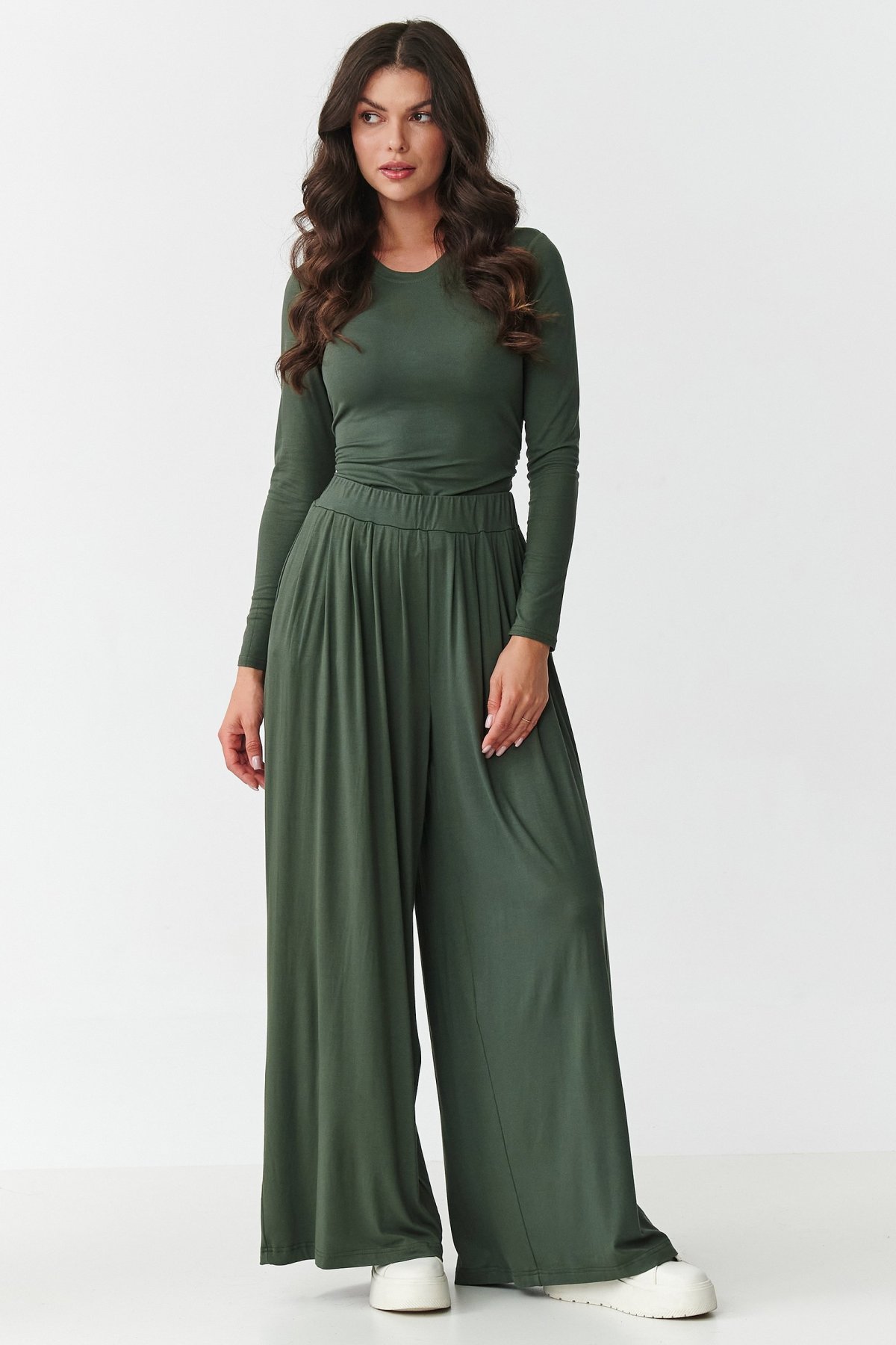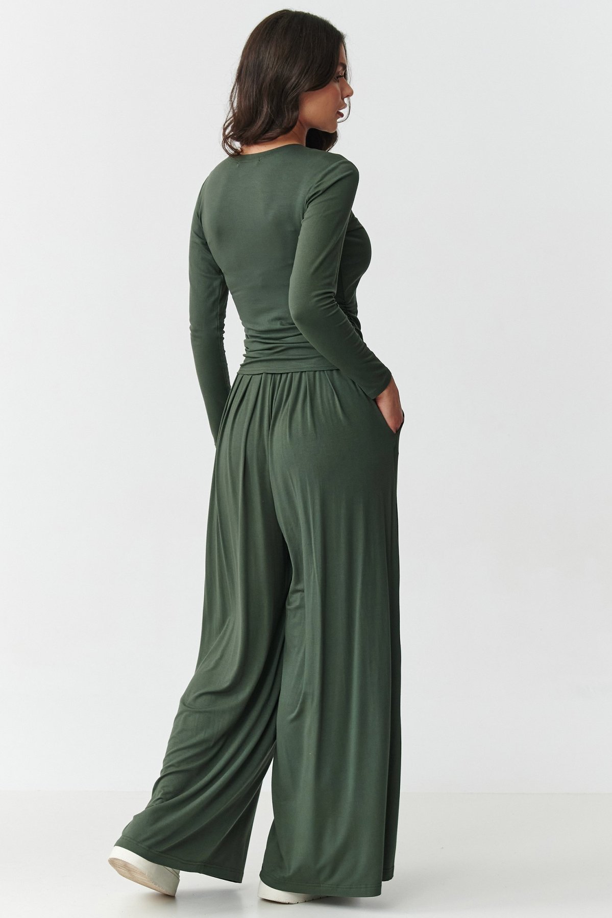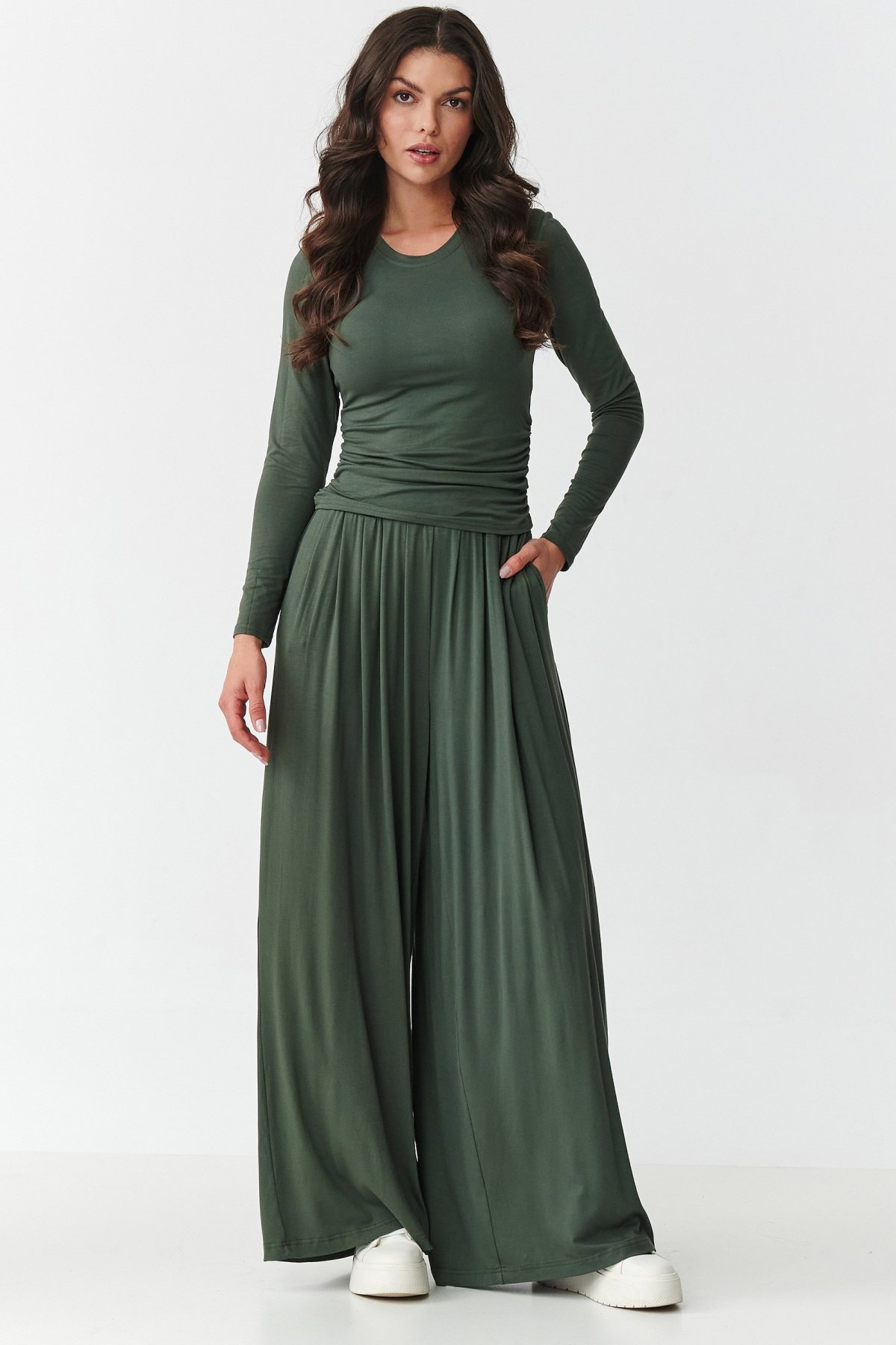 Tato souprava je ideální pro ženy, které hledají spojení vkusu, pohodlí a jemnosti. Komplet je vyroben z příjemné, na dotek měkké viskózy. Krásně se přizpůsobí postavě, zajišťuje maximální pohodlí a svobodu pohybu. Vrchní díl tvoří přiléhavé triko s dlouhými rukávy a jemným řasením na bocích. Tento ženský detail nejen, že zvýrazní tvary, ale dodá celku elegantní, nenucený charakter. Spojení jednoduchosti a tohoto moderního detailu zajišťuje originalitu i jen samotného trika. A tak se nemusíte bát kombinovat jej s jinými stylizacemi. Kalhoty jsou široké, volně splývají, garantují maximální pohodlí. Díky pružnému pasu a volným nohavicím se budou krásně prezentovat v pohybu. Jsou moderní a praktické. Využijete je pro volnočasové i vycházkové stylizace. Komplet můžete pořídit ve více atraktivních barvách. Vsaďte na pohodlí, které jde ruku v ruce s ženským stylem. Sáhněte po tomto viskózovém duetu a užijte si jedinečný styl a výjimečný vzhled.