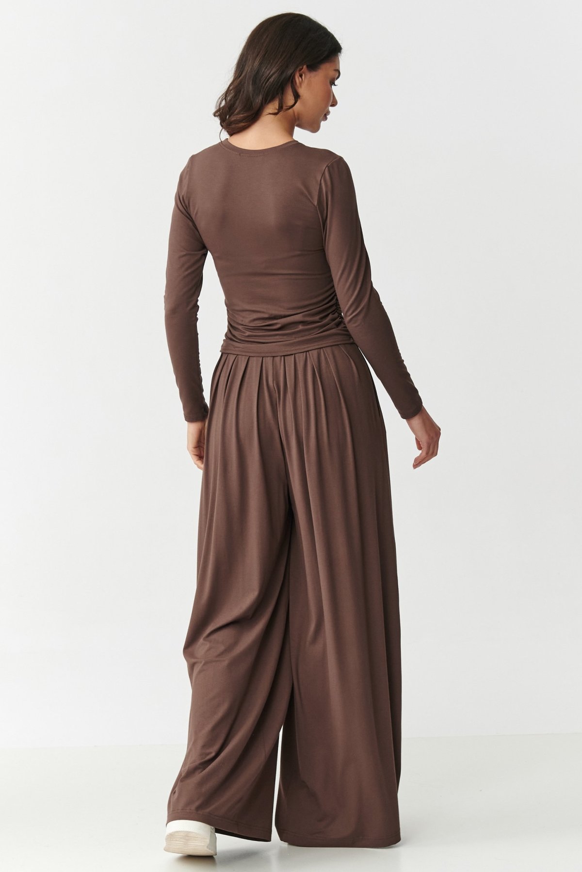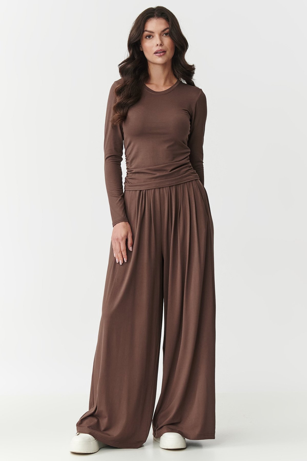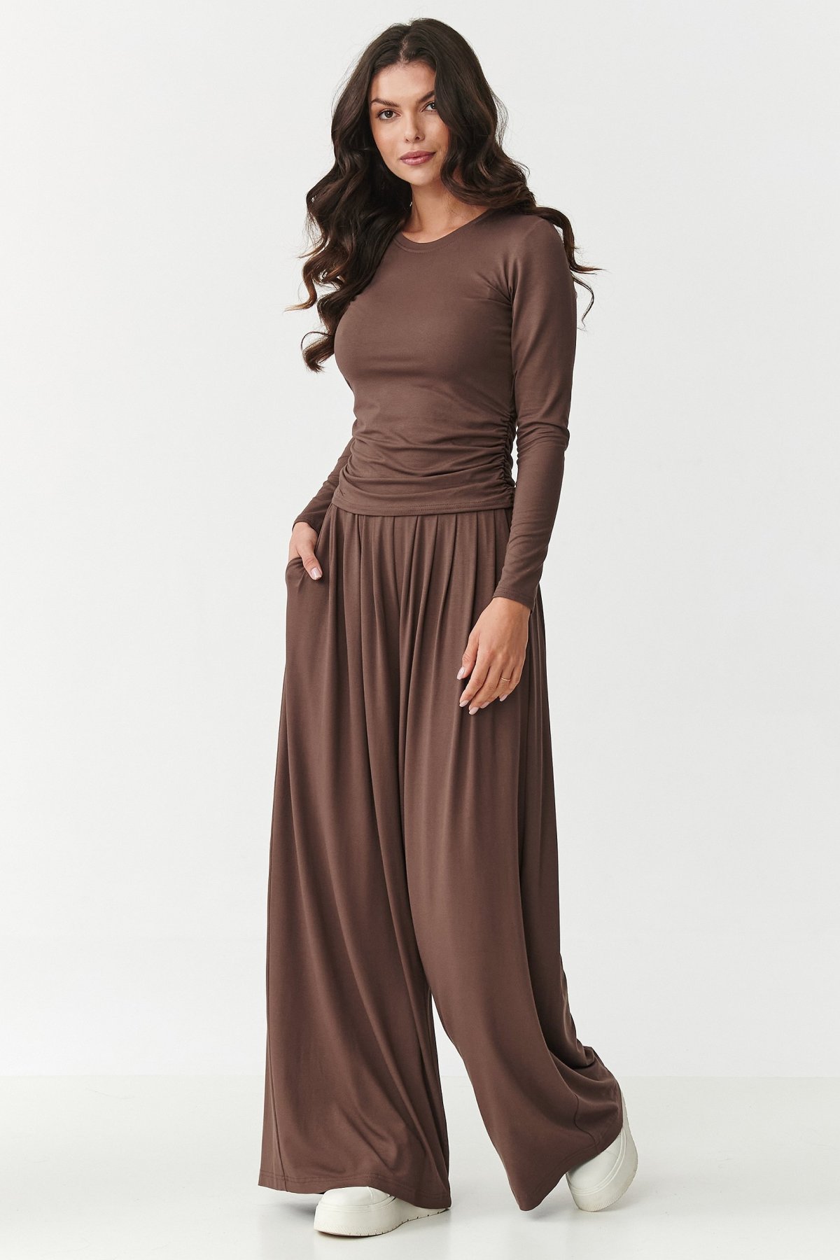 Tato souprava je ideální pro ženy, které hledají spojení vkusu, pohodlí a jemnosti. Komplet je vyroben z příjemné, na dotek měkké viskózy. Krásně se přizpůsobí postavě, zajišťuje maximální pohodlí a svobodu pohybu. Vrchní díl tvoří přiléhavé triko s dlouhými rukávy a jemným řasením na bocích. Tento ženský detail nejen, že zvýrazní tvary, ale dodá celku elegantní, nenucený charakter. Spojení jednoduchosti a tohoto moderního detailu zajišťuje originalitu i jen samotného trika. A tak se nemusíte bát kombinovat jej s jinými stylizacemi. Kalhoty jsou široké, volně splývají, garantují maximální pohodlí. Díky pružnému pasu a volným nohavicím se budou krásně prezentovat v pohybu. Jsou moderní a praktické. Využijete je pro volnočasové i vycházkové stylizace. Komplet můžete pořídit ve více atraktivních barvách. Vsaďte na pohodlí, které jde ruku v ruce s ženským stylem. Sáhněte po tomto viskózovém duetu a užijte si jedinečný styl a výjimečný vzhled.
