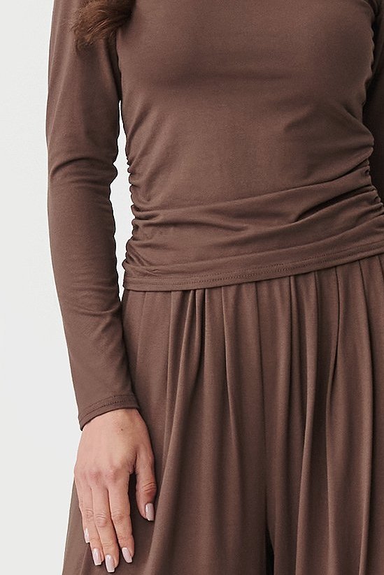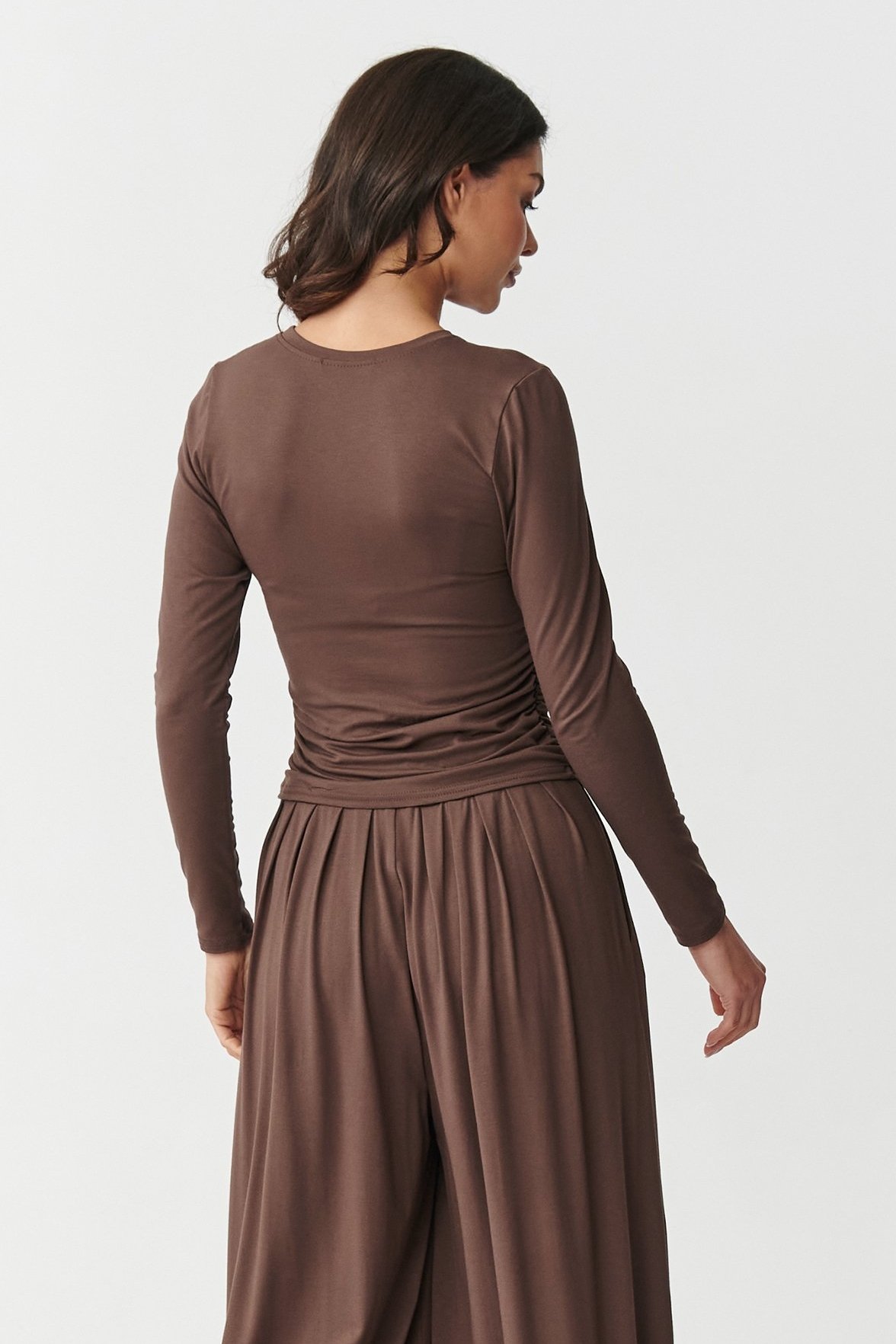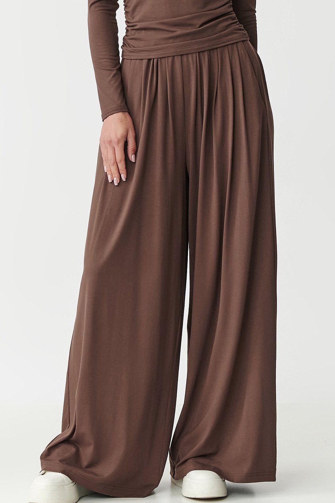 Tato souprava je ideální pro ženy, které hledají spojení vkusu, pohodlí a jemnosti. Komplet je vyroben z příjemné, na dotek měkké viskózy. Krásně se přizpůsobí postavě, zajišťuje maximální pohodlí a svobodu pohybu. Vrchní díl tvoří přiléhavé triko s dlouhými rukávy a jemným řasením na bocích. Tento ženský detail nejen, že zvýrazní tvary, ale dodá celku elegantní, nenucený charakter. Spojení jednoduchosti a tohoto moderního detailu zajišťuje originalitu i jen samotného trika. A tak se nemusíte bát kombinovat jej s jinými stylizacemi. Kalhoty jsou široké, volně splývají, garantují maximální pohodlí. Díky pružnému pasu a volným nohavicím se budou krásně prezentovat v pohybu. Jsou moderní a praktické. Využijete je pro volnočasové i vycházkové stylizace. Komplet můžete pořídit ve více atraktivních barvách. Vsaďte na pohodlí, které jde ruku v ruce s ženským stylem. Sáhněte po tomto viskózovém duetu a užijte si jedinečný styl a výjimečný vzhled.
