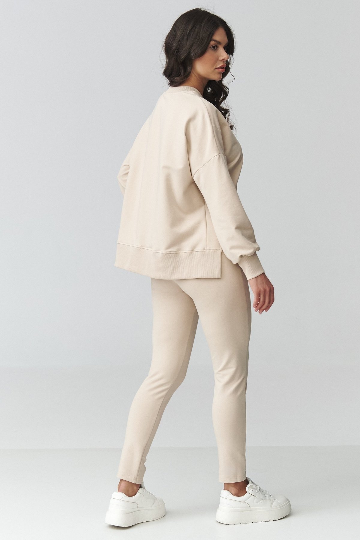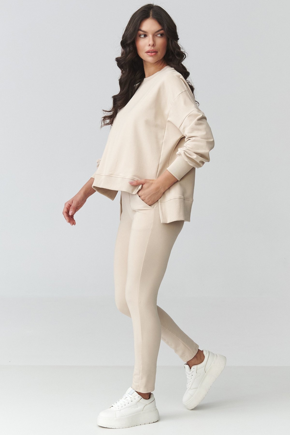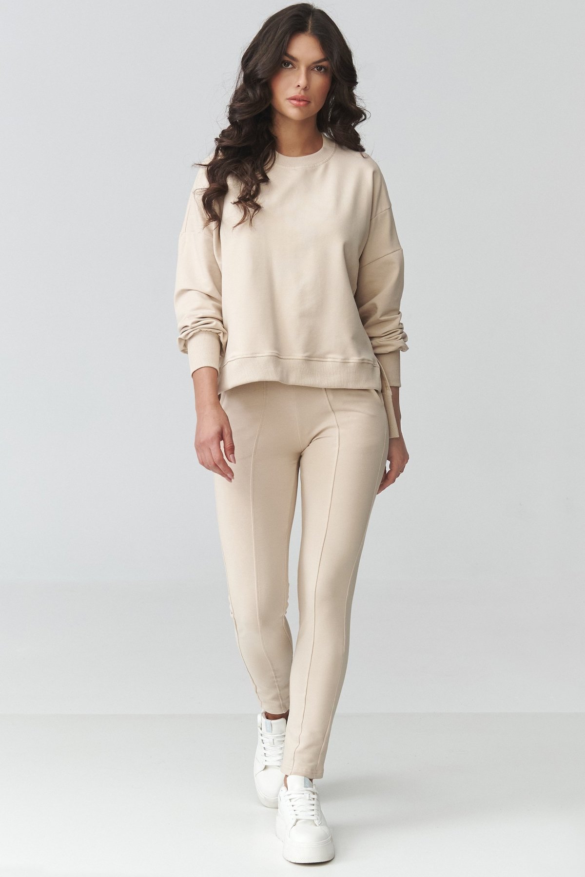 Tento teplákový komplet světle béžové barvy spojuje uvolněný vršek a užší spodní díl, takže působí vyváženě a současně.