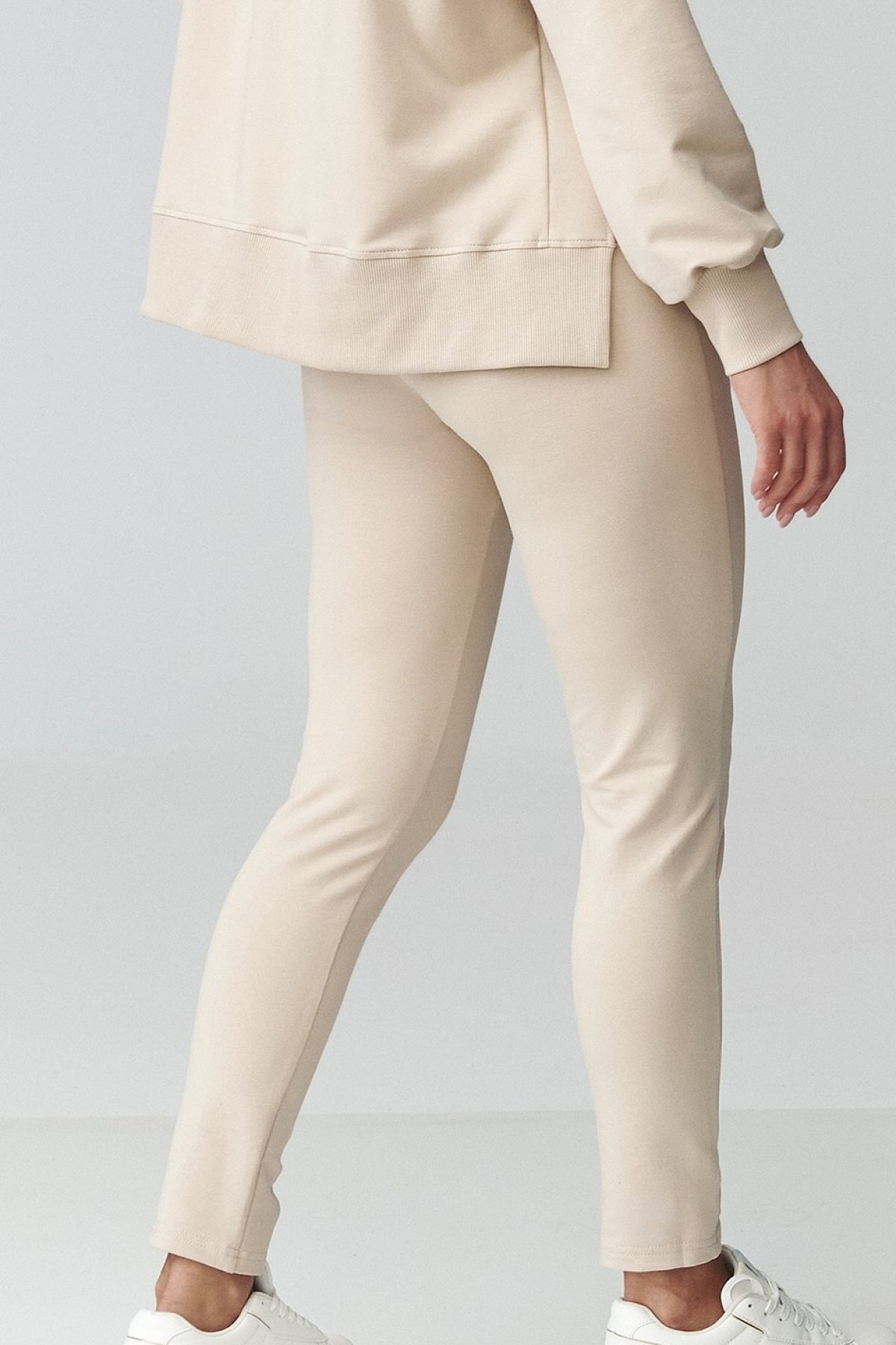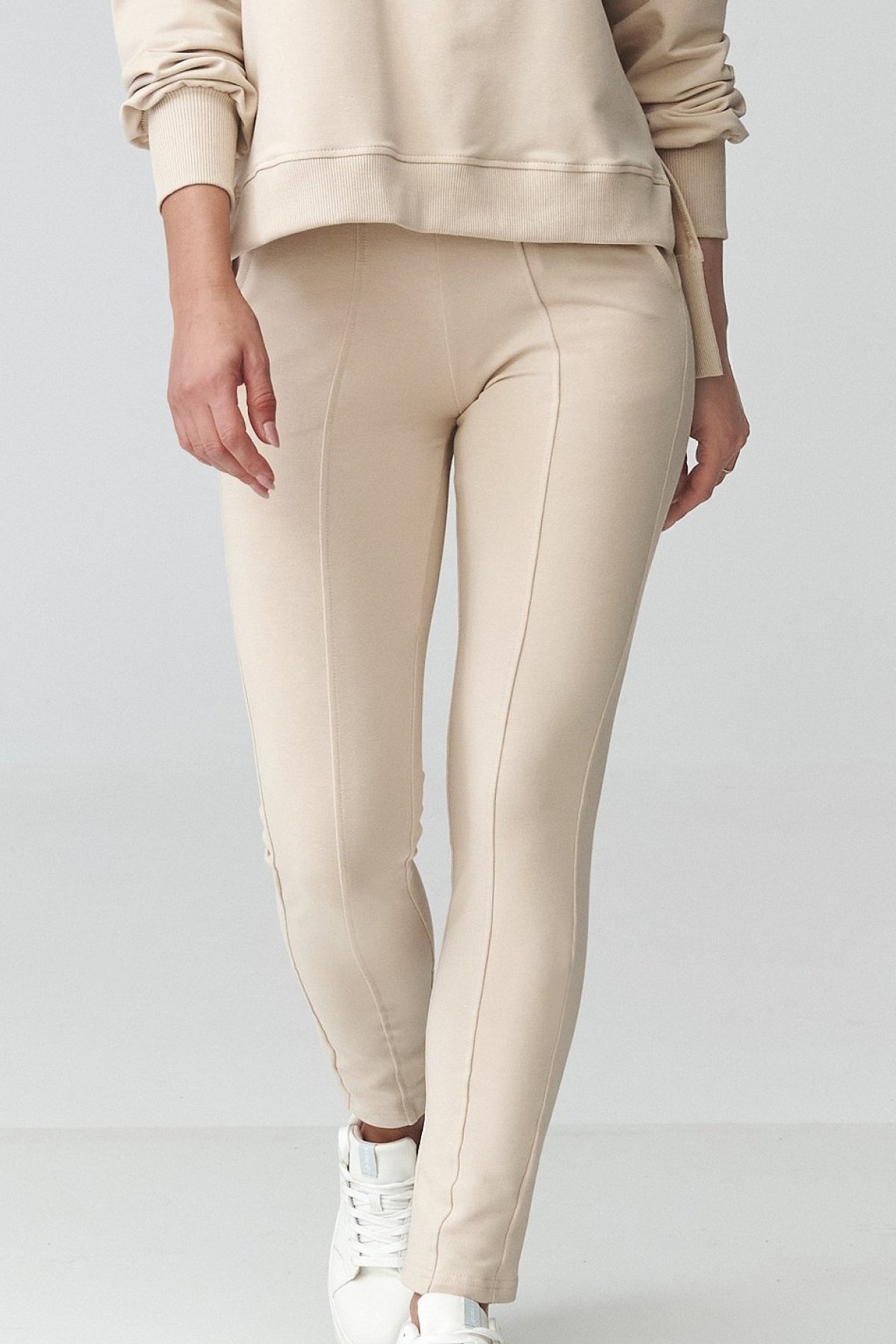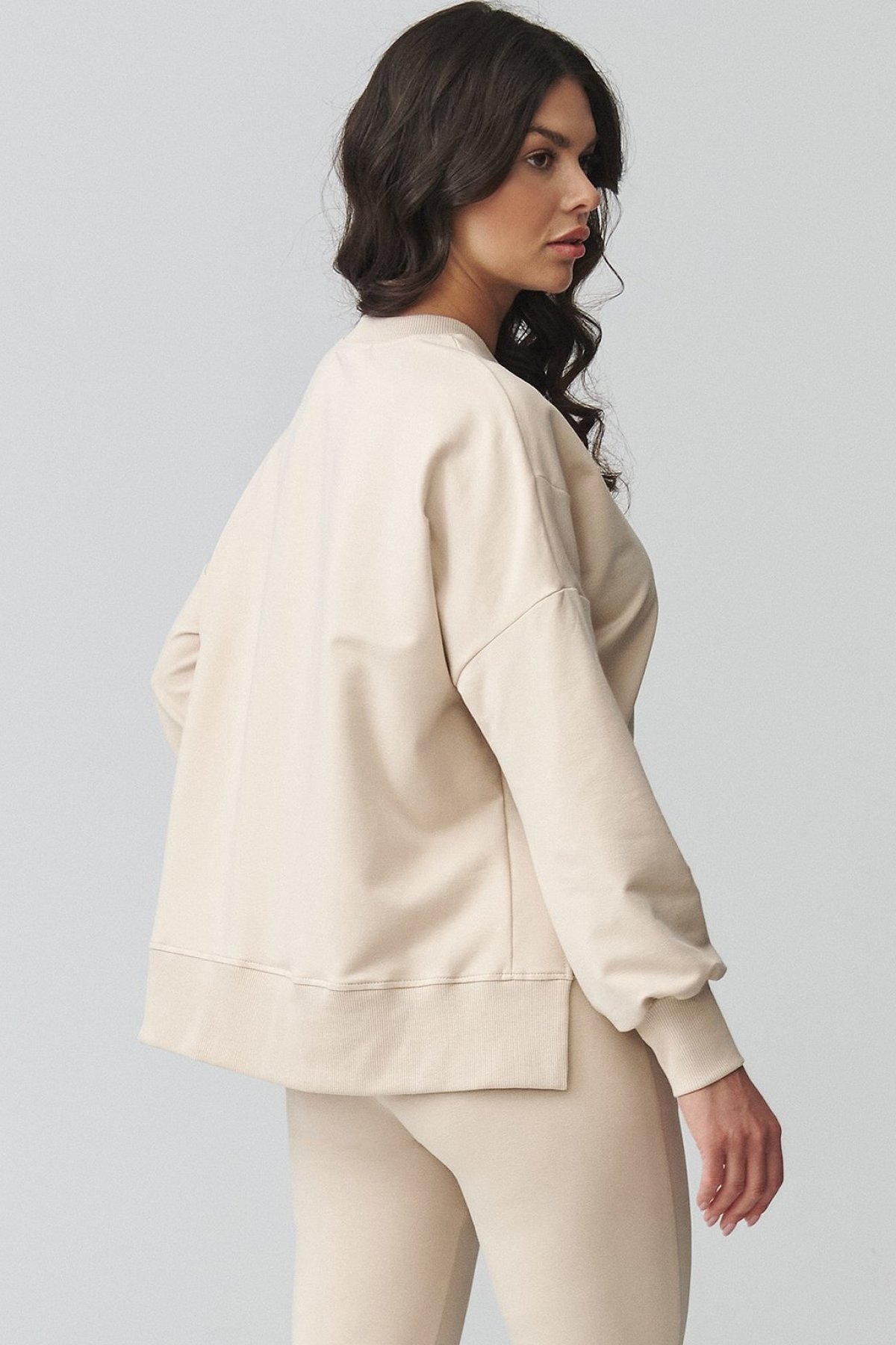Tento teplákový komplet světle béžové barvy spojuje uvolněný vršek a užší spodní díl, takže působí vyváženě a současně.