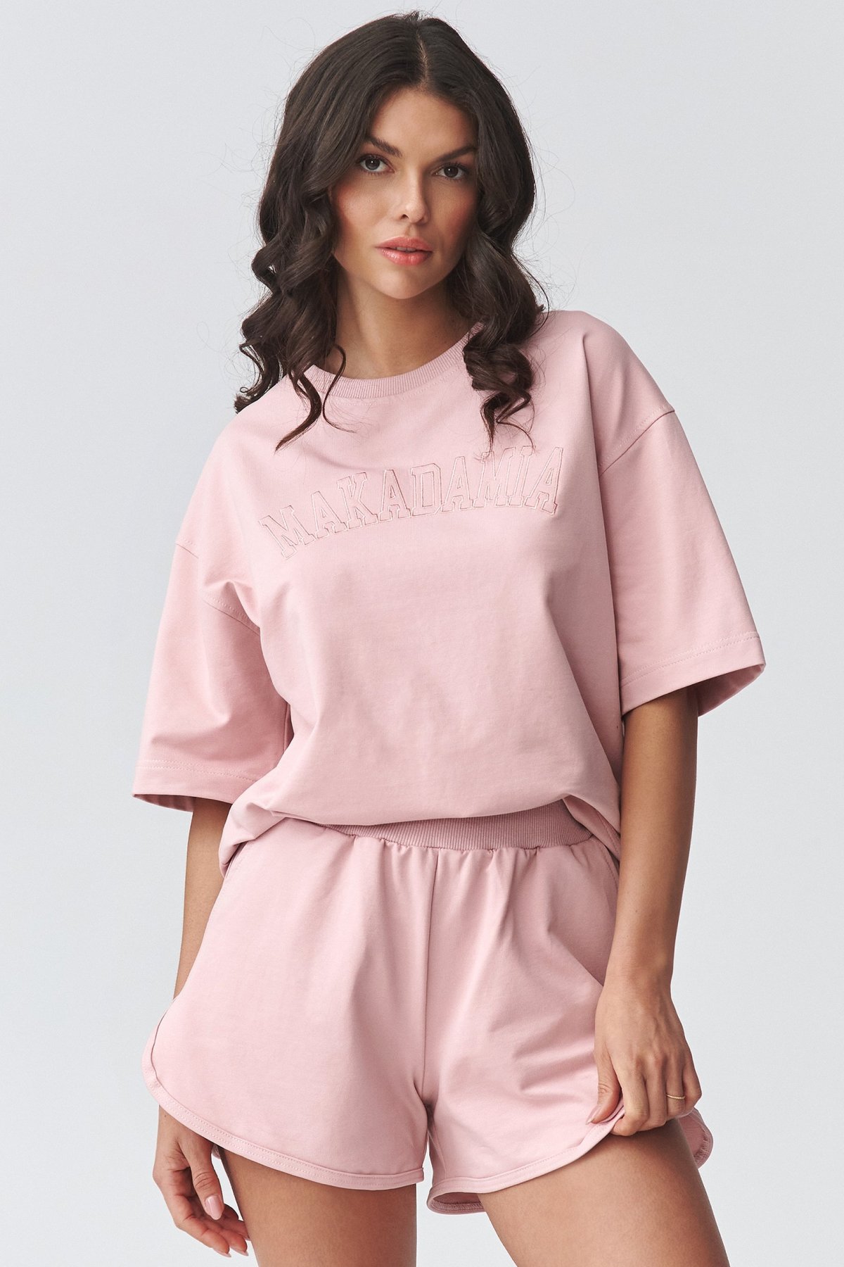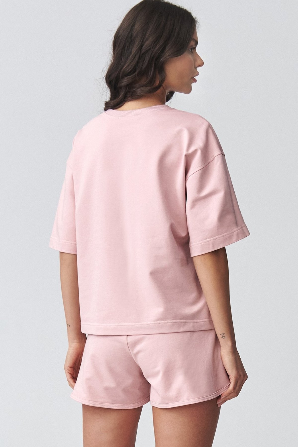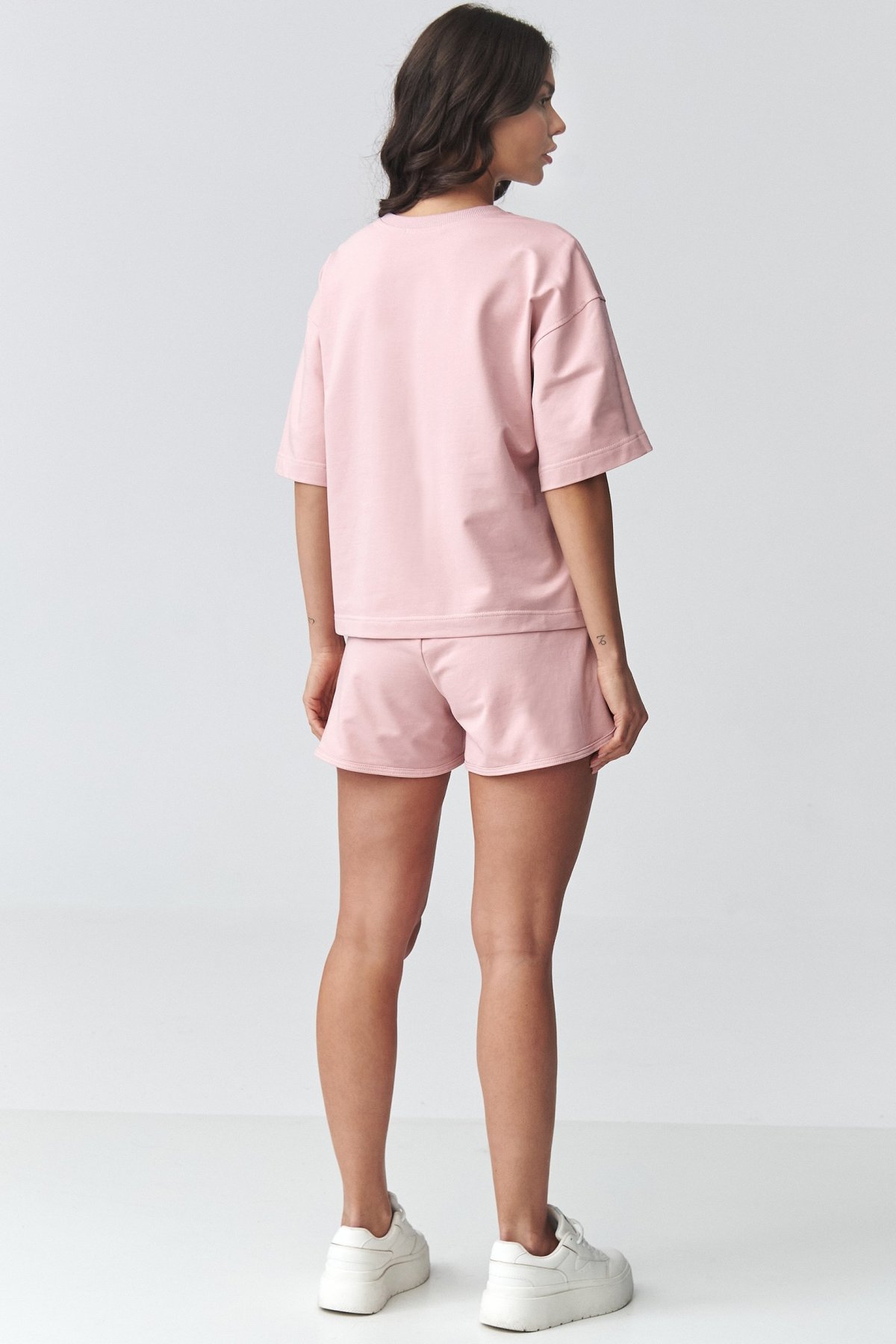 Dámský komplet pudrově růžové barvy s šortkami přináší pohodlný outfit na dny, kdy chcete vypadat upraveně a zároveň se cítit volně. Volnější tričko doplňují šortky s pružným pasem, které se lépe přizpůsobí postavě a zpříjemní nošení během dne. Celek působí čistě, moderně a snadno se nosí jako hotová stylizace. Hodí se na procházku, běžné pochůzky, domácí pohodu i letní cestování. Díky jednoduchému střihu můžete jednotlivé části kombinovat i samostatně a vytvářet další nenucené outfity. Tento komplet je praktickou alternativou ke klasické teplákové soupravě pro teplejší období.