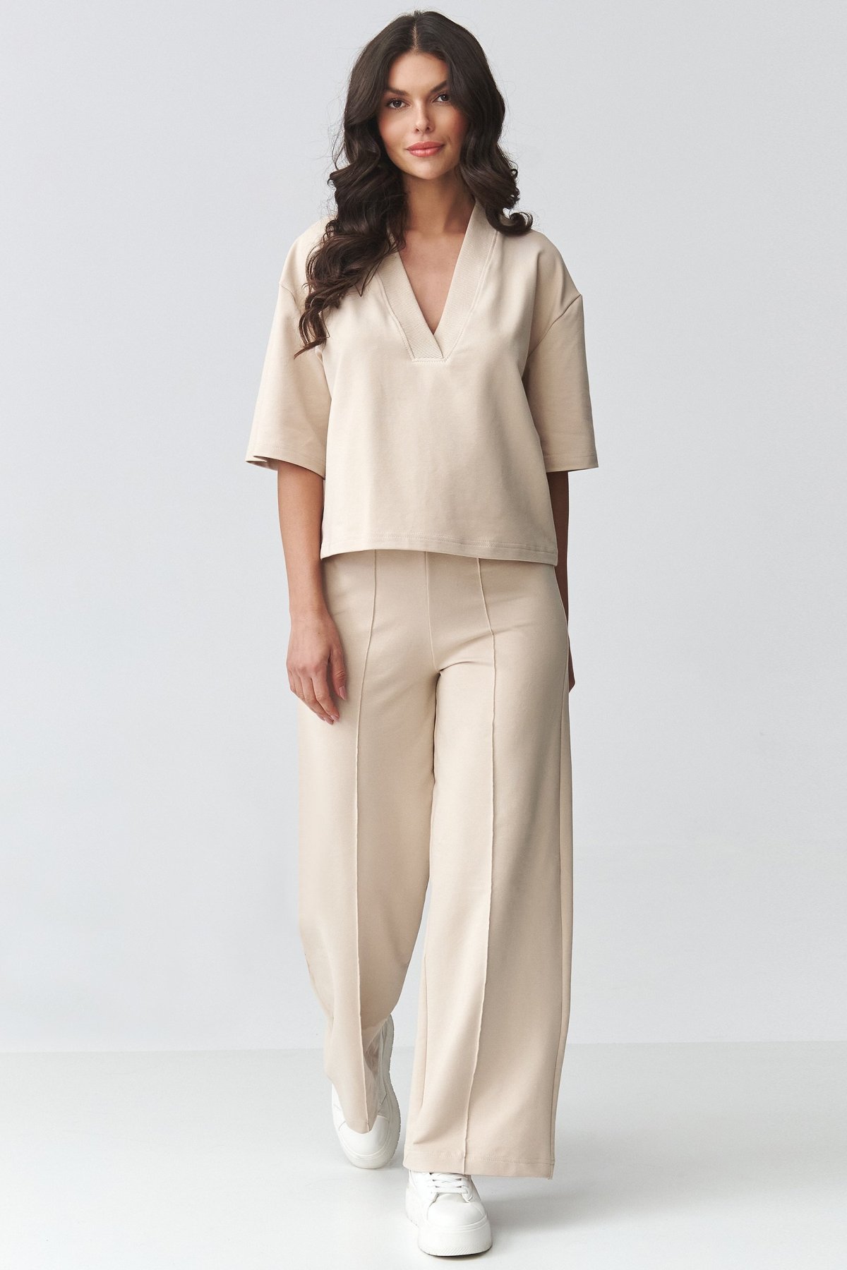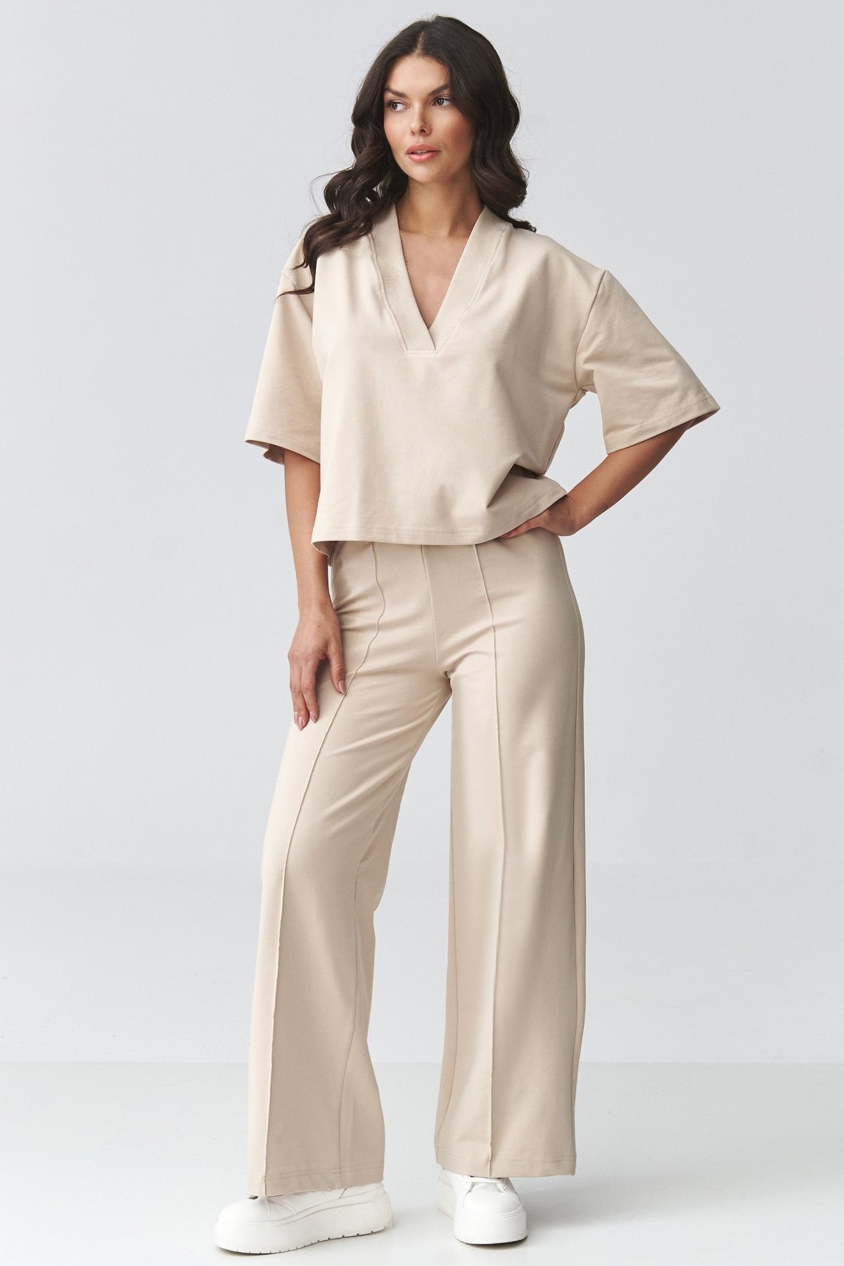 Horní díl má volný střih a výstřih do V, který jemně zvýrazní linii dekoltu a opticky prodlouží krk. Díky jednoduchému řešení působí čistě a snadno se kombinuje s doplňky. Kalhoty se širokými nohavicemi krásně prodlužují siluetu a dodávají outfitu lehkost. Volnější linie zajišťuje komfort při nošení a zároveň vytváří upravený, sofistikovaný vzhled.
