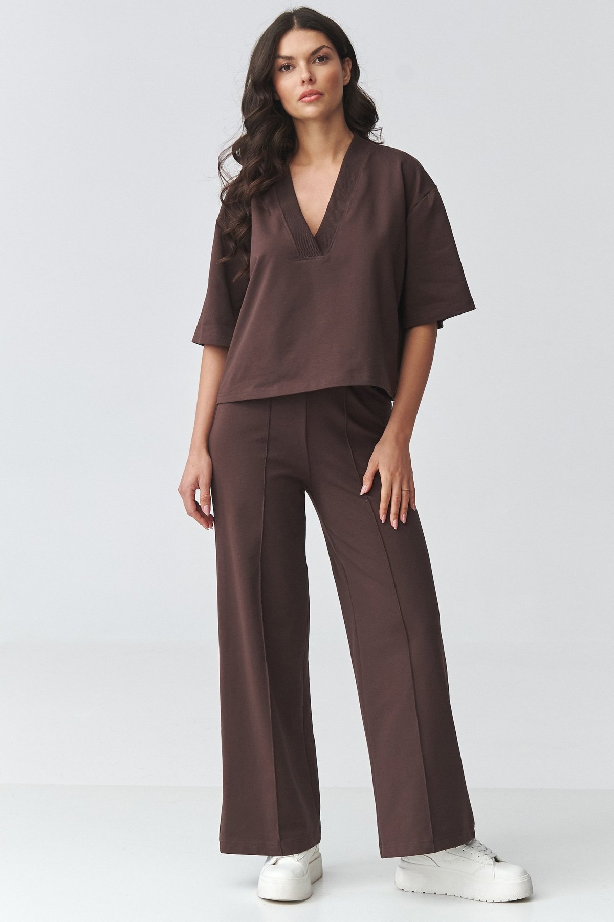 Horní díl má volný střih a výstřih do V, který jemně zvýrazní linii dekoltu a opticky prodlouží krk. Díky jednoduchému řešení působí čistě a snadno se kombinuje s doplňky. Kalhoty se širokými nohavicemi krásně prodlužují siluetu a dodávají outfitu lehkost. Volnější linie zajišťuje komfort při nošení a zároveň vytváří upravený, sofistikovaný vzhled.
