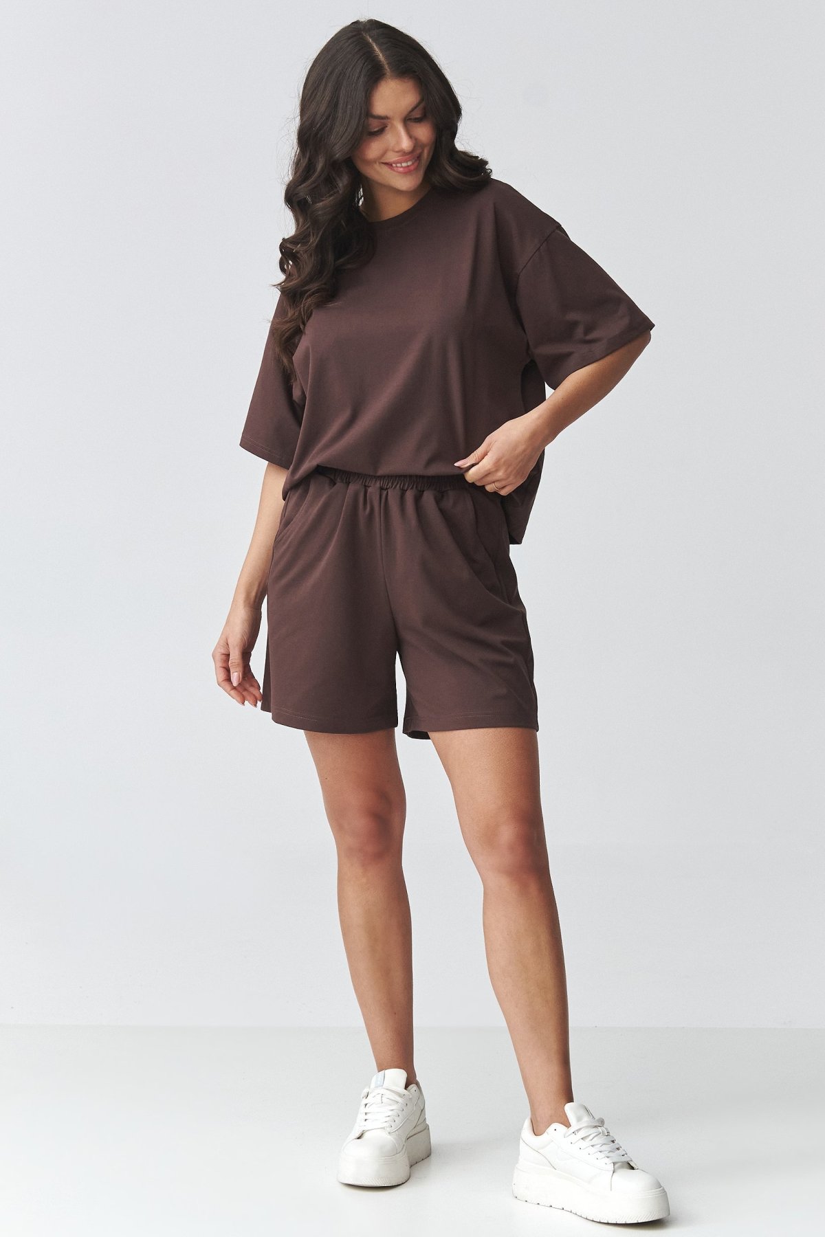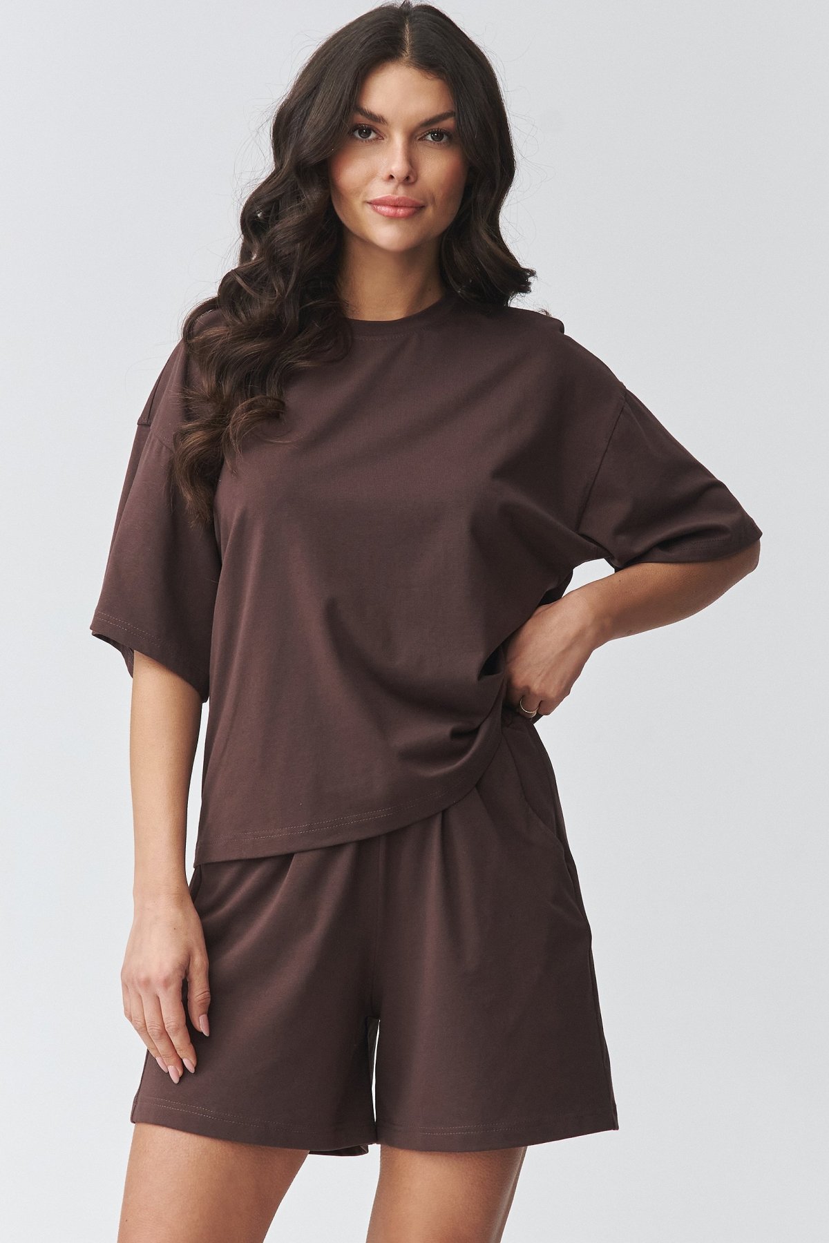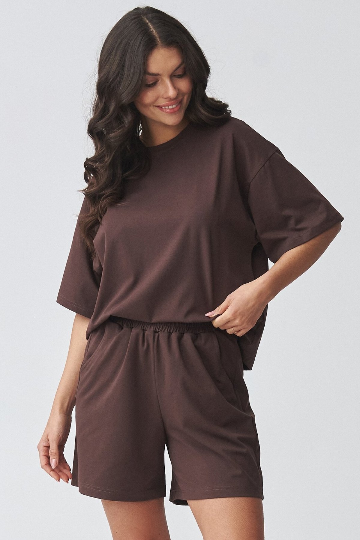 Dámský komplet tmavě hnědé barvy s volnější halenkou a šortkami. Model, ve kterém se budete cítit pohodlně od rána do večera.