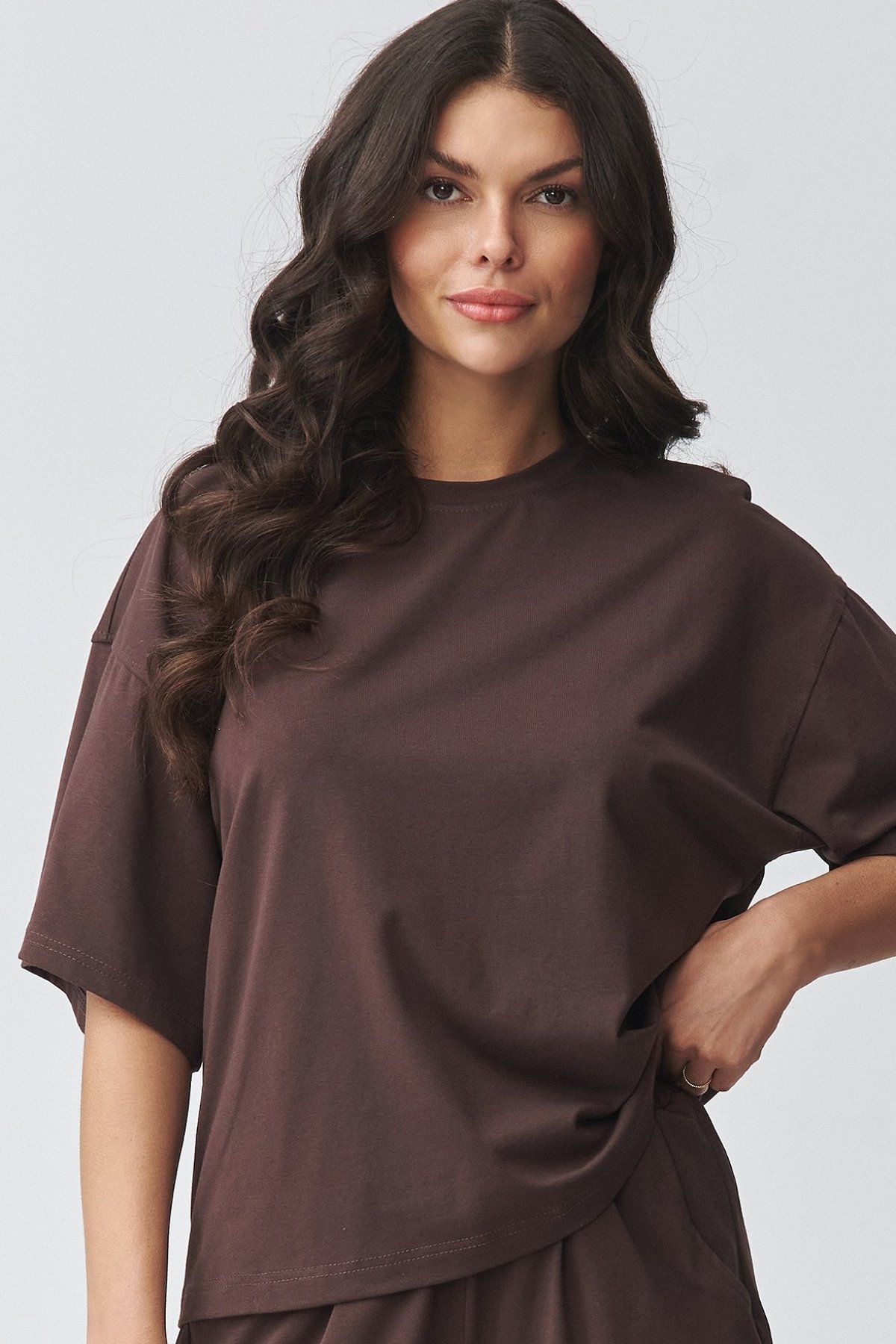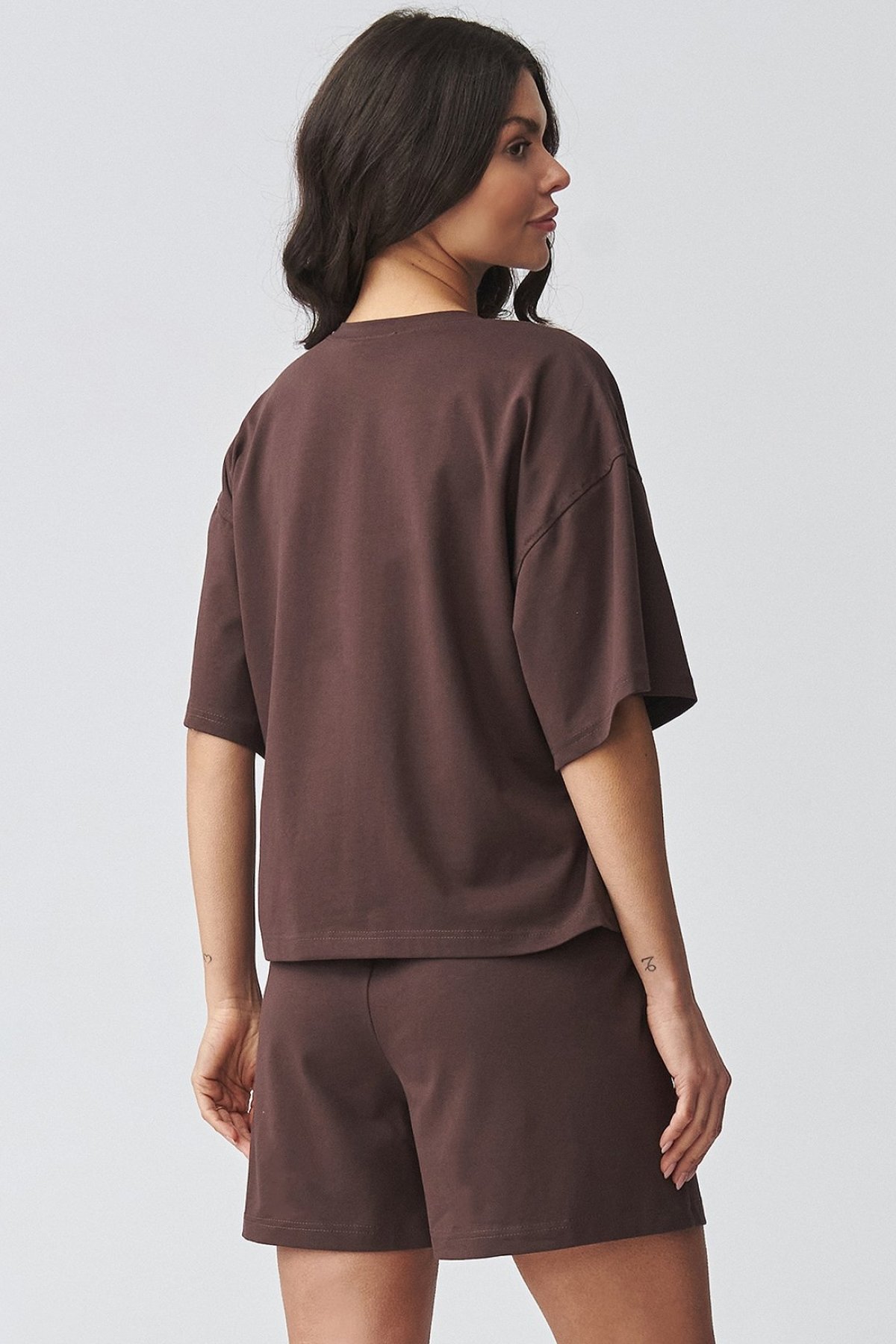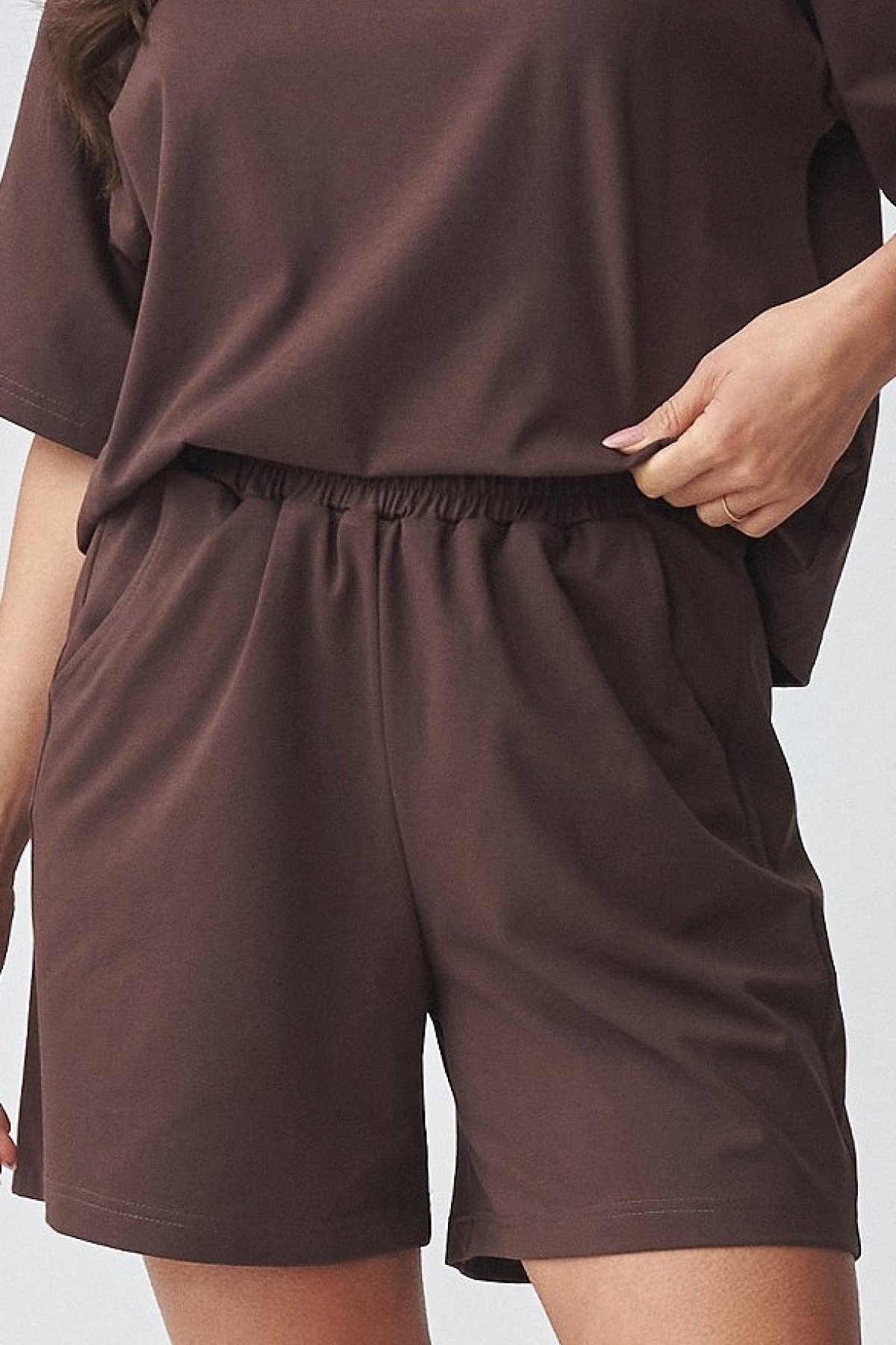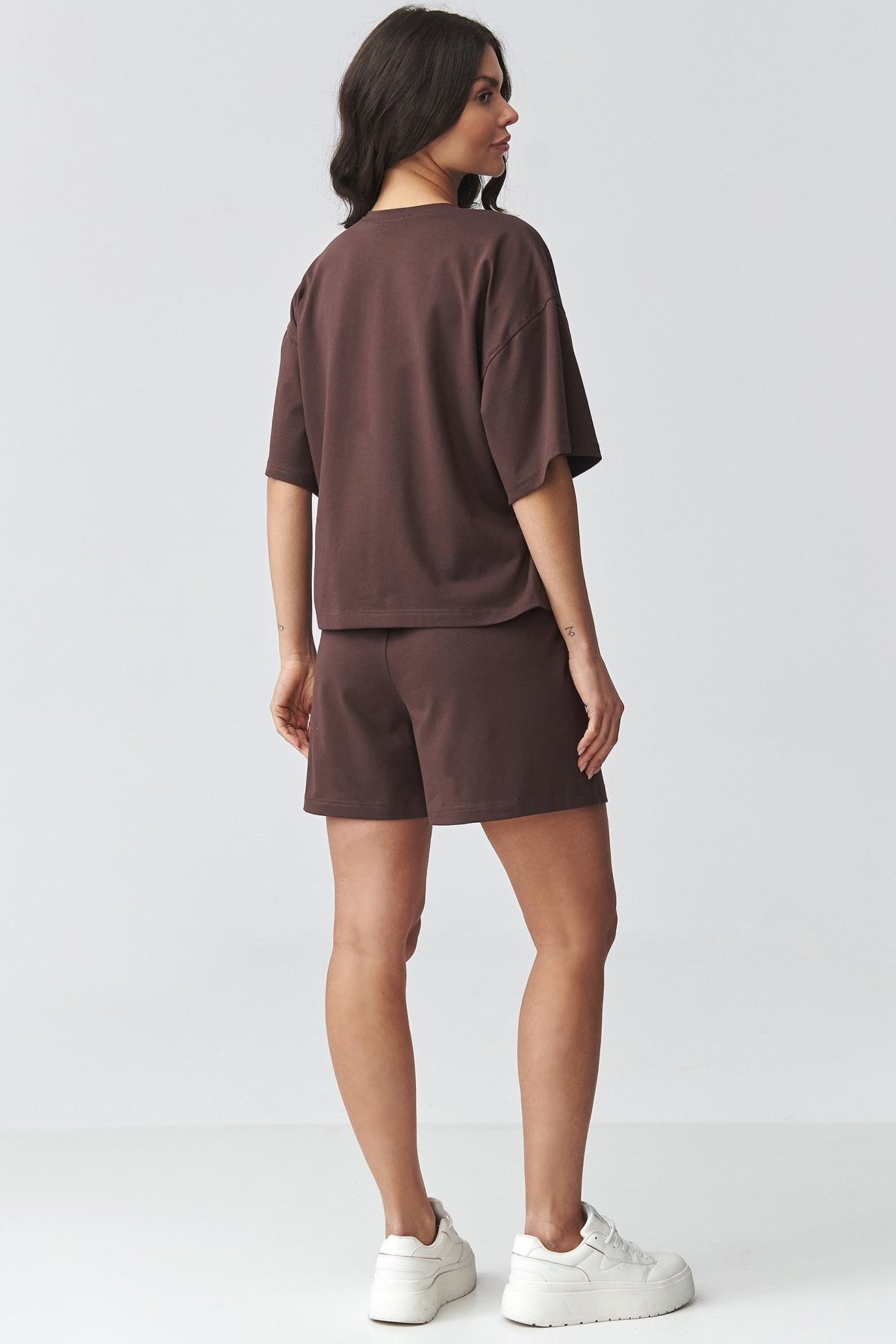 Dámský komplet tmavě hnědé barvy s volnější halenkou a šortkami. Model, ve kterém se budete cítit pohodlně od rána do večera.
