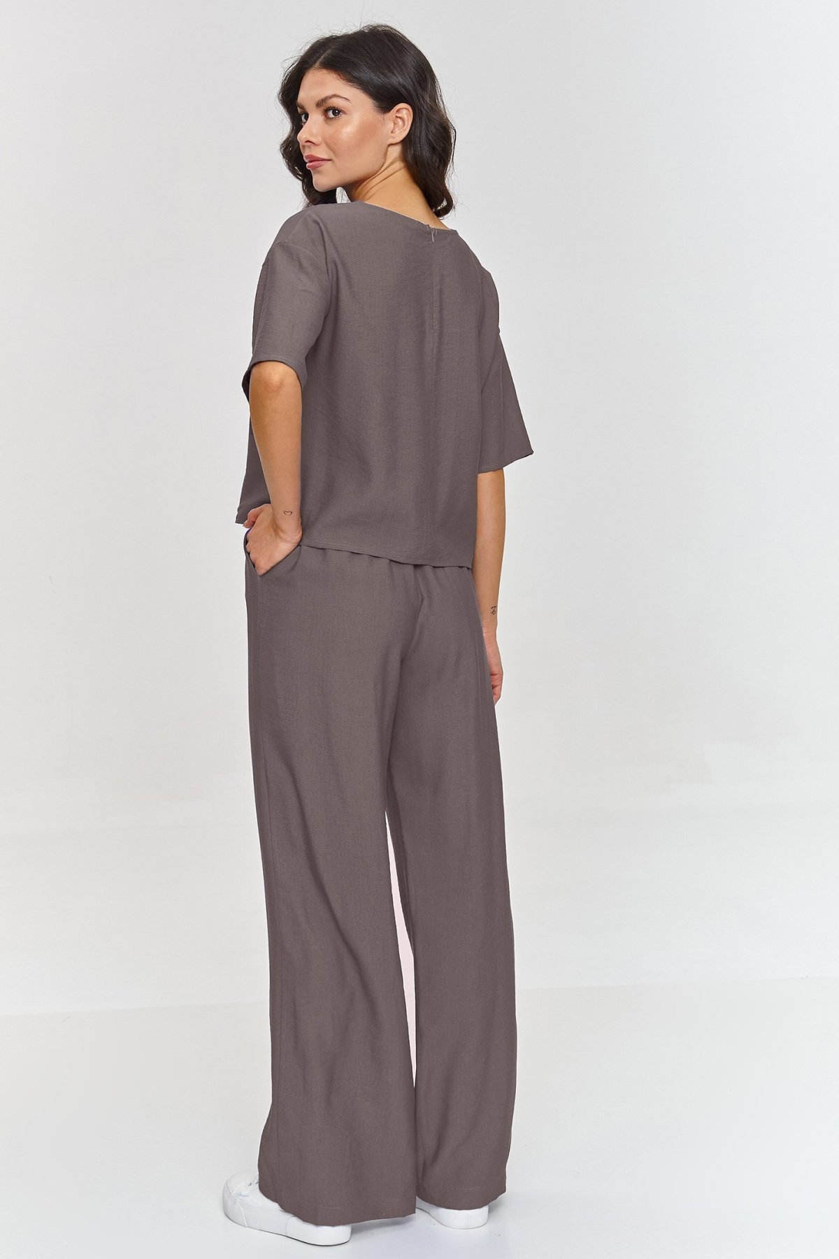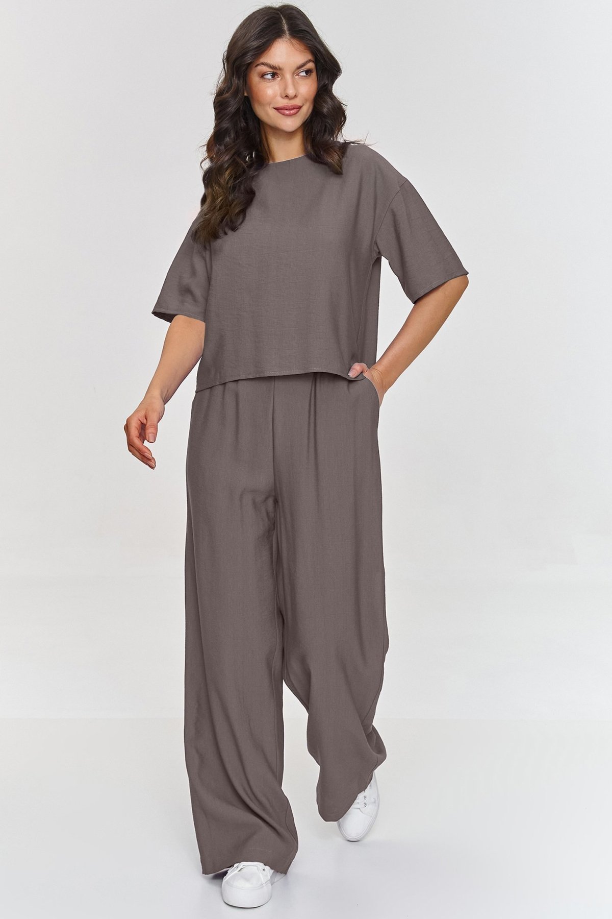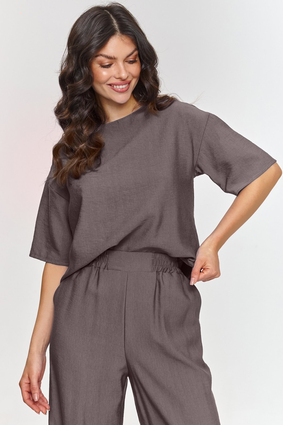 Volnější halenka s krabicovým střihem působí upraveně, ale nepůsobí strnule, zatímco široké kalhoty dodávají siluetě lehkost a plynulý pohyb. Krátké rukávy a jednoduchý střih horního dílu usnadňují kombinování s lodičkami, sandály i teniskami. Kalhoty s elastickým pasem se přizpůsobí postavě bez zbytečného tlaku a jejich prodloužená délka podtrhuje elegantní charakter celku. Materiál s efektem lnu působí vzdušně a vizuálně odlehčuje outfit, takže komplet využijete na schůzky, do města i na letní dny, kdy chcete vypadat upraveně a zároveň se cítit volně.