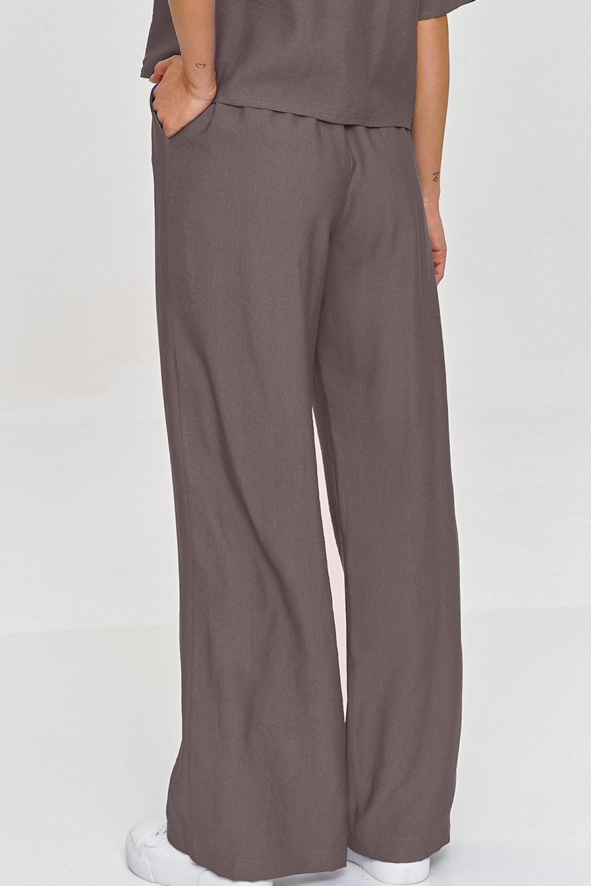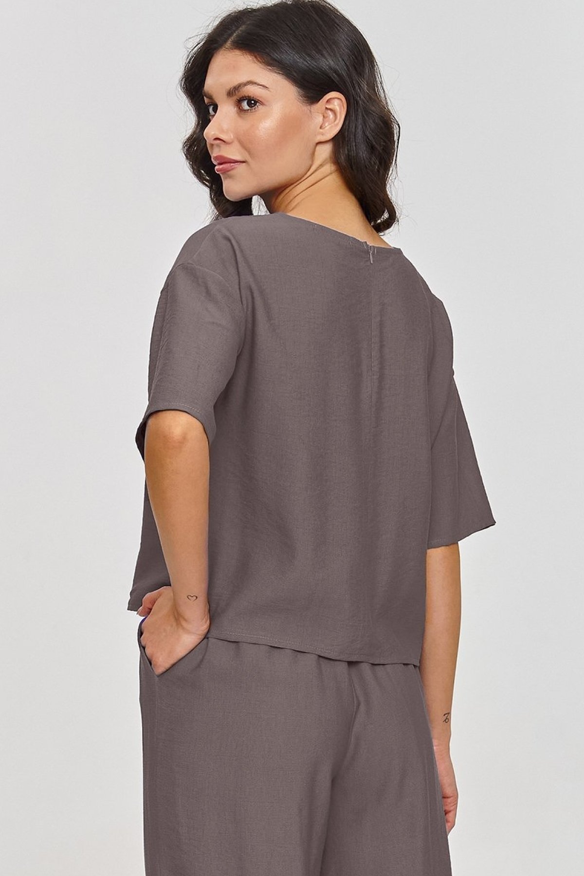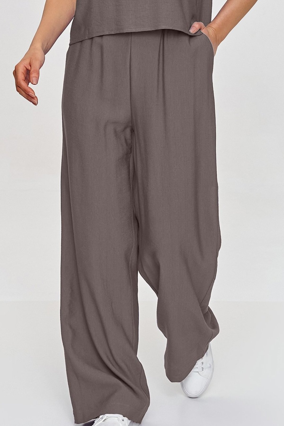 Volnější halenka s krabicovým střihem působí upraveně, ale nepůsobí strnule, zatímco široké kalhoty dodávají siluetě lehkost a plynulý pohyb. Krátké rukávy a jednoduchý střih horního dílu usnadňují kombinování s lodičkami, sandály i teniskami. Kalhoty s elastickým pasem se přizpůsobí postavě bez zbytečného tlaku a jejich prodloužená délka podtrhuje elegantní charakter celku. Materiál s efektem lnu působí vzdušně a vizuálně odlehčuje outfit, takže komplet využijete na schůzky, do města i na letní dny, kdy chcete vypadat upraveně a zároveň se cítit volně.