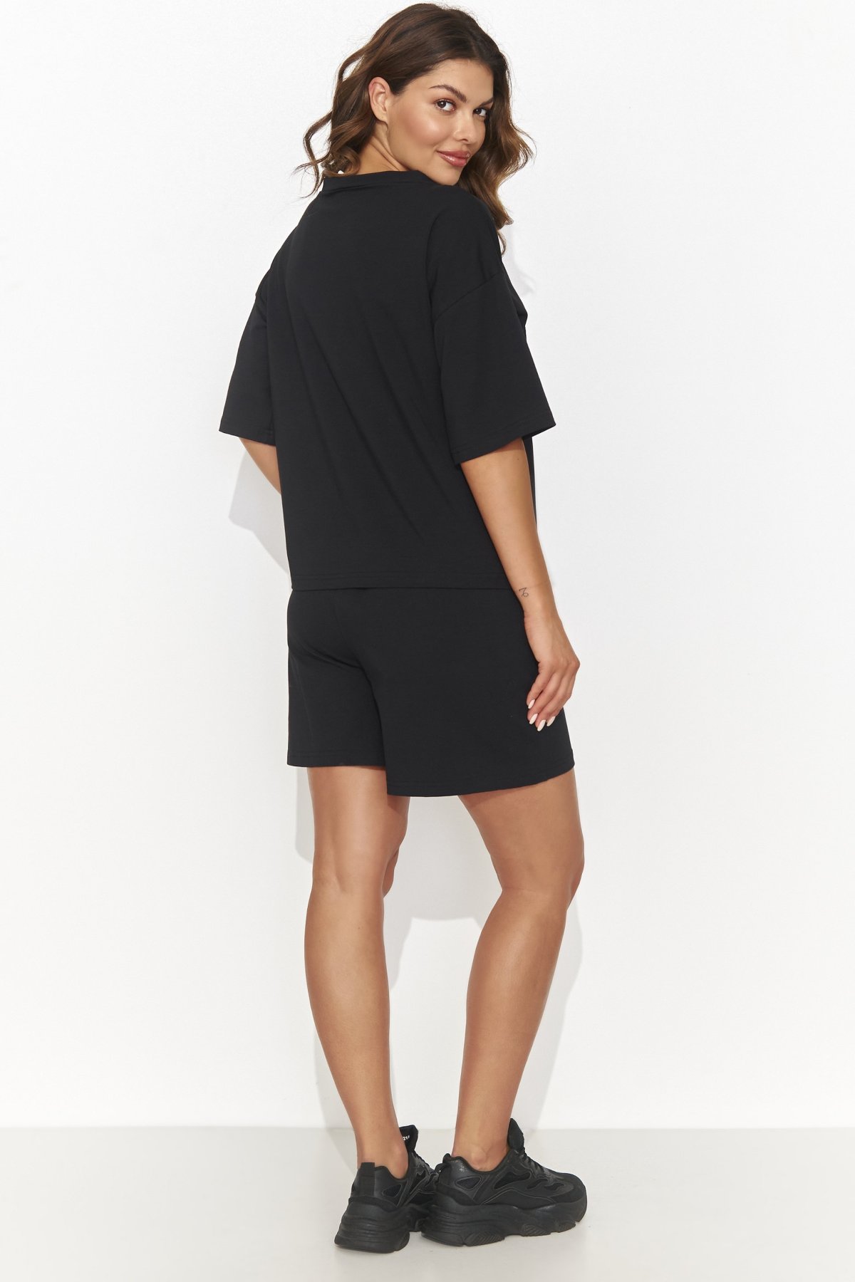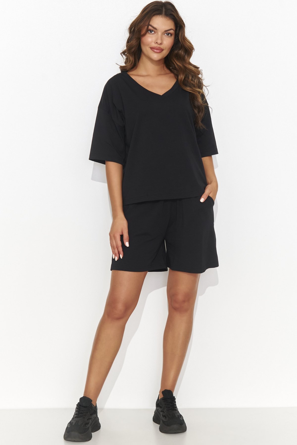 Dámská souprava Numinou NU463 v černé barvě je dokonalým spojením pohodlí a stylu. Vyrobena z lehké a jemné bavlny, příjemně chladí a neomezuje v pohybu. Volný top s výstřihem do „V“ a krátkými rozšířenými rukávy dodává outfitu ženský a elegantní nádech. Ležérní šortky s kapsami vytvářejí uvolněný, sportovně-elegantní vzhled, který se hodí jak na volný čas, tak i na neformální setkání. Celek působí moderně, přirozeně a velmi žensky.