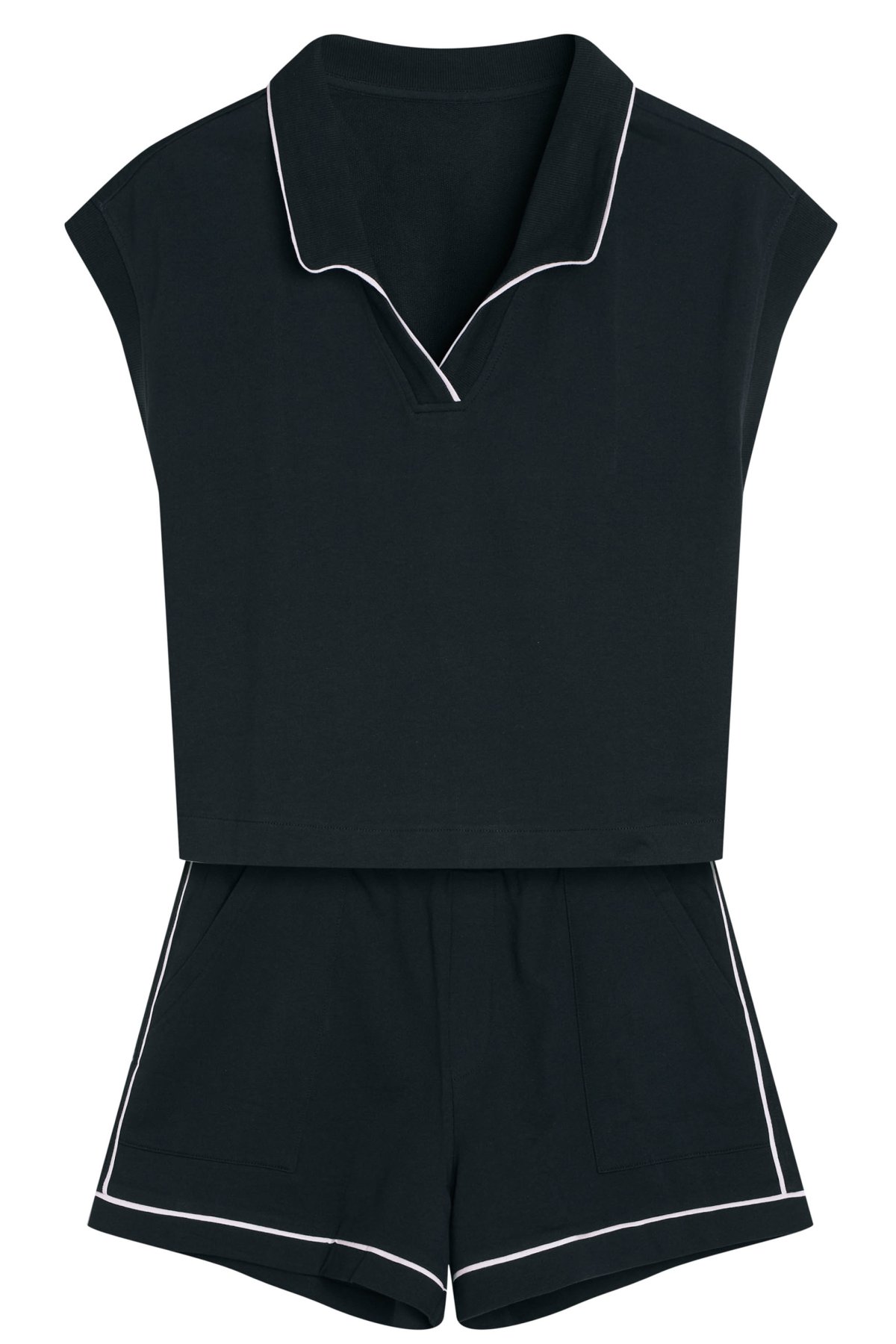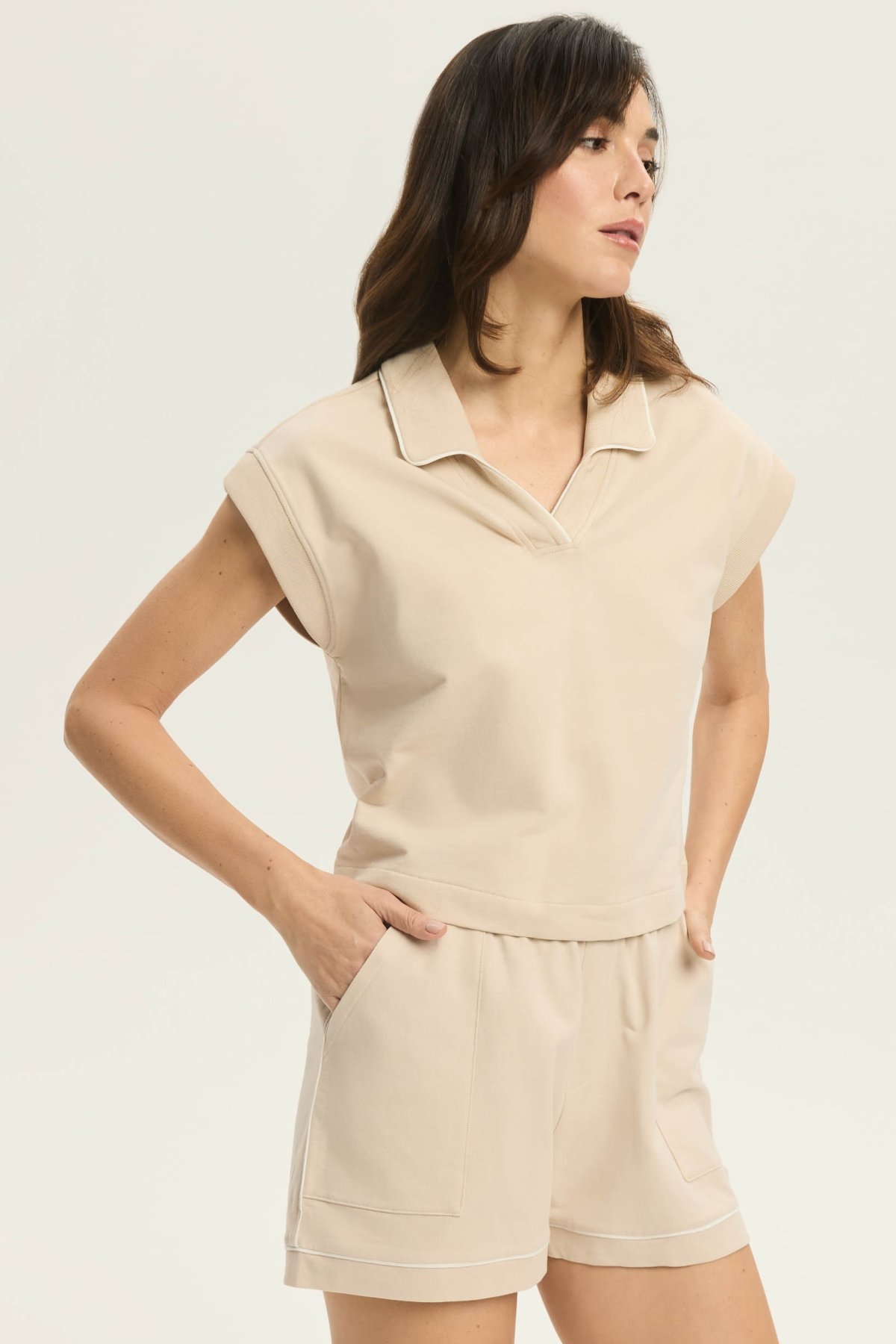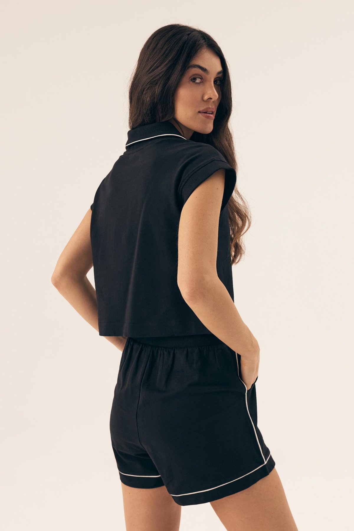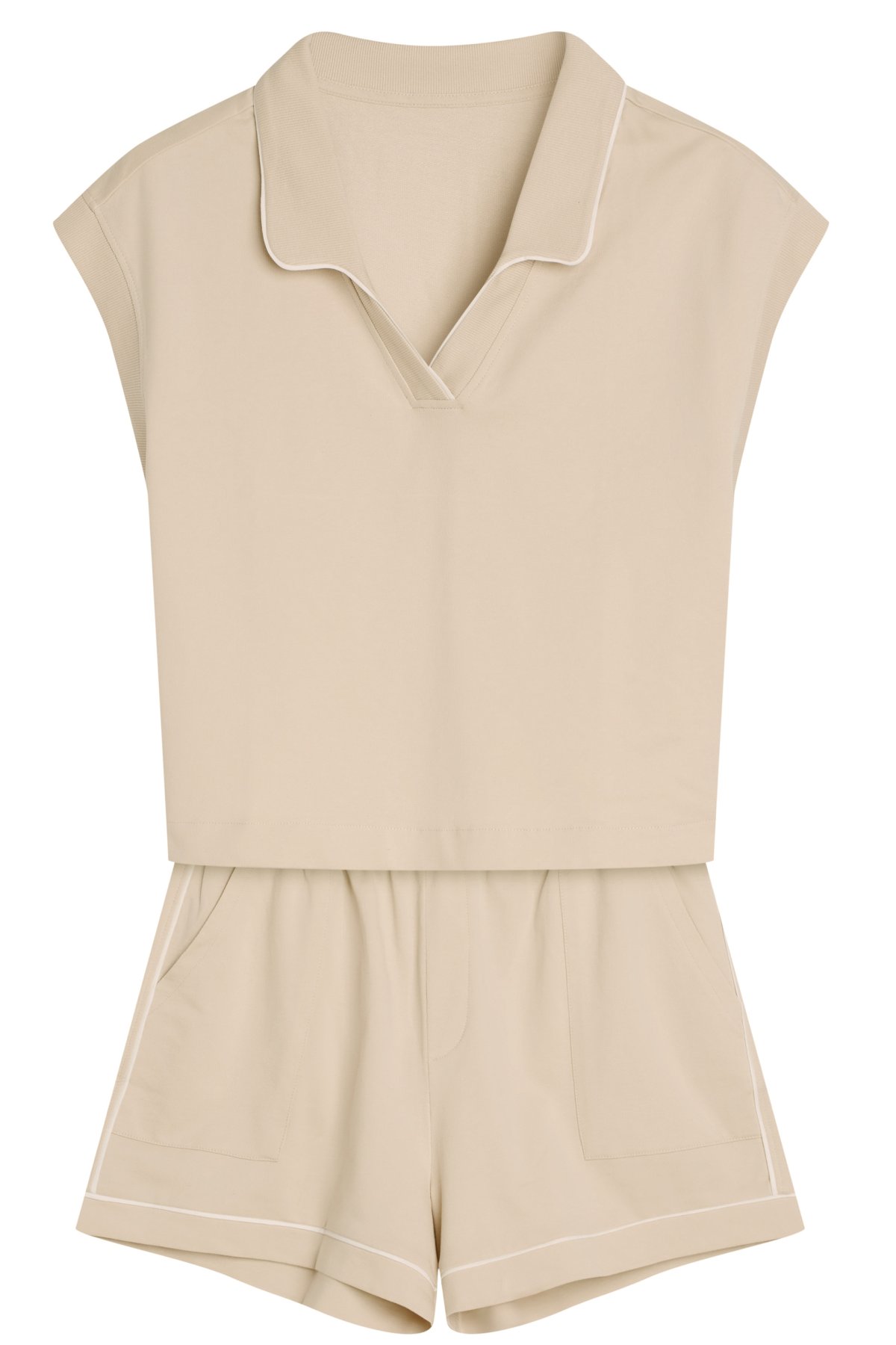 Dámský komplet Remi působí lehce a svěže, zatímco lemování podél límečku, rukávů a nohavic mu dodává výraznější, grafický charakter. Polo tričko s krátkým rukávem a otevřeným výstřihem jemně splývá přes ramena a podtrhuje jeho uvolněný styl. Kraťasy mají lehce zaoblené nohavice a pohodlnou gumu v pase, takže se příjemně nosí po celý den. Tento komplet se hodí na domácí odpočinek, letní procházku i klidné ranní posezení u kávy – je praktický, ale zároveň esteticky čistý a promyšlený.