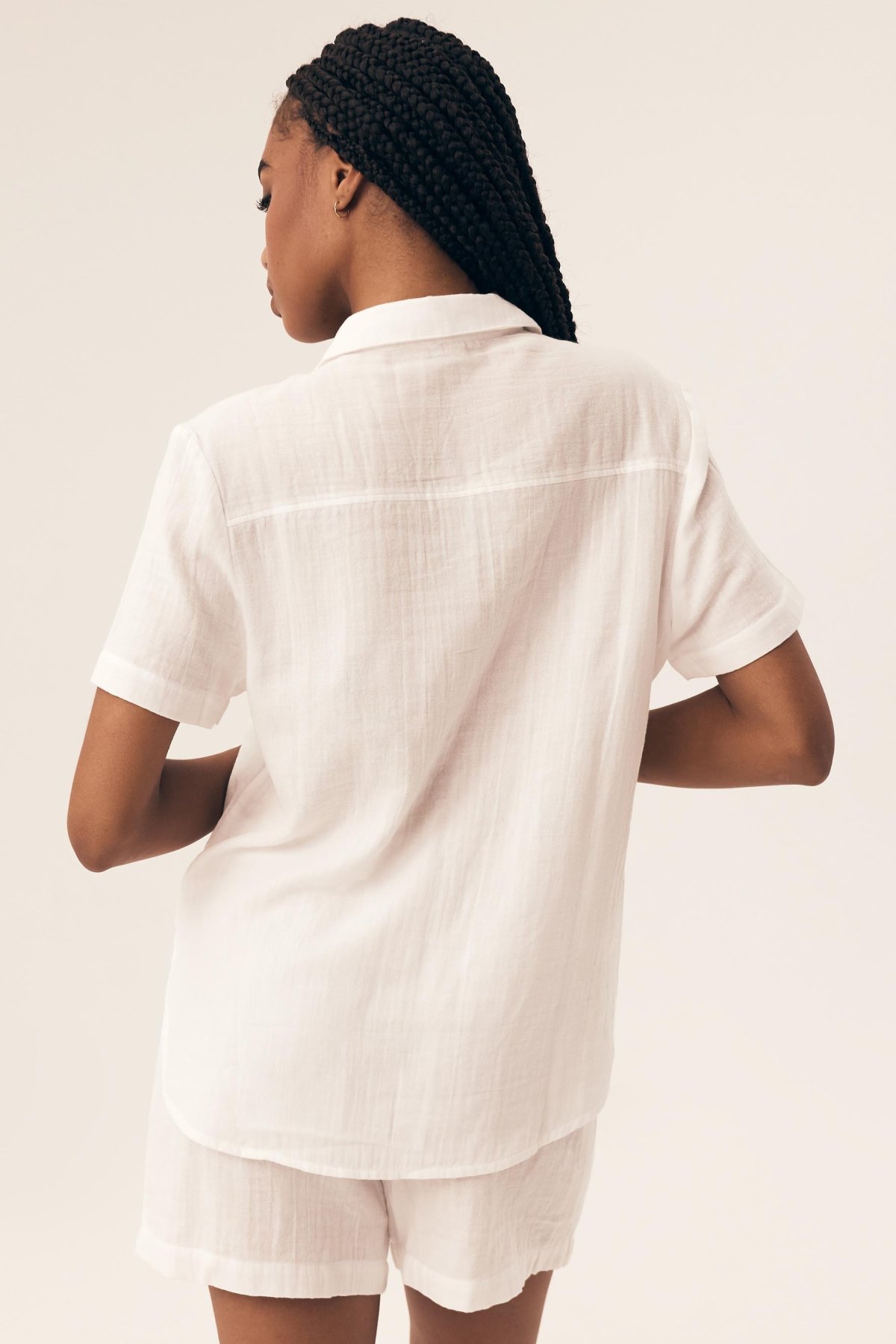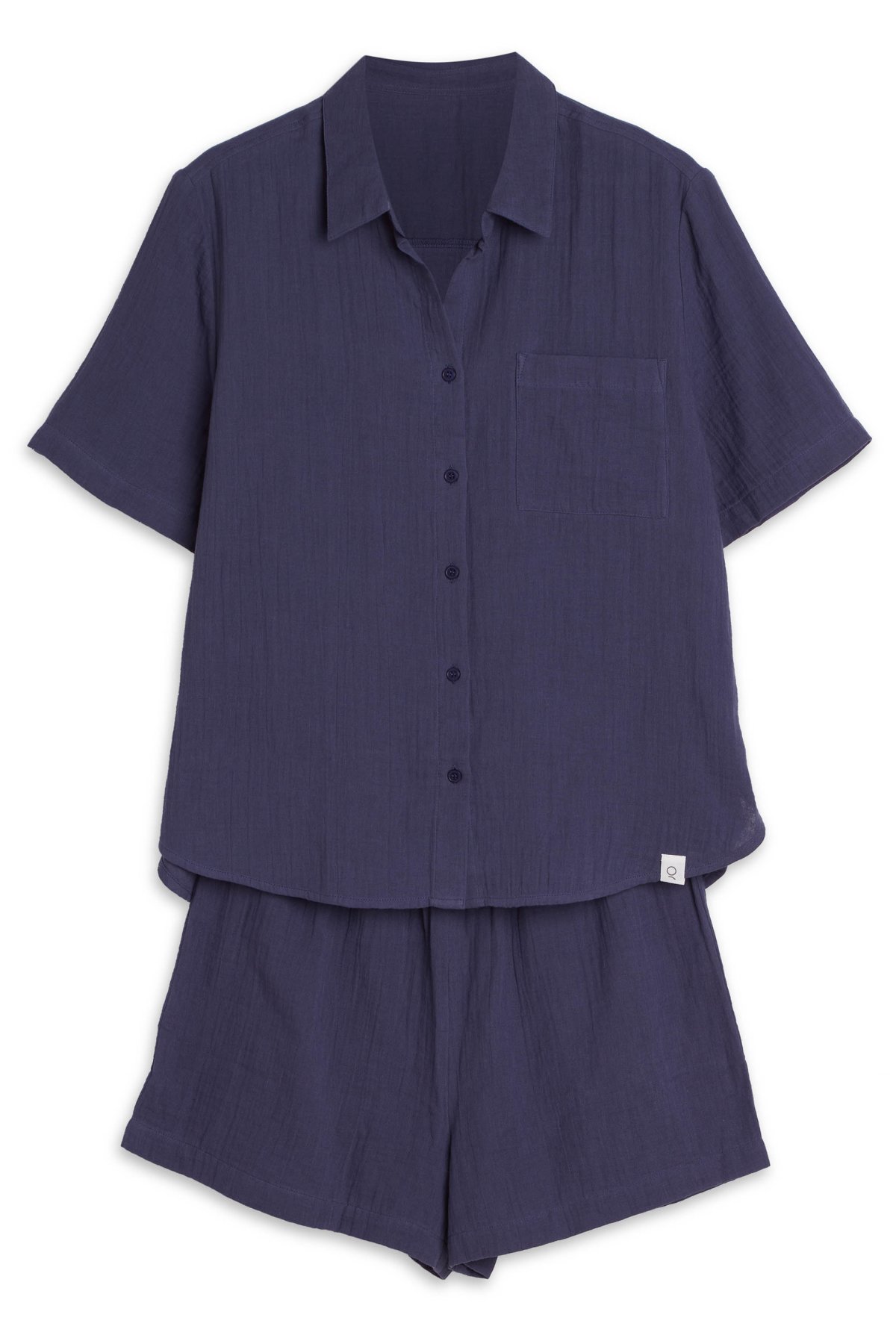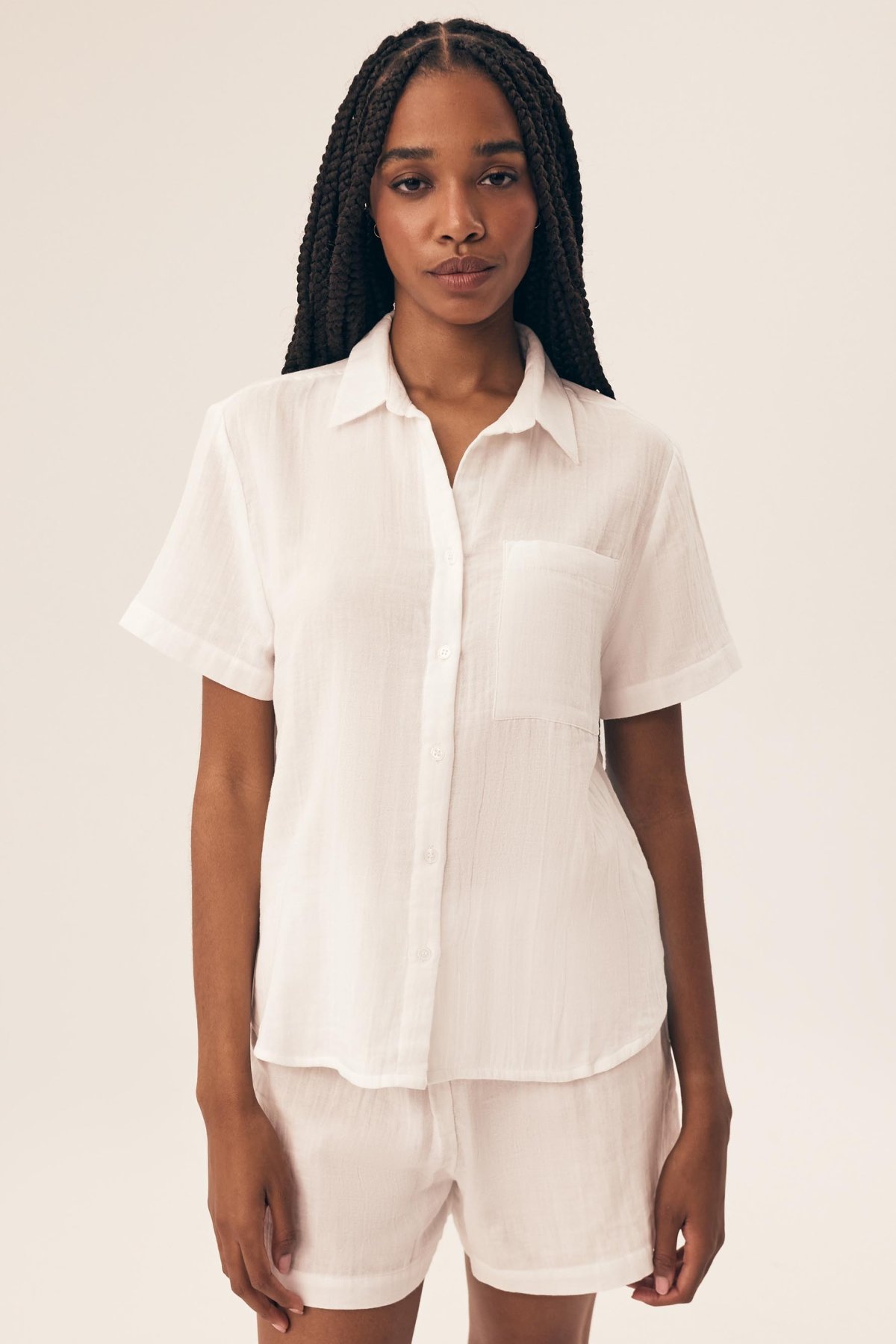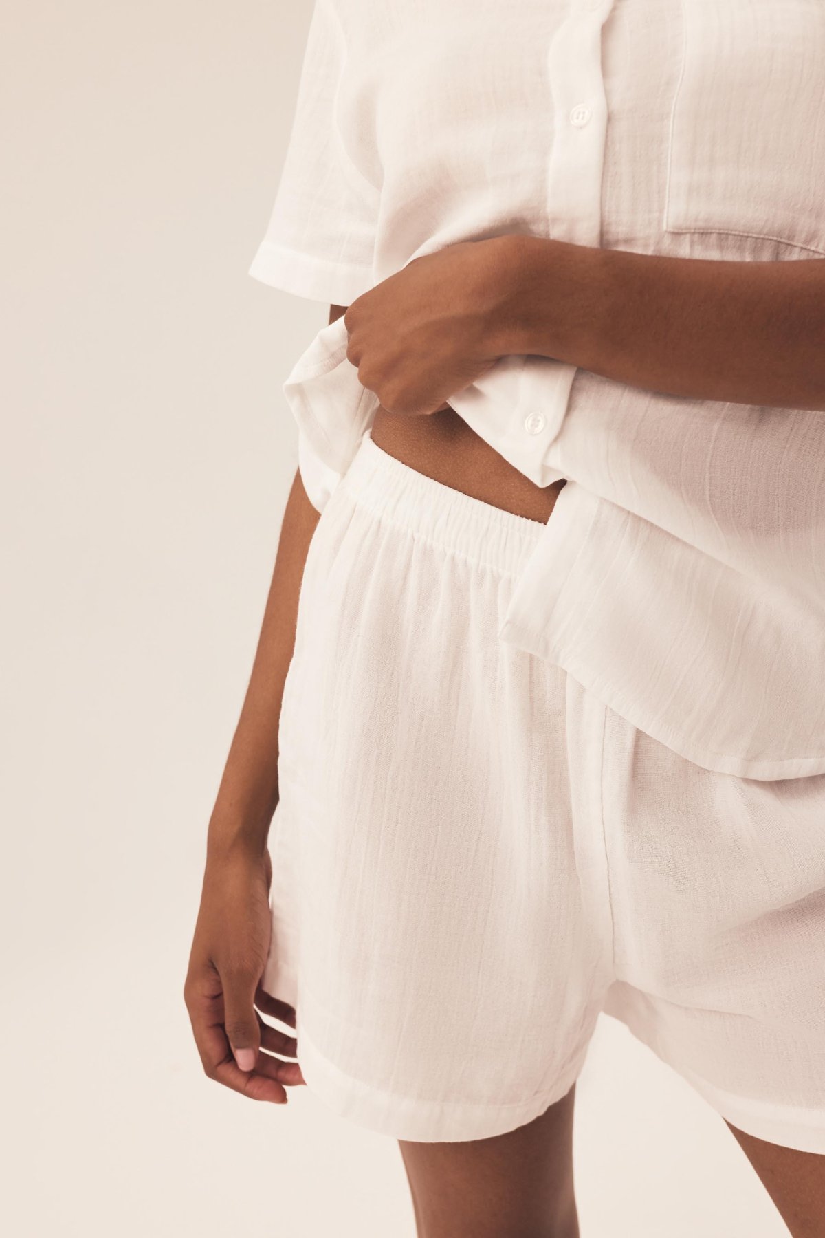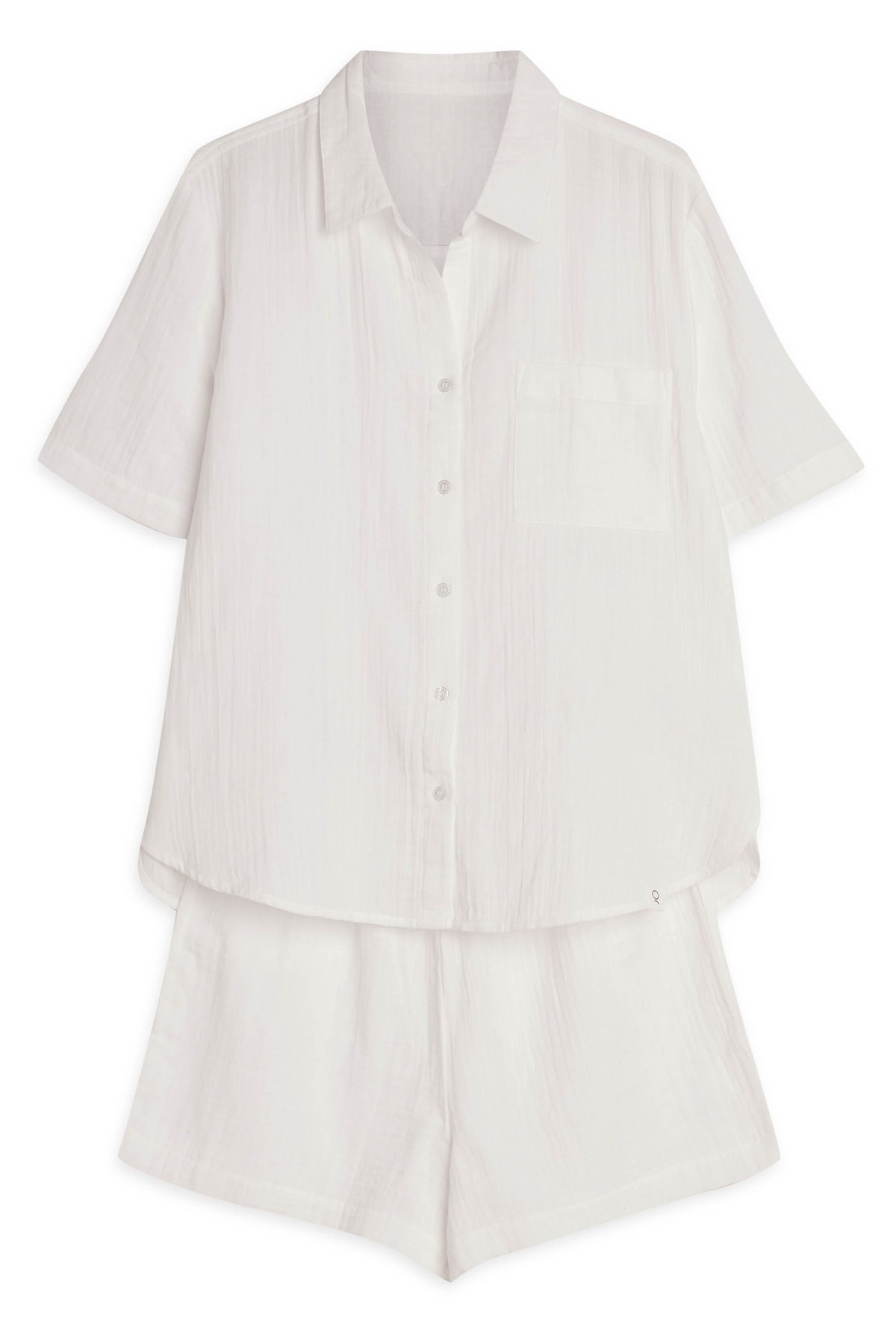Lehký komplet Ryokan je příjemnou volbou na teplé dny i pohodové chvíle doma. Tvoří ho košile s krátkým rukávem a volnější šortky s pružným pasem. 100% bavlna je vzdušná, příjemná na těle a díky jemně strukturovanému materiálu působí celý komplet lehce a svěže. Bílá barva podtrhuje čistý, nadčasový vzhled.