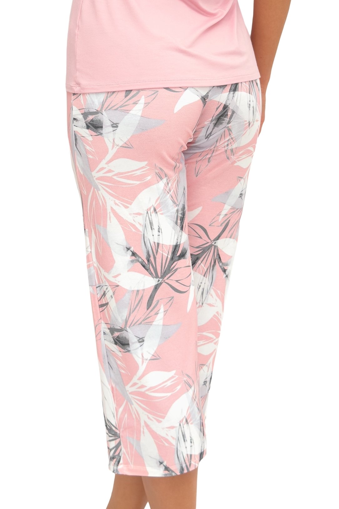 Model Evita ve 3/4 délce kombinuje pohodlí přírodně působící viskózy s jemnými ženskými detaily. Materiál je lehký, prodyšný a pružný, takže se přizpůsobí postavě bez omezení pohybu. Vrchní díl zdobí krajka u dekoltu i na koncích rukávů, což dodává pyžamu elegantní a romantický nádech. Mírně delší rukáv působí vyváženě a je vhodný i na přechodné období. Spodní část tvoří kalhoty s 3/4 délkou v jemném květinovém vzoru. Pohodlný střih a pružný pas zajišťují komfort při spánku i během domácího odpočinku.