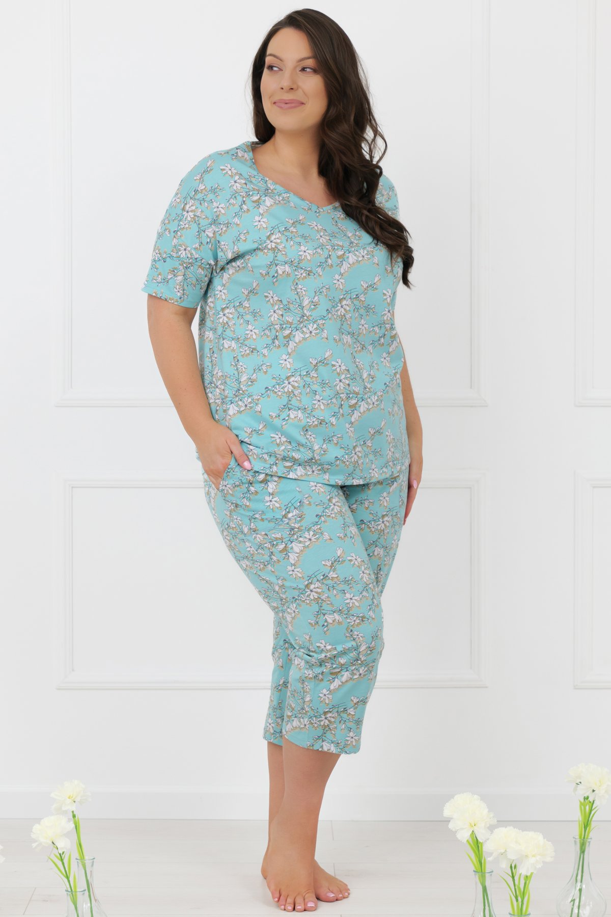 Pyžamo je vhodné i pro plnější postavy – střih je navržen tak, aby poskytoval komfort bez omezení. Výrazný, ženský vzor dodává modelu osobitý charakter a krásně vynikne na různých typech postavy.