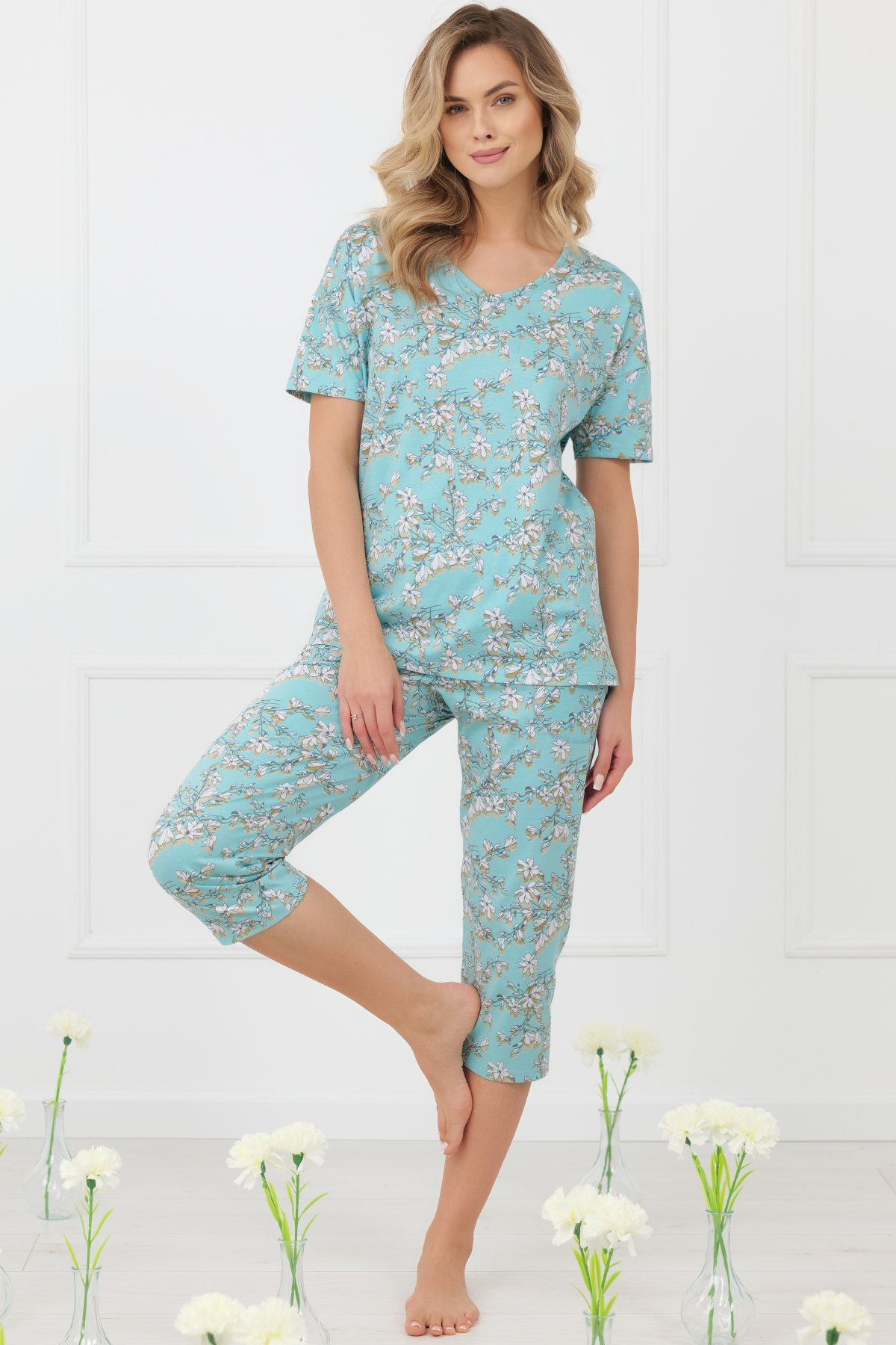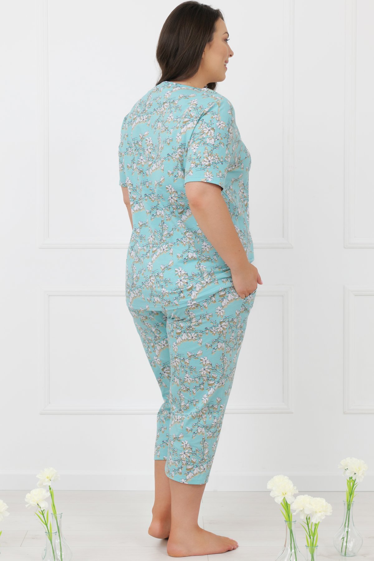 Horní díl má klasický střih s krátkým rukávem a lichotivým výstřihem do V. Kalhoty ve 3/4 délce doplňují praktické kapsy a pohodlný pas, který netlačí. Celý komplet zdobí výrazný květinový motiv inspirovaný atmosférou japonských zahrad a kvetoucích sakur.