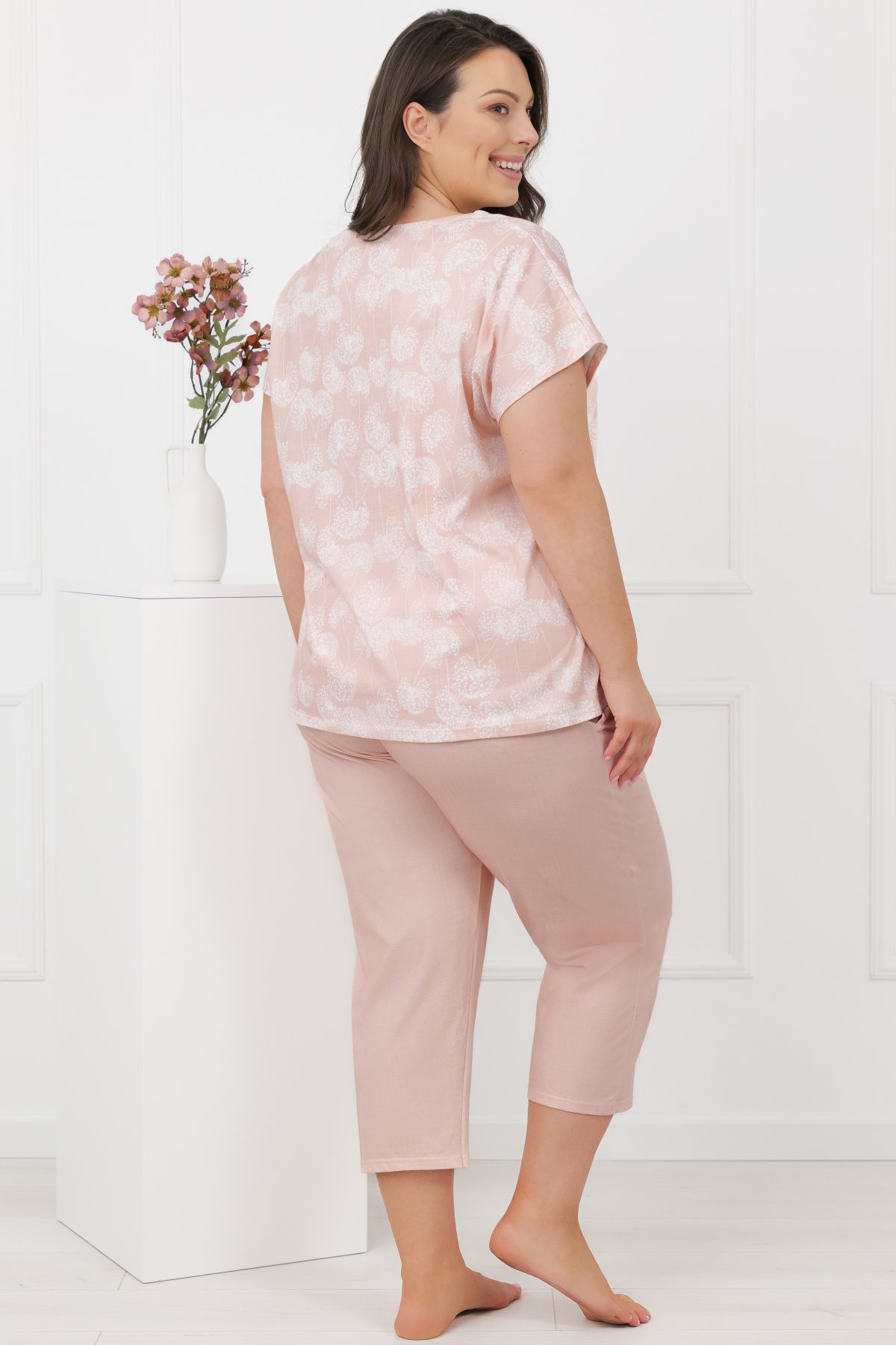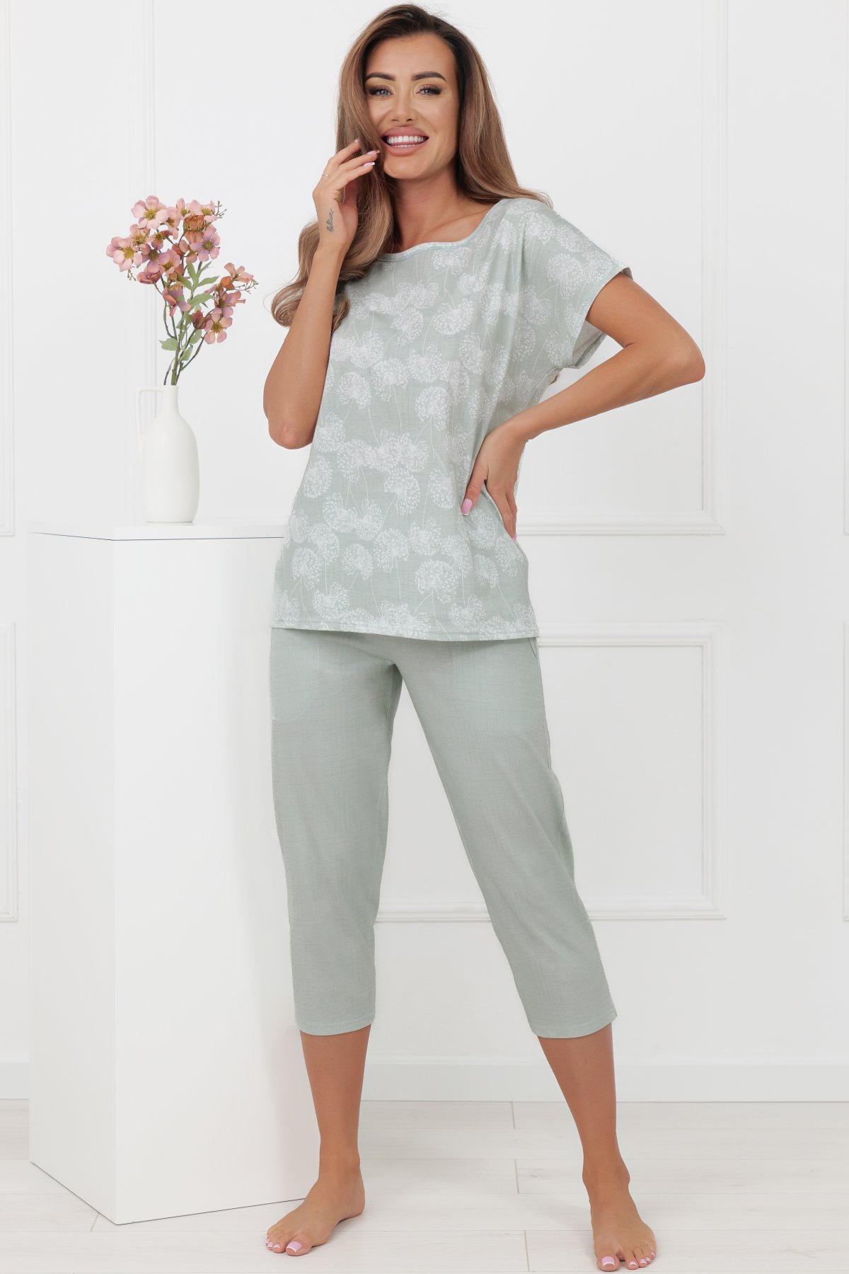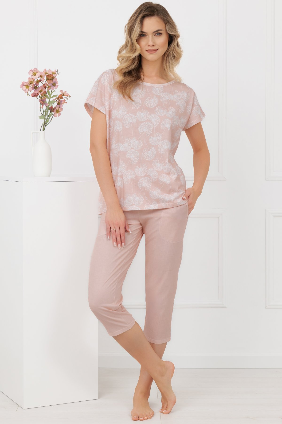 Horní díl má volnější střih a elegantní lodičkový výstřih, který působí lehce a přirozeně. Motiv pampelišek dodává modelu něžný detail, aniž by narušoval jeho minimalistický charakter. Kalhoty ve 3/4 délce mají klasickou linii a praktické kapsy, které zvyšují komfort při nošení. Přírodní bavlna je prodyšná, měkká a vhodná pro celoroční použití. Pyžamo se příjemně nosí při spánku i během domácího odpočinku.