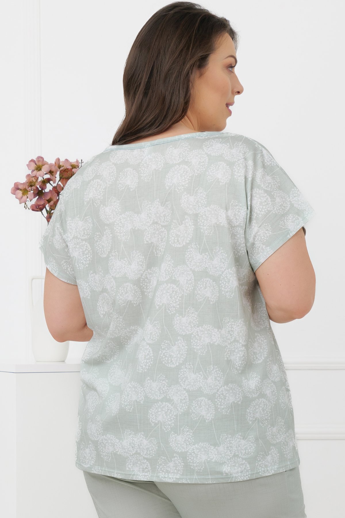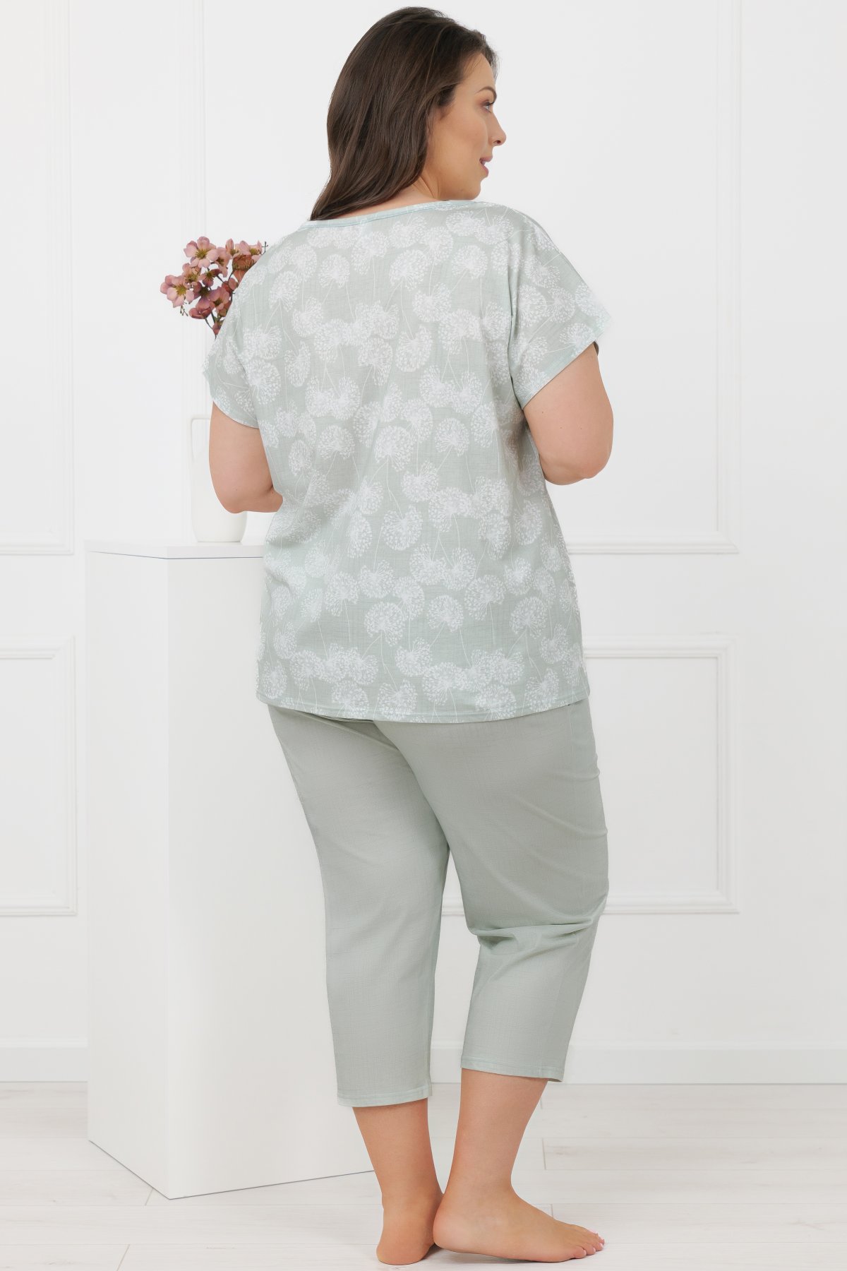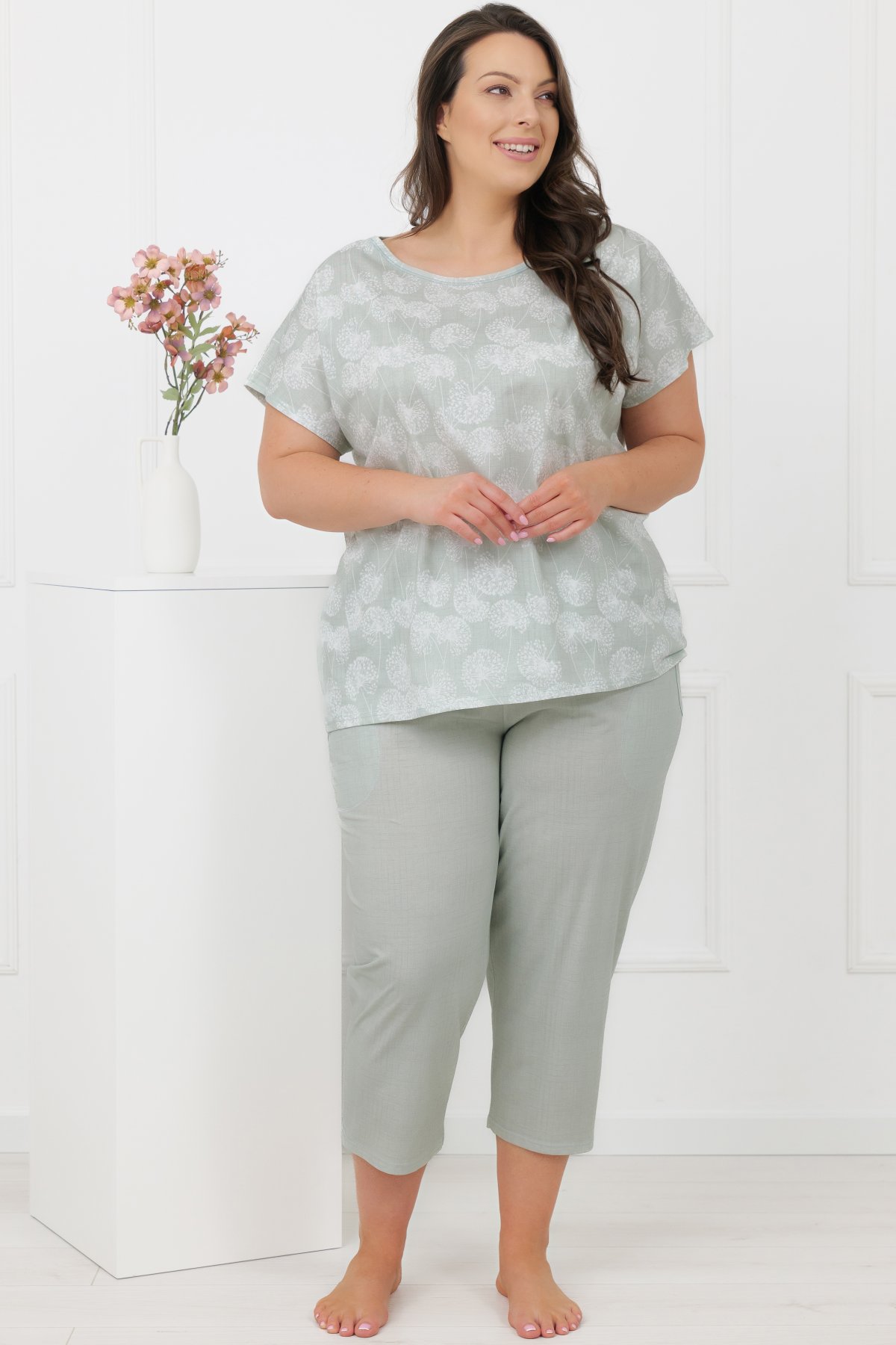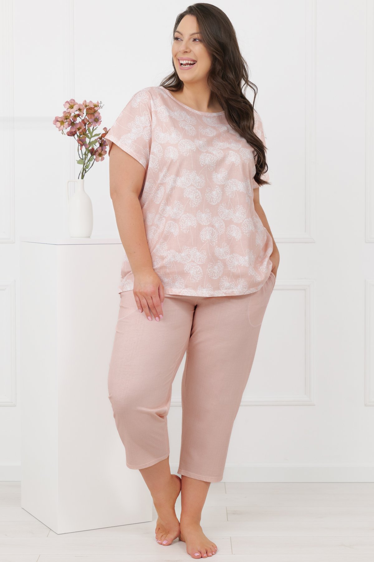 Horní díl má volnější střih a elegantní lodičkový výstřih, který působí lehce a přirozeně. Motiv pampelišek dodává modelu něžný detail, aniž by narušoval jeho minimalistický charakter. Kalhoty ve 3/4 délce mají klasickou linii a praktické kapsy, které zvyšují komfort při nošení. Přírodní bavlna je prodyšná, měkká a vhodná pro celoroční použití. Pyžamo se příjemně nosí při spánku i během domácího odpočinku.