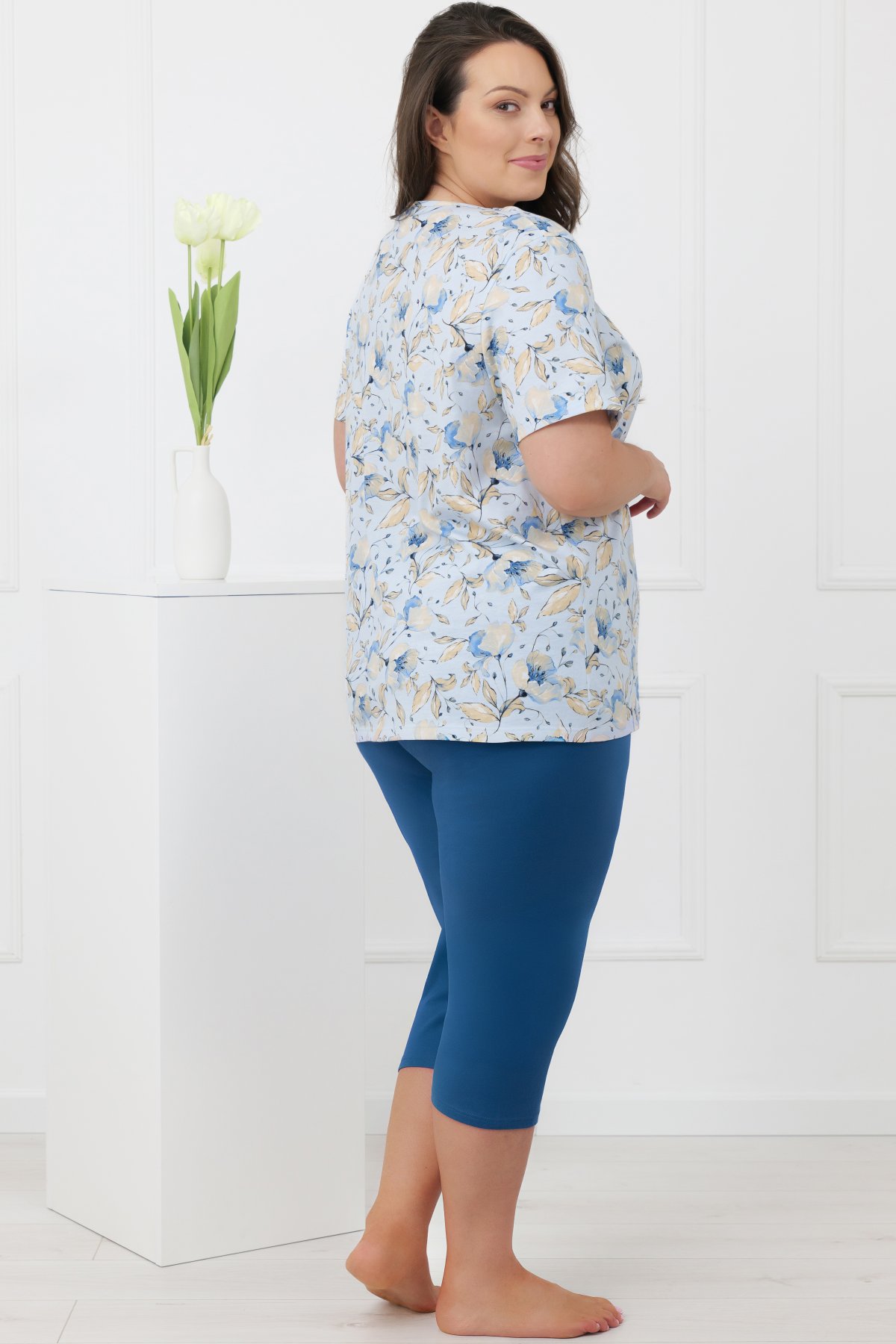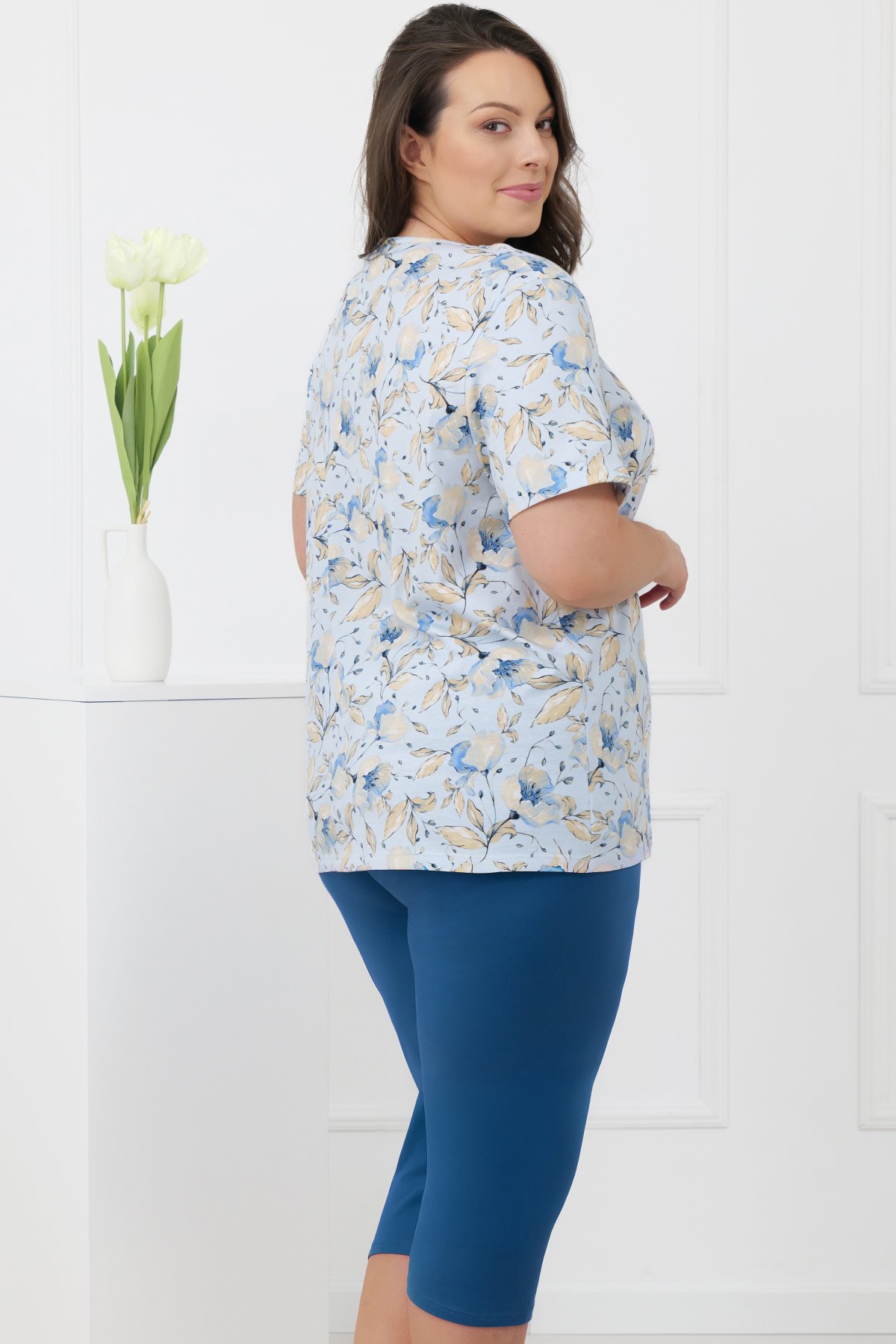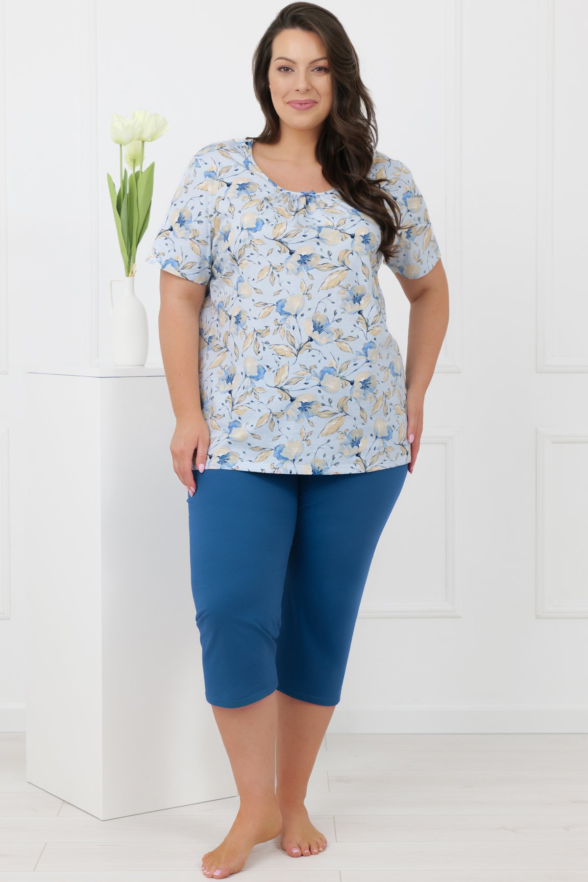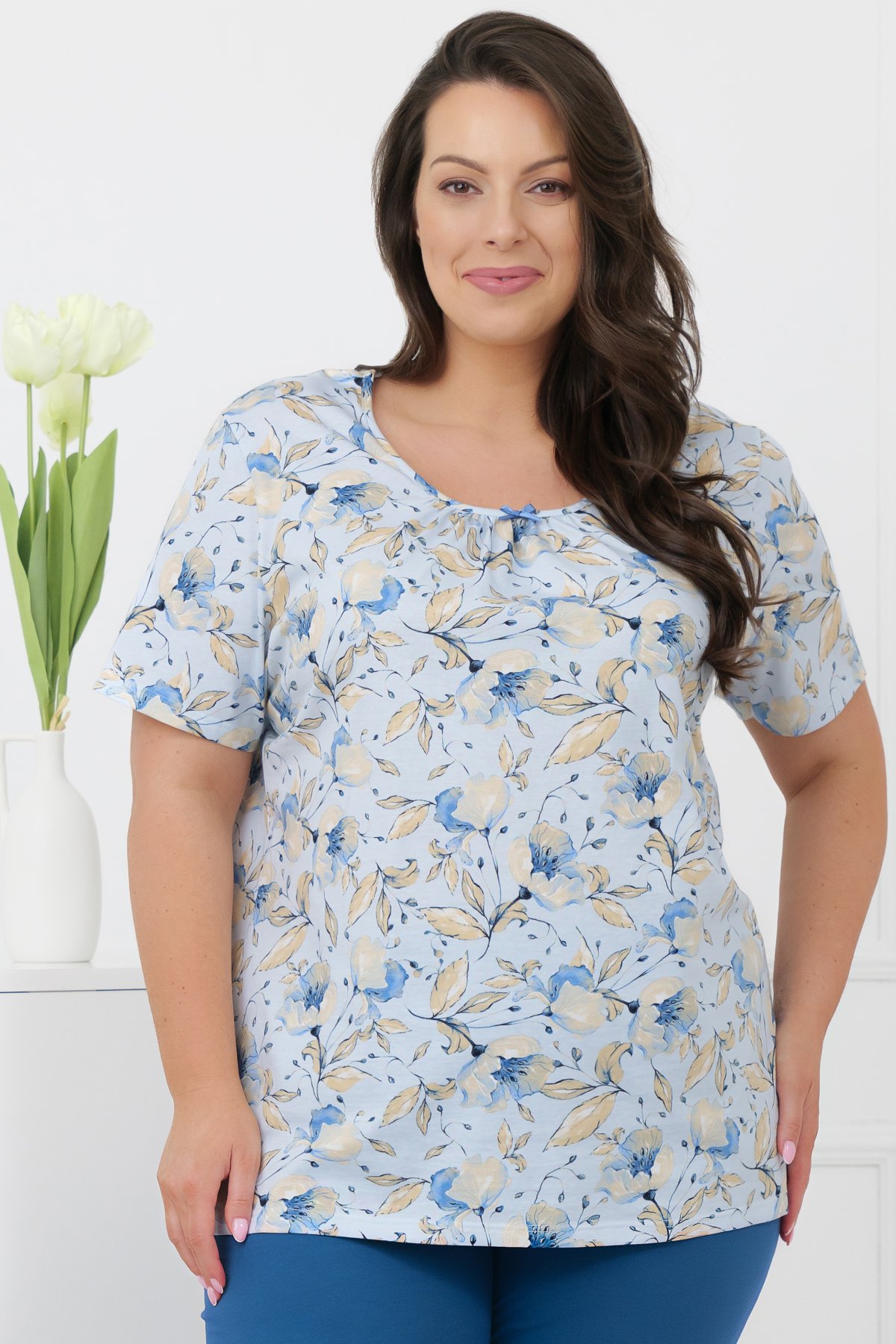 Horní díl zdobí jemný květinový motiv v pastelových tónech, který působí lehce a klidně. Kulatý výstřih s decentním řasením a malou mašličkou dodává modelu ženský detail. Krátké rukávy zvyšují univerzálnost – pyžamo je vhodné po celý rok. Spodní díl tvoří jednobarevné kalhoty s pružnou gumou v tunýlku. Pas netlačí a pohodlně se přizpůsobí.