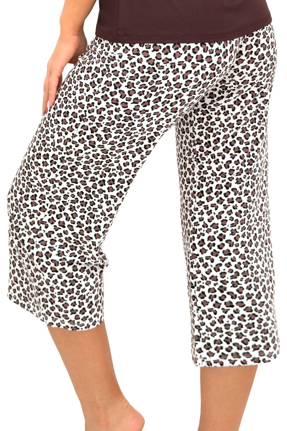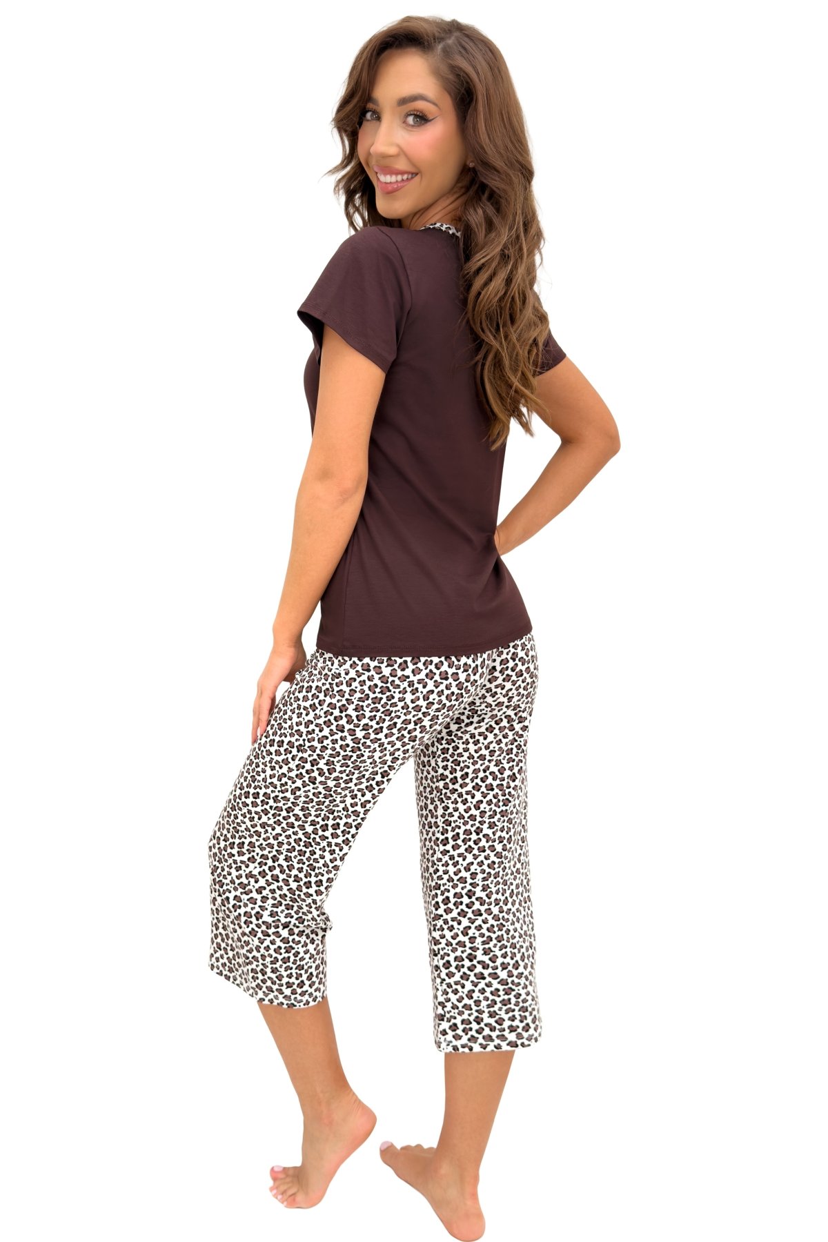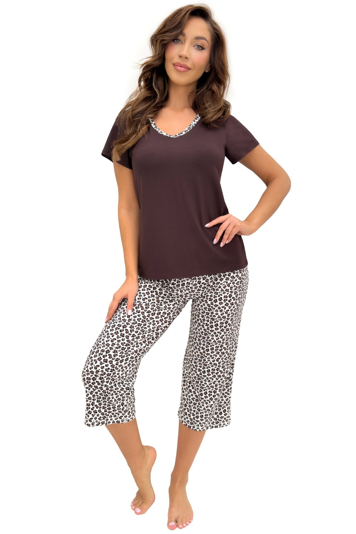 Halenka v odstínu čokoládově hnědé je ušitá z měkké viskózy s příměsí elastanu, díky čemuž je příjemná na dotek, lehce pružná a dobře se přizpůsobí postavě. Krátký rukáv a výstřih do „V“ dodávají modelu ženský, uvolněný charakter. Kalhoty v efektním zvířecím vzoru jsou vyrobené z prodyšné bavlny a mají klasický střih s pohodlnou 3/4 délkou. Celek působí harmonicky a je ideální jak na spaní, tak na domácí relax.