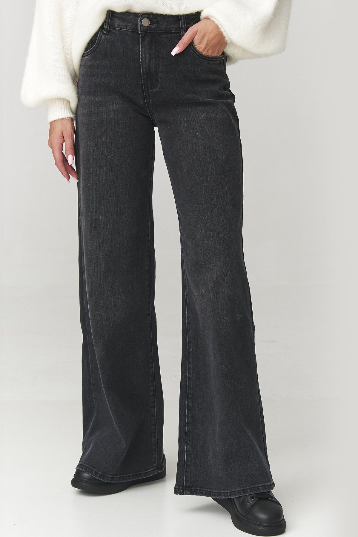 Dámské baggy džíny v černé barvě přinášejí moderní pojetí klasických džínů v trendy stylu baggy. Široké nohavice dodávají outfitu odvážný, městský charakter, zatímco měkký denim zajišťuje pohodlí i při celodenním nošení. Kalhoty se perfektně přizpůsobí postavě v pase, od boků se volně rozšiřují, čímž vytvářejí stylově nedbalý, ale promyšlený look. Díky univerzálnímu designu je lze snadno kombinovat – skvěle vypadají s crop topem, oversize mikinou i elegantní košilí. Tento model je ideální pro ženy, které sledují trendy a chtějí do svého šatníku vnést dávku originality a sebevědomého stylu.