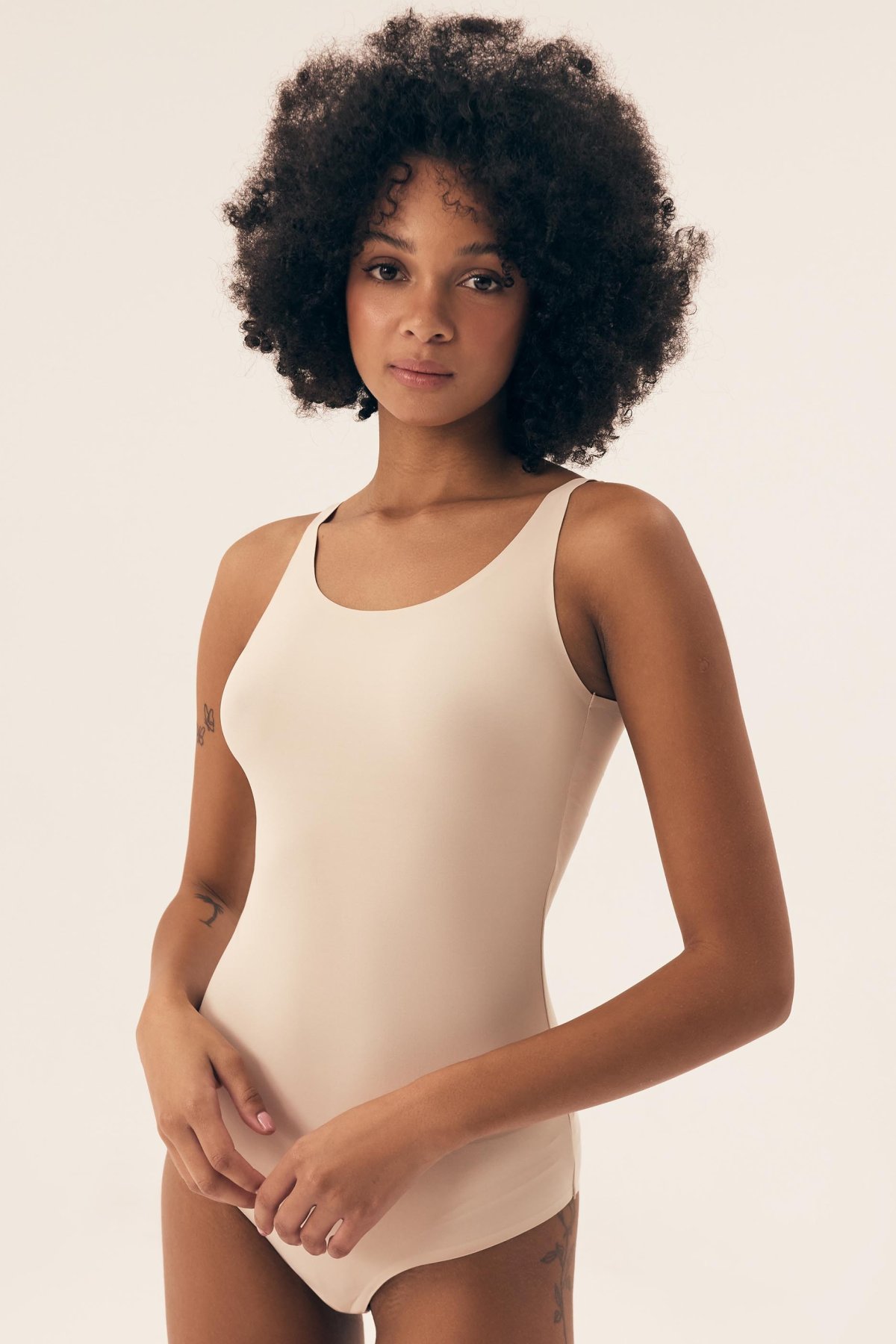Přední i zadní část doplňuje jemně zaoblený výstřih, který působí čistě a ženský charakter modelu zůstává střídmý. Úzká ramínka s možností nastavení usnadňují doladění podle potřeby. Přiléhavé provedení podtrhuje hladký vzhled bez rušivých detailů. Složení materiálu: 90 % polyamid, 10 % elastan.