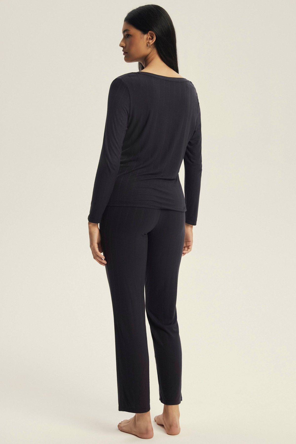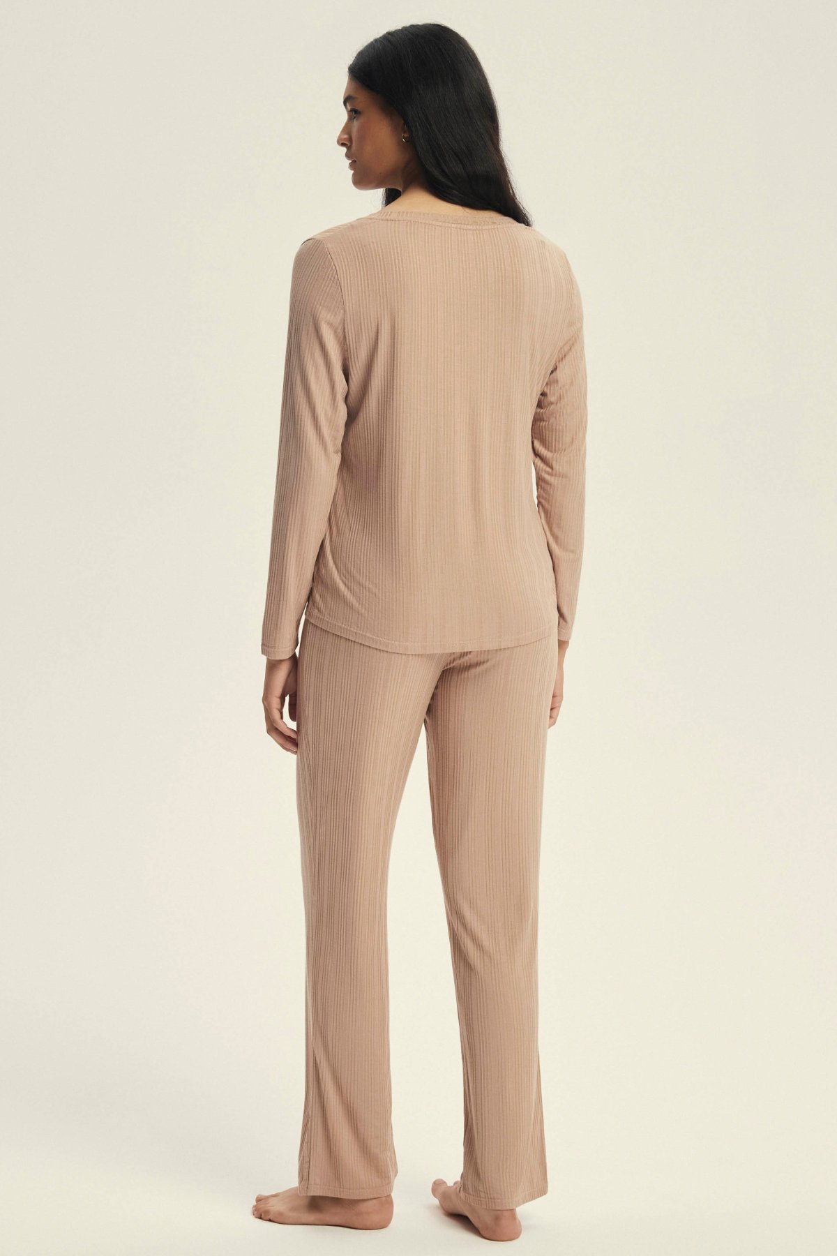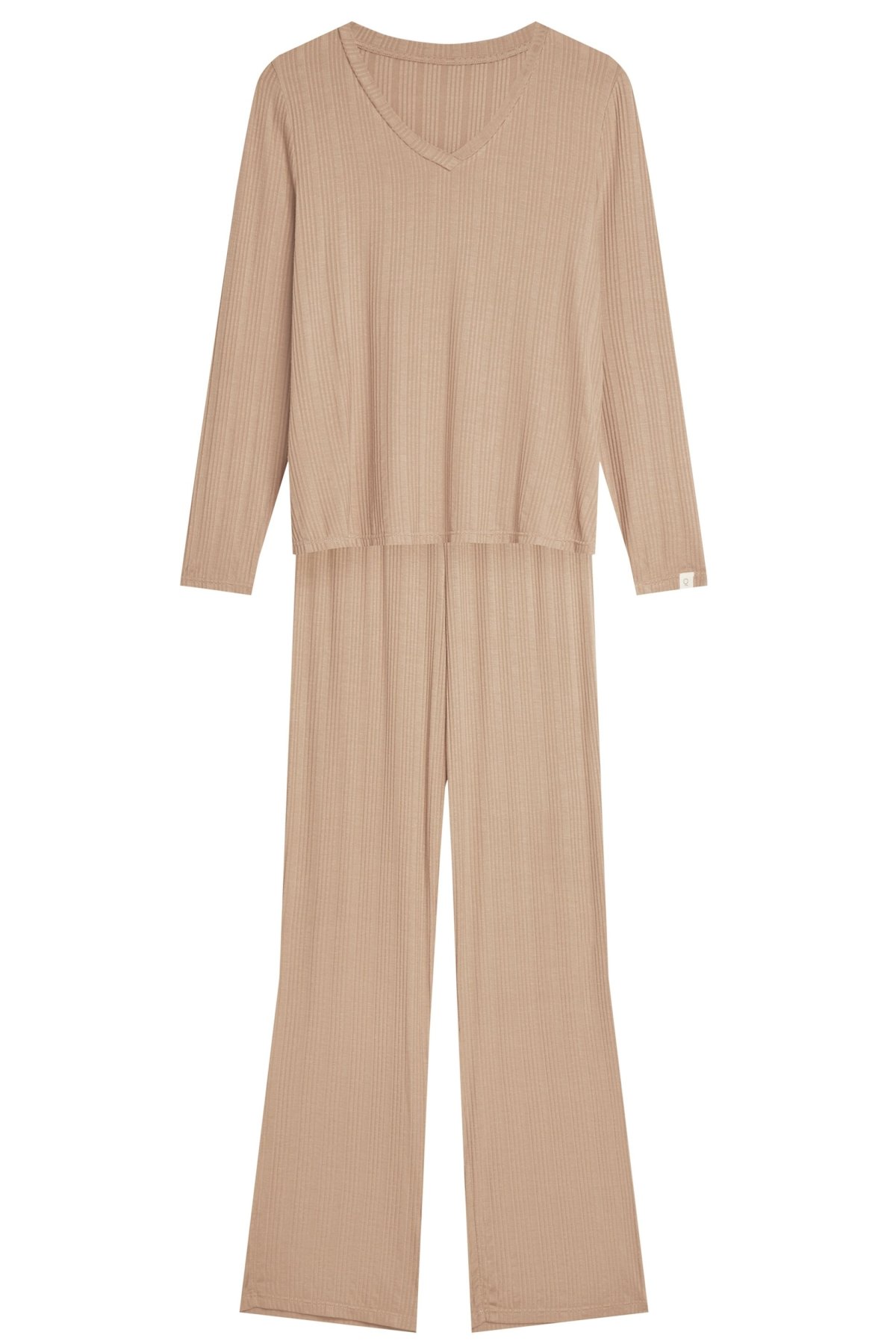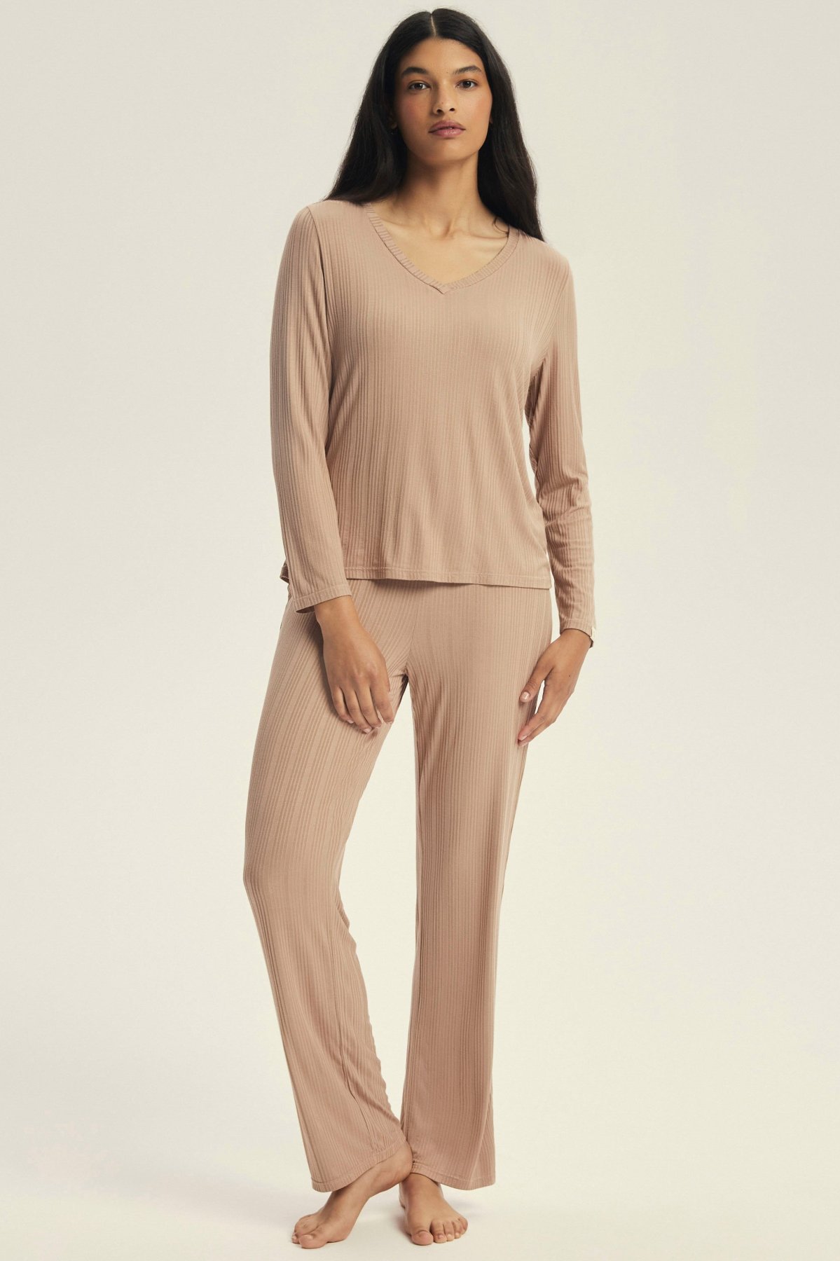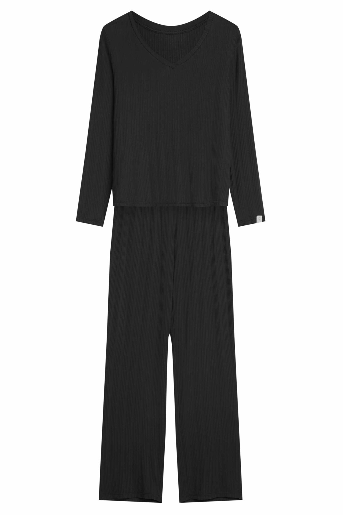 Dámské pyžamo Jenius ztělesňuje klid a jemnost večerní pohody. Vyrobené z měkké, lehce žebrované viskózy, příjemně přiléhá k tělu a poskytuje dokonalý komfort při spánku i odpočinku. Horní díl s výstřihem do „V“ a dlouhými rukávy působí decentně a žensky. Dlouhé kalhoty s volným střihem zajišťují naprostou volnost pohybu. Samozřejmostí je pohodlný pružný pas. Materiál s příměsí elastanu se jemně natahuje, díky čemuž si pyžamo zachovává tvar i po mnoha praních. Ideální volba pro ženy, které si chtějí dopřát pocit luxusu a pohodlí během každého večera i rána.