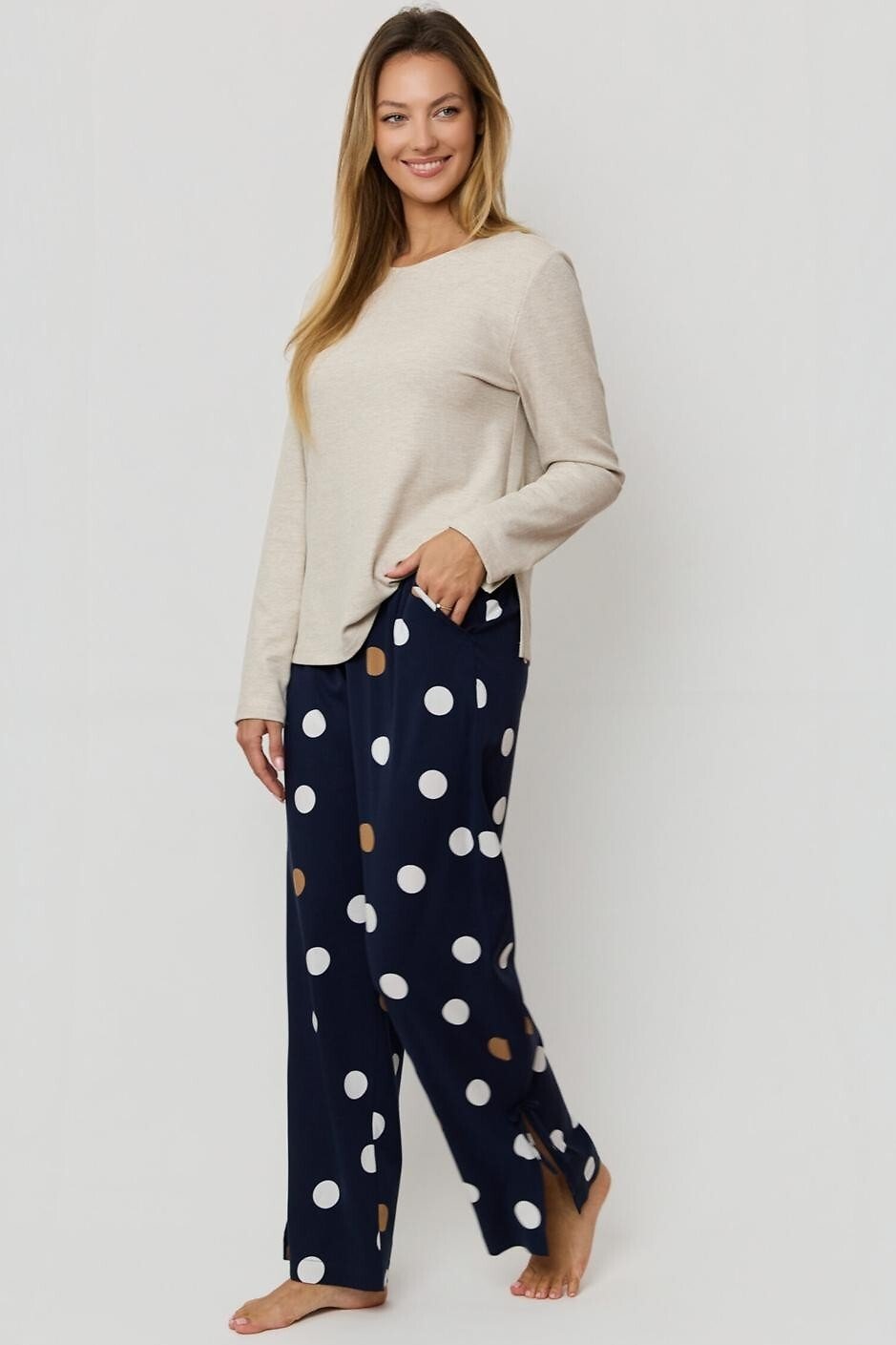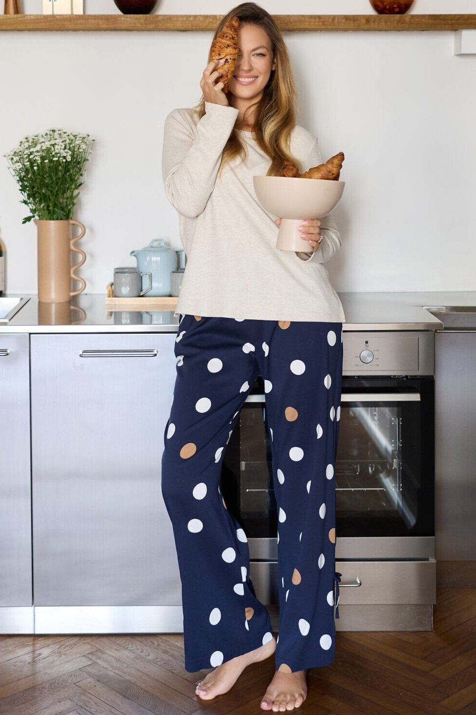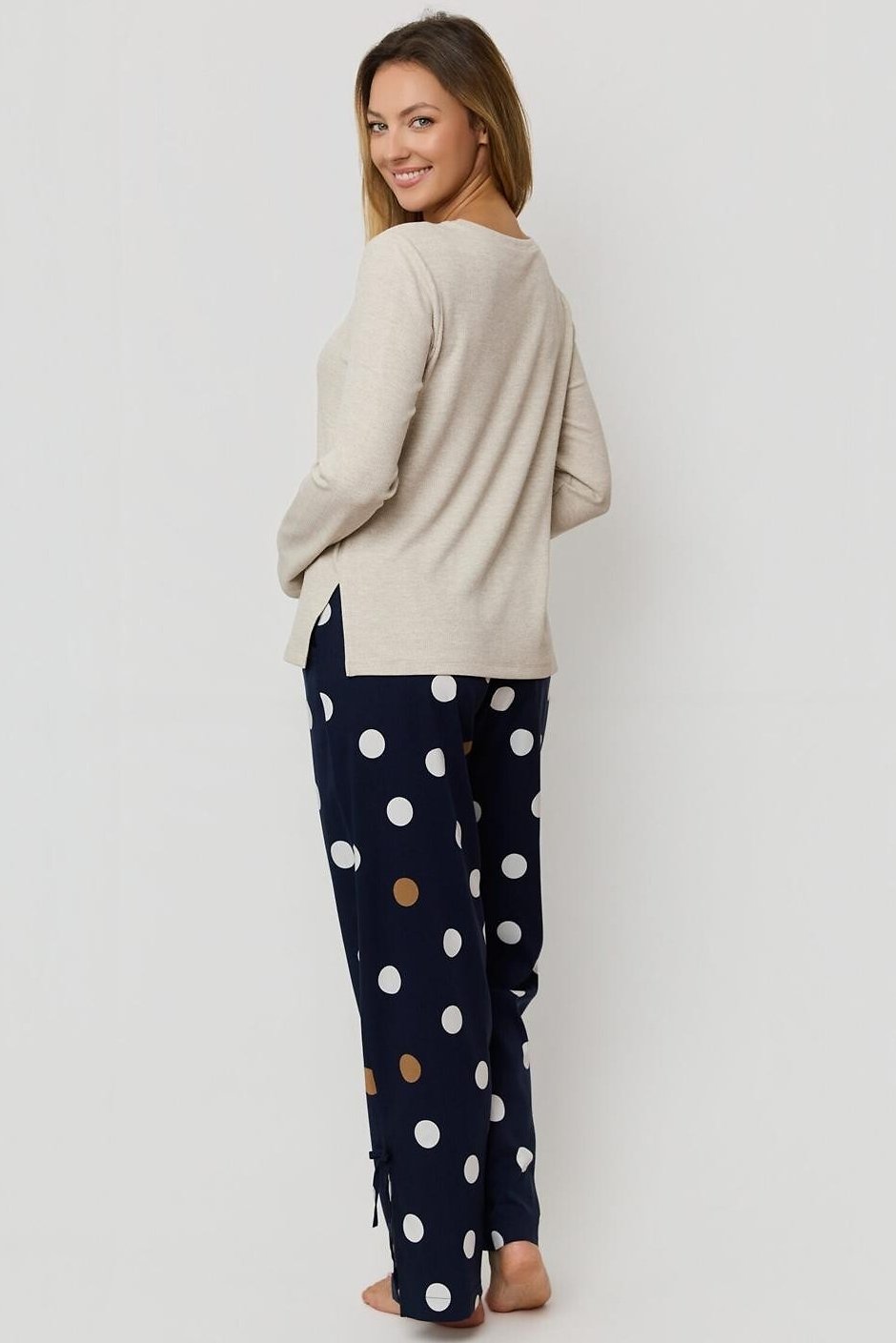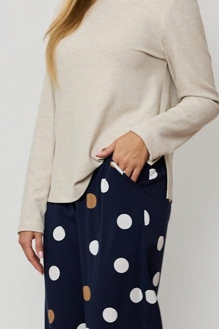 Dámské pyžamo Oceane spojuje pohodlí s jemným, ženským stylem. Měkké žebrované tričko z viskózy doplňují volné kalhoty s puntíkovým vzorem, které dodávají soupravě hravý nádech. Díky kapsám a detailům v podobě mašliček na nohavicích působí pyžamo nejen stylově, ale i prakticky. Ideální volba pro klidný spánek i domácí pohodu.