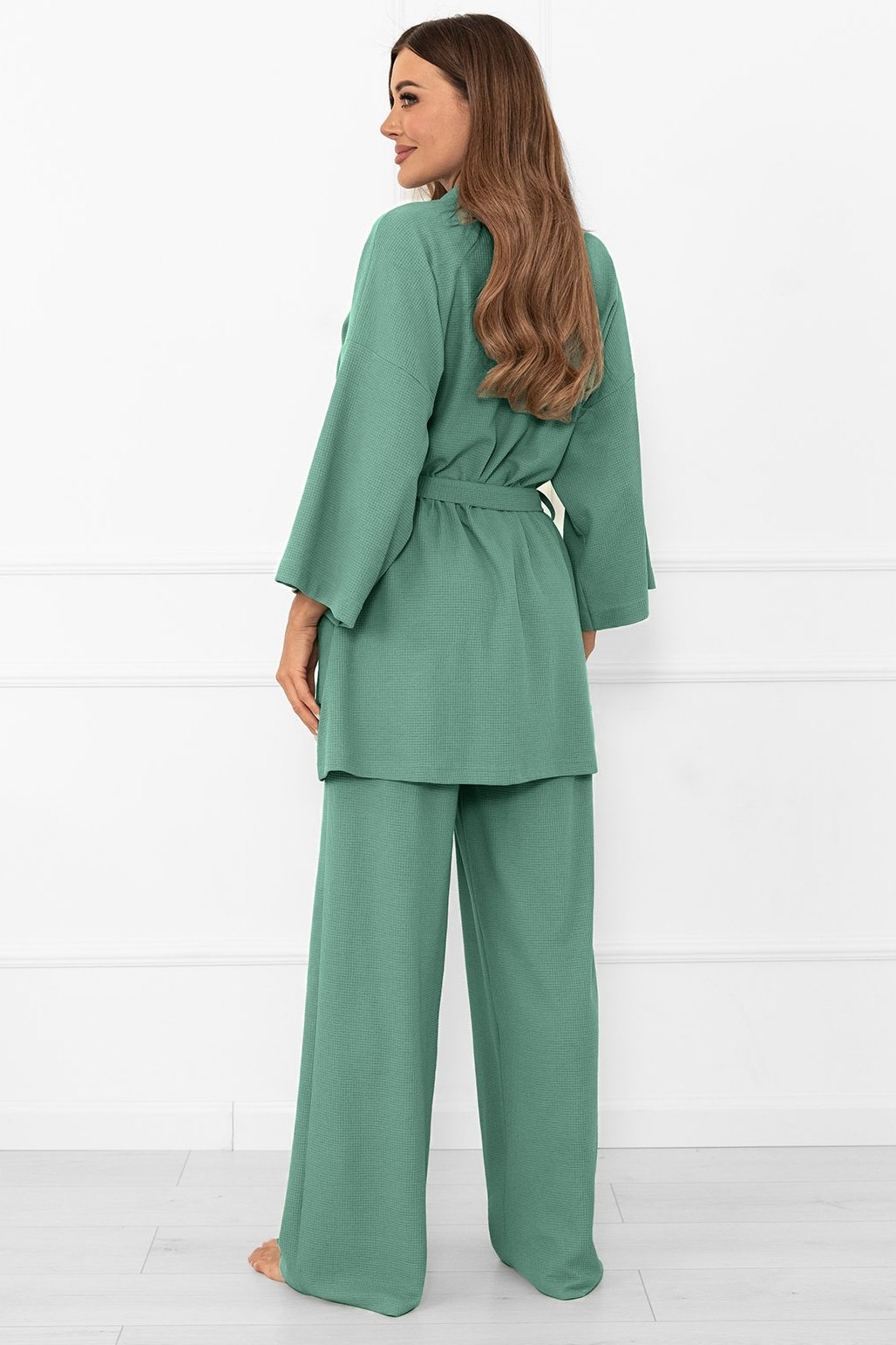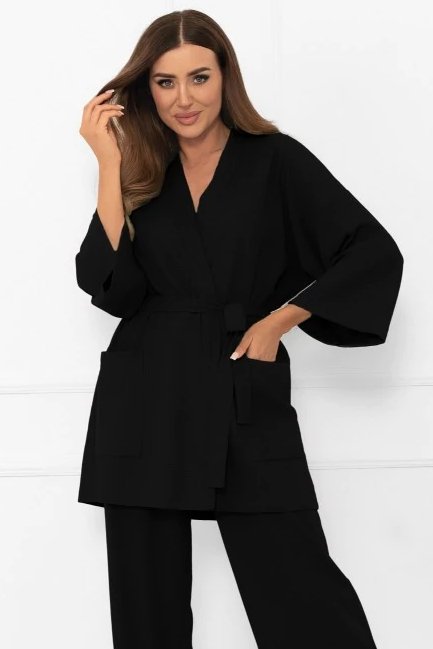 Dámské kimono Bono je ideálním spojením elegance a pohodlí. Díky volnému střihu a pásku na zavazování se snadno přizpůsobí postavě a podtrhne ženskou siluetu. Široké rukávy ve 3/4 délce dodávají ležérní, ale sofistikovaný vzhled, zatímco praktické kapsy po stranách zvyšují komfort při nošení. Kimono je ušité z lehké a prodyšné tkaniny, která je příjemná na dotek a vhodná jak pro domácí pohodu, tak pro relaxační chvíle po koupeli. Stylový design se skvěle kombinuje s noční košilkou či pyžamem, ale můžete ho nosit i samostatně jako elegantní domácí oděv. Ideální volba pro ženy, které chtějí vypadat atraktivně a zároveň se cítit maximálně pohodlně.