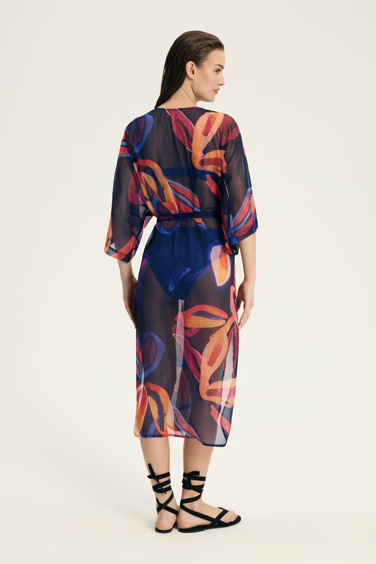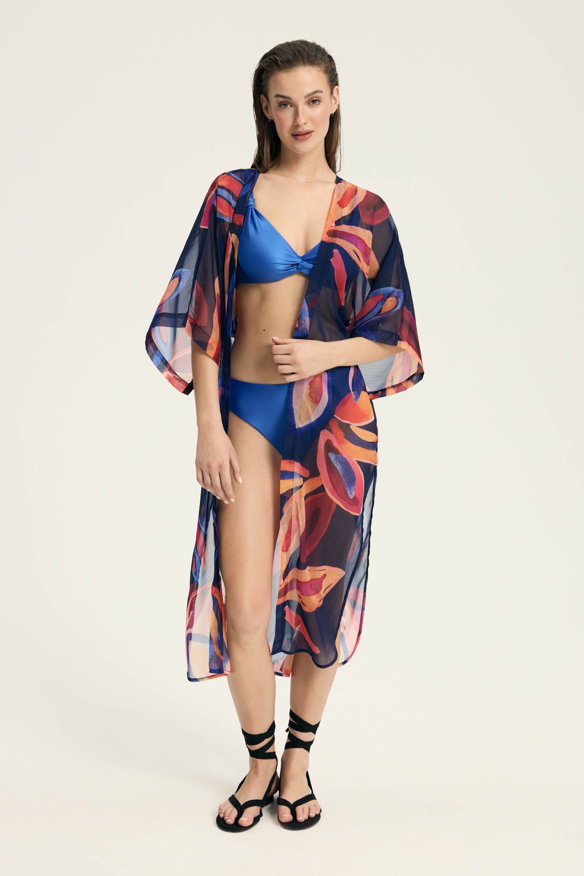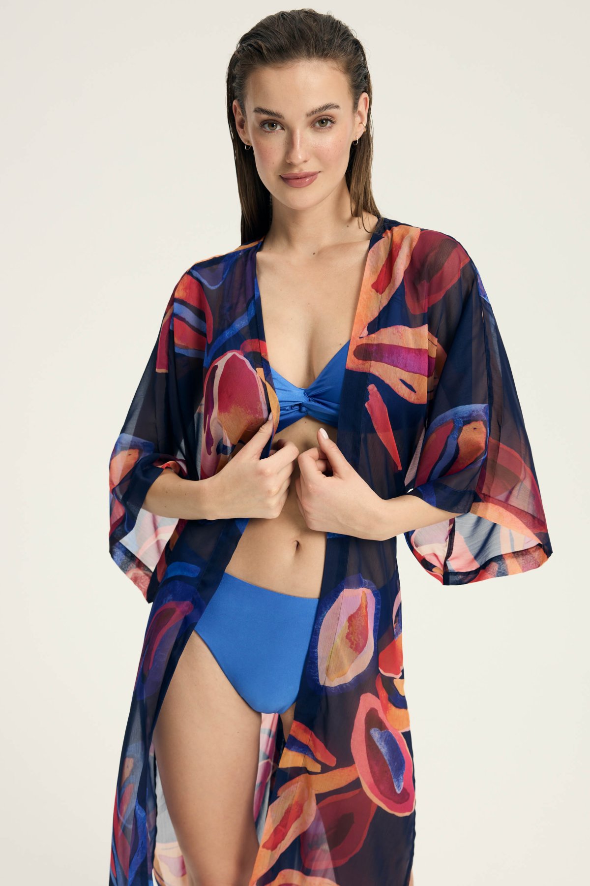Dlouhé kimono působí výrazně a elegantně zároveň. Průsvitný materiál v kombinaci s barevným abstraktním potiskem vytváří efektní letní model, který vynikne u vody i jako součást resort outfitu. Volnější rukávy a splývavý střih dodávají celku lehkost, zatímco pásek v pase umožňuje upravit siluetu podle potřeby. Díky vzdušnému provedení se tento kousek hodí jako stylový přehoz přes plavky i jako výrazná vrstva pro letní look.