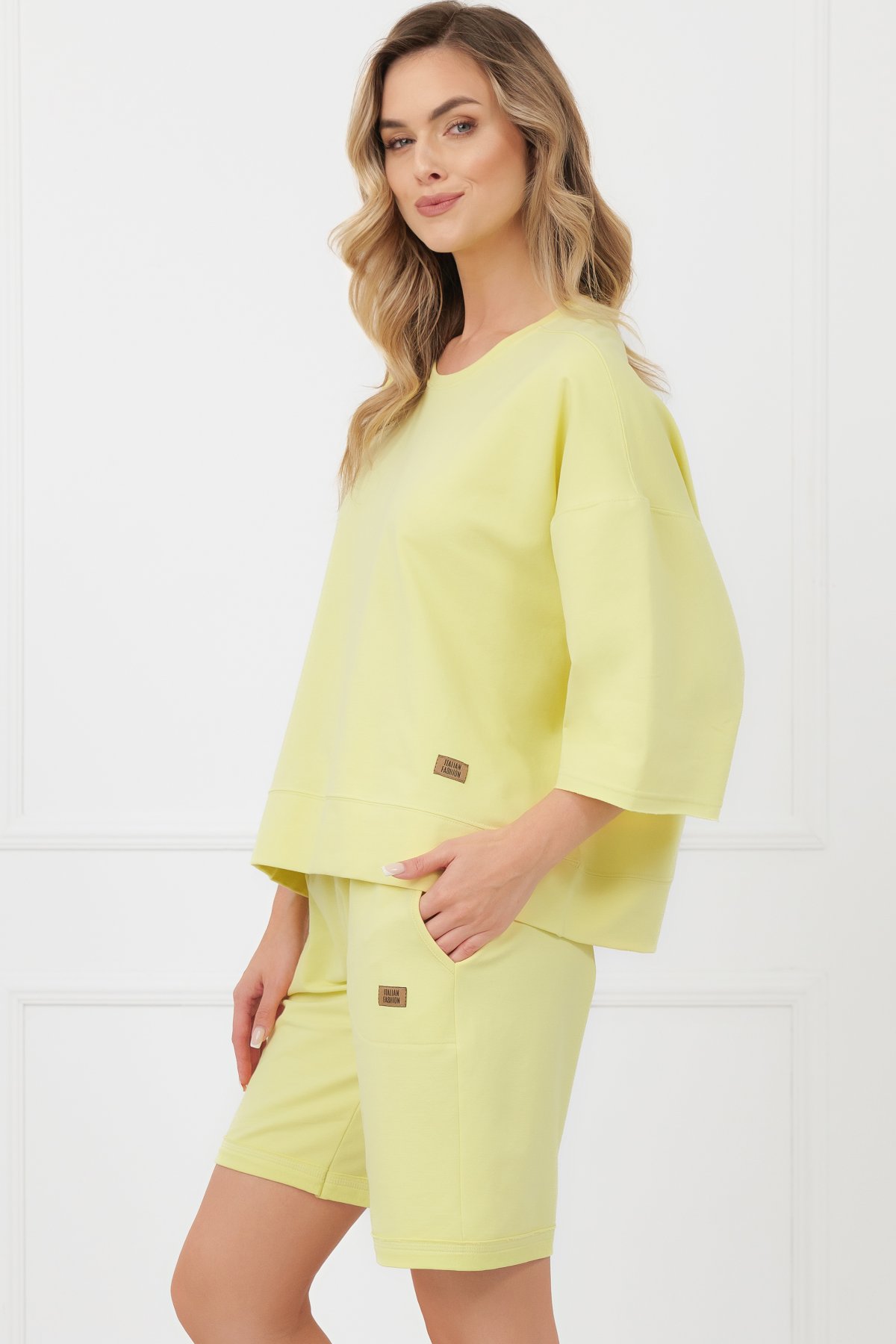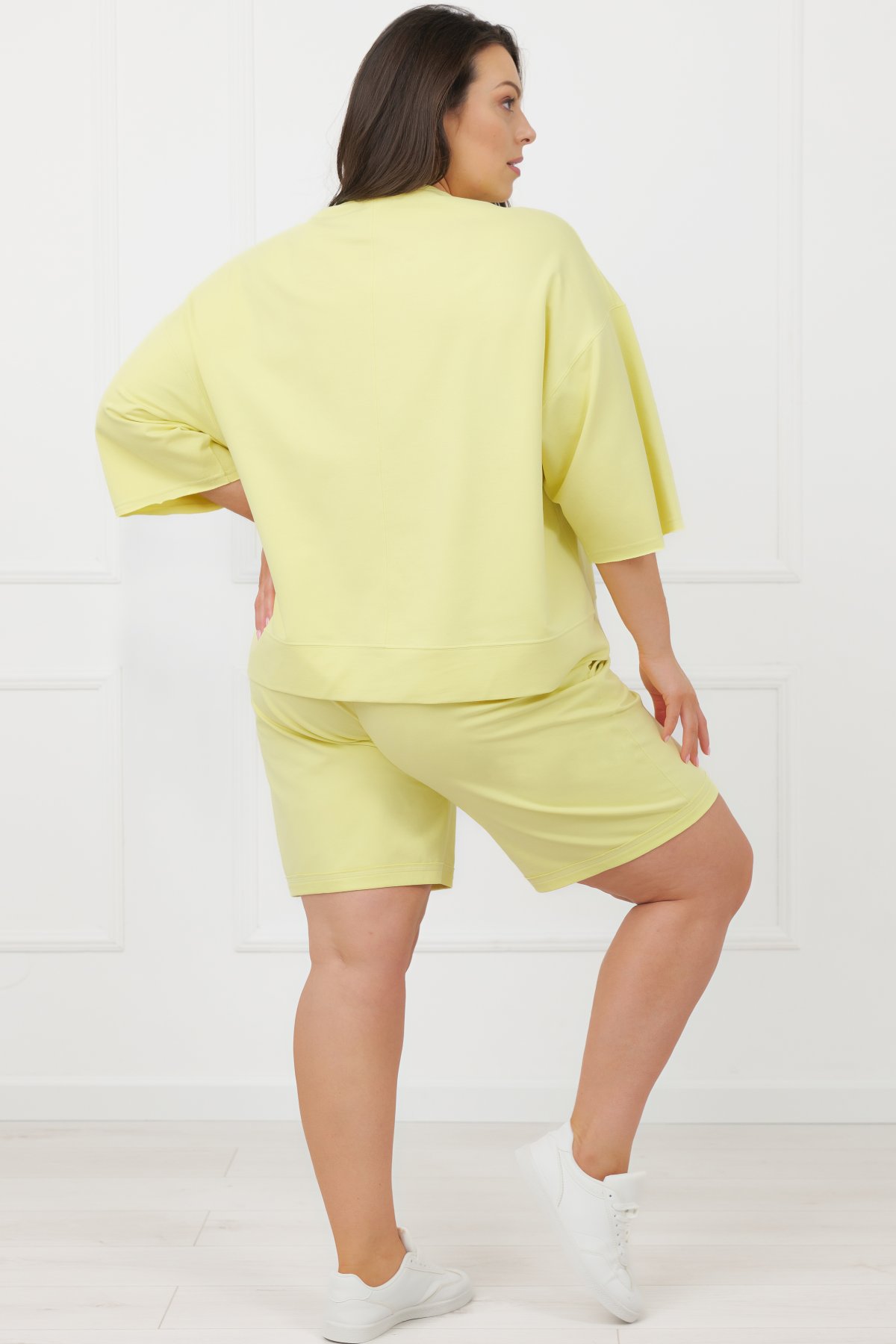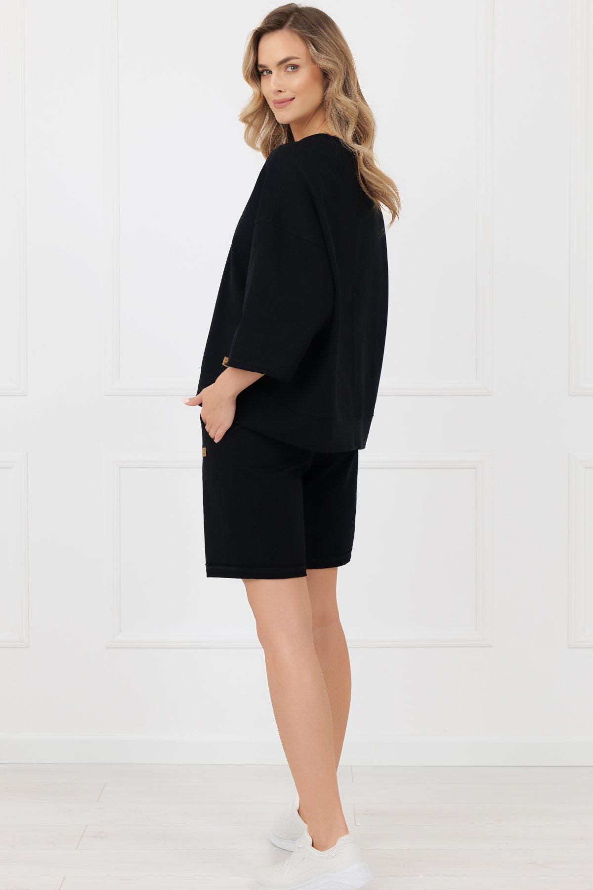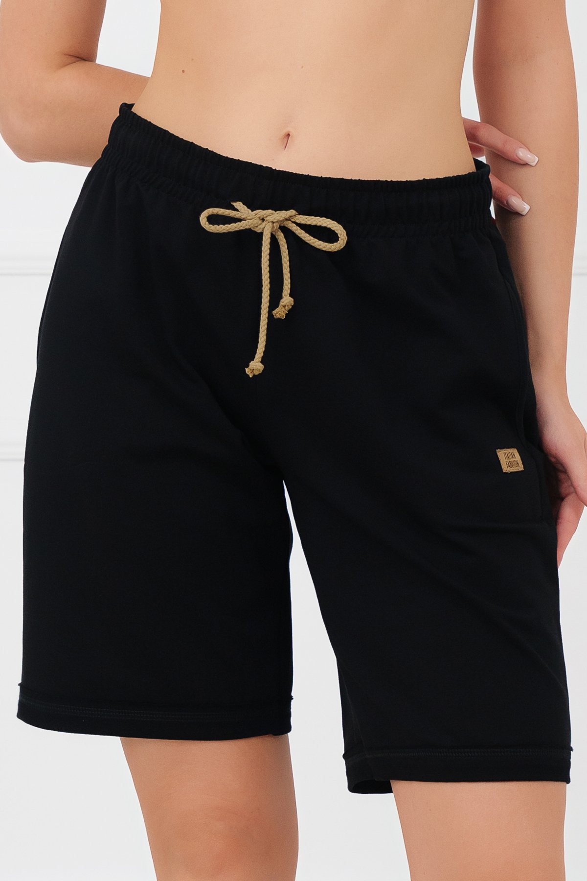 Silnější bavlněný úplet s příměsí elastanu je měkký, pružný a dobře drží tvar. Díky vyšší gramáži působí materiál pevněji a kvalitně, přesto zůstává příjemný na těle. Šortky mají čistou, jednoduchou linii doplněnou o praktické kapsy. Pas s pružnou gumou a šňůrkou umožňuje snadné přizpůsobení obvodu podle potřeby. Ozdobná plisa na nohavicích dodává modelu moderní, lehce sportovní vzhled. Díky o něco delší nohavičce je můžete nosit nejen doma, ale i ven – na procházku nebo běžné denní aktivity. Skvěle ladí s mikinou Kaori a vytvářejí pohodlný, stylově sladěný komplet.