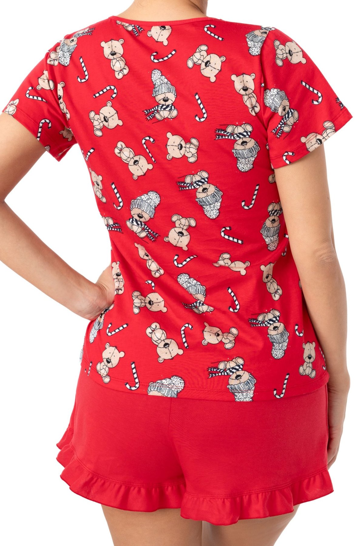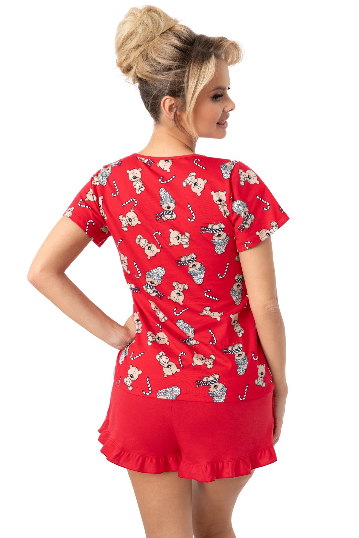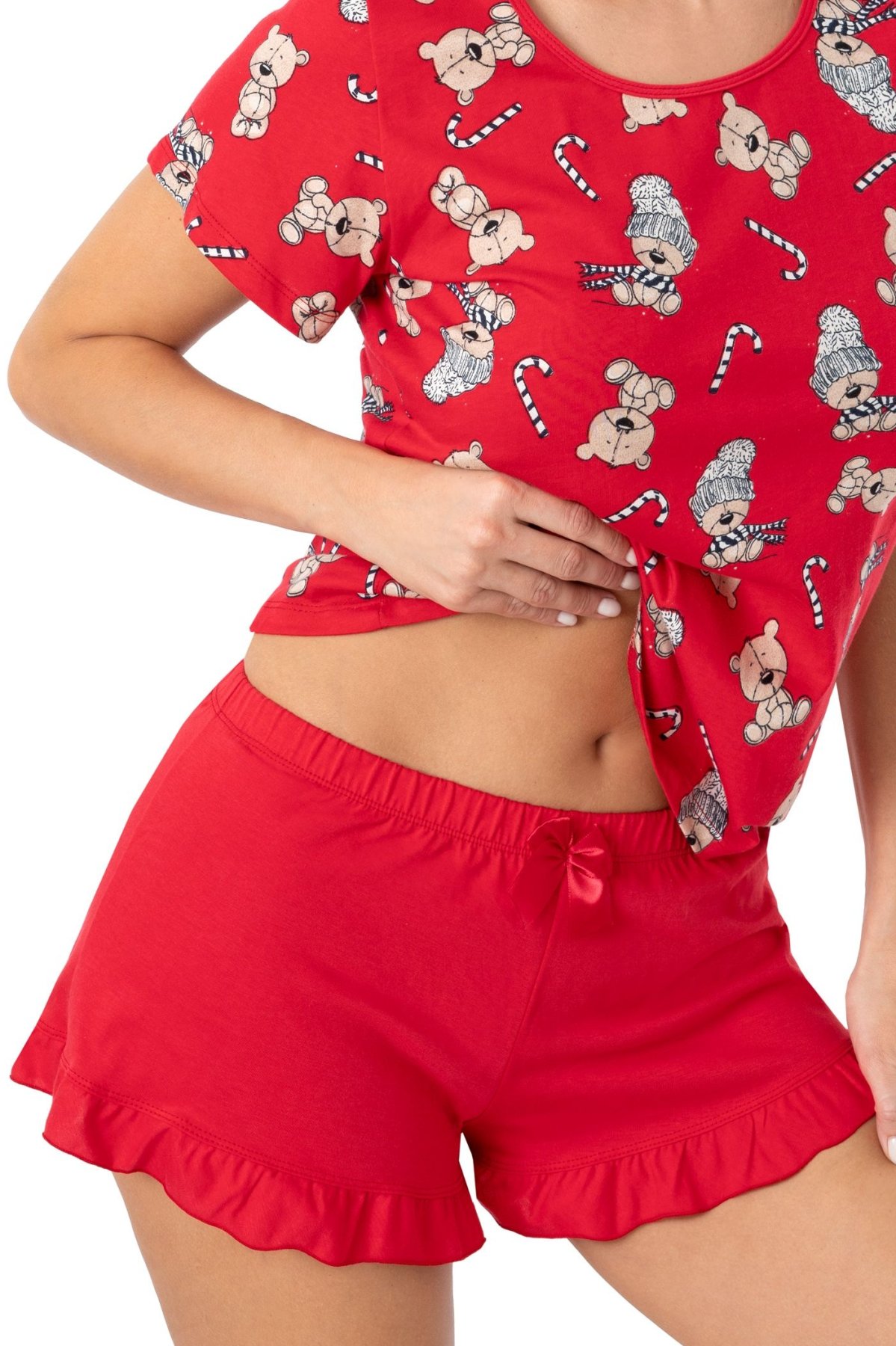 Vánoční dámské pyžamo Bear. Roztomilý styl a sváteční atmosféra v jednom. Vyrobené z měkké bavlny, poskytuje komfort během spánku i domácího lenošení. Tričko s krátkým rukávem a kulatým výstřihem působí ležérně a svěže, krátké šortky s jemnou volánkovou nohavičkou dodávají celku hravý a ženský půvab. Elastický pas s mašličkou nejen skvěle vypadá, ale také zaručuje pohodlné padnutí.